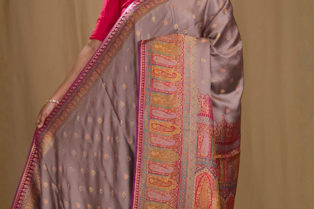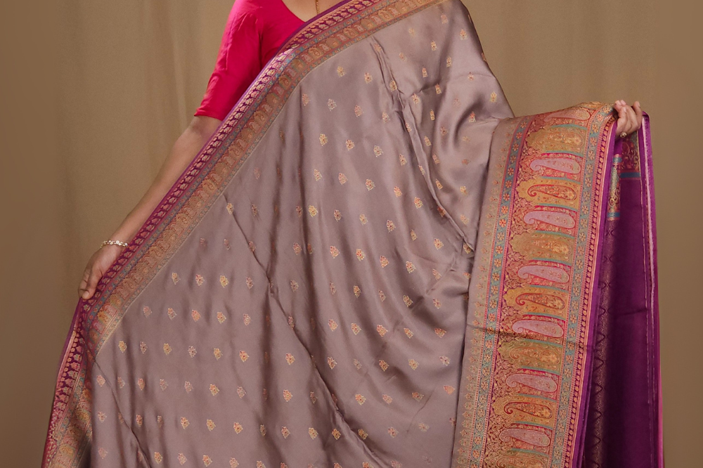 Grey Brown Pashmina Satin Saree