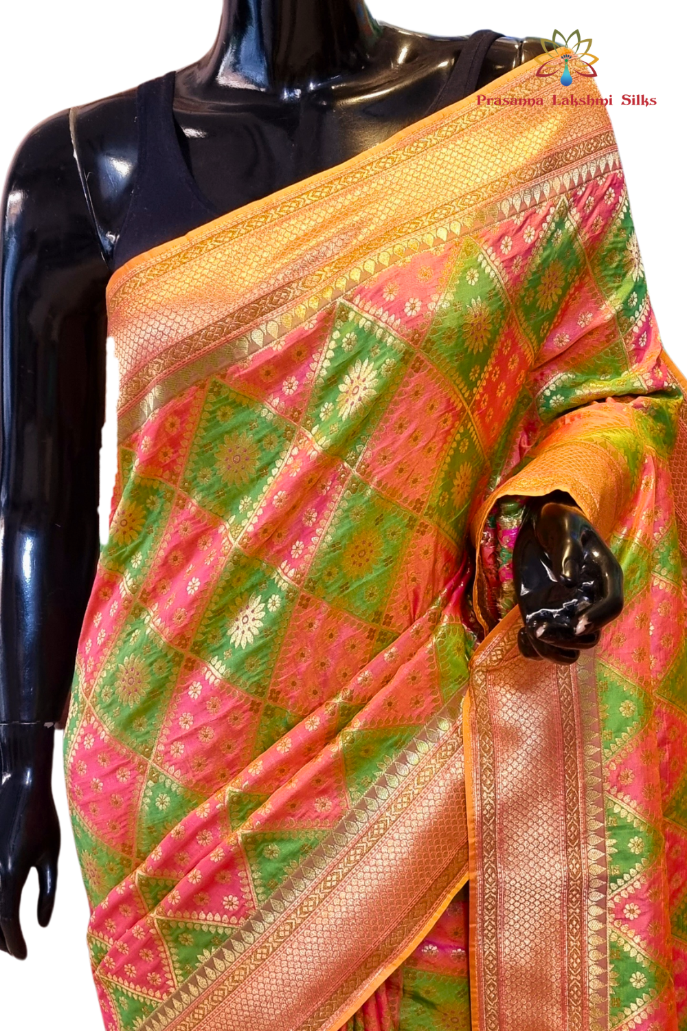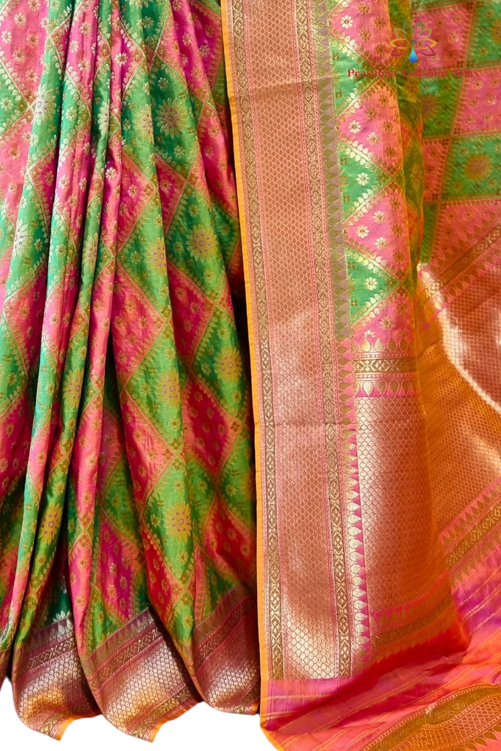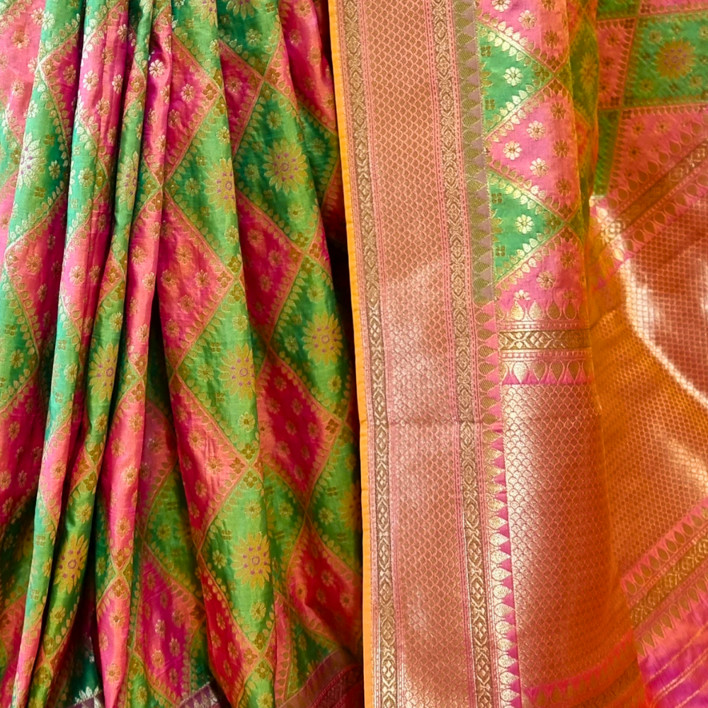 Experience the grandeur of our Semi Banarasi Saree, featuring an intricate zari-woven brocade design, contrast zari-woven borders, and a rich brocade pallu paired with contrast blouse....