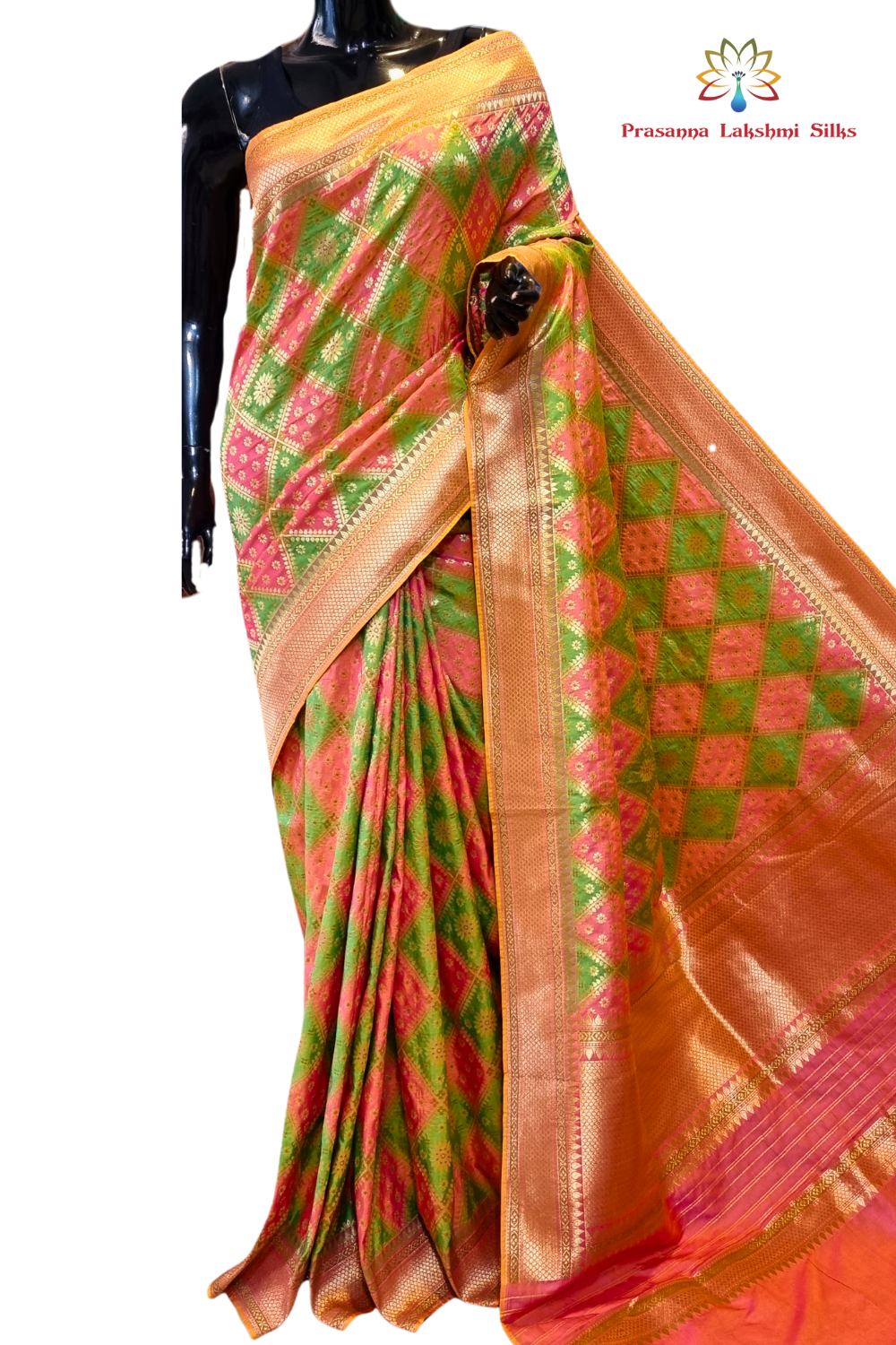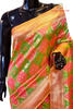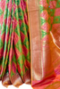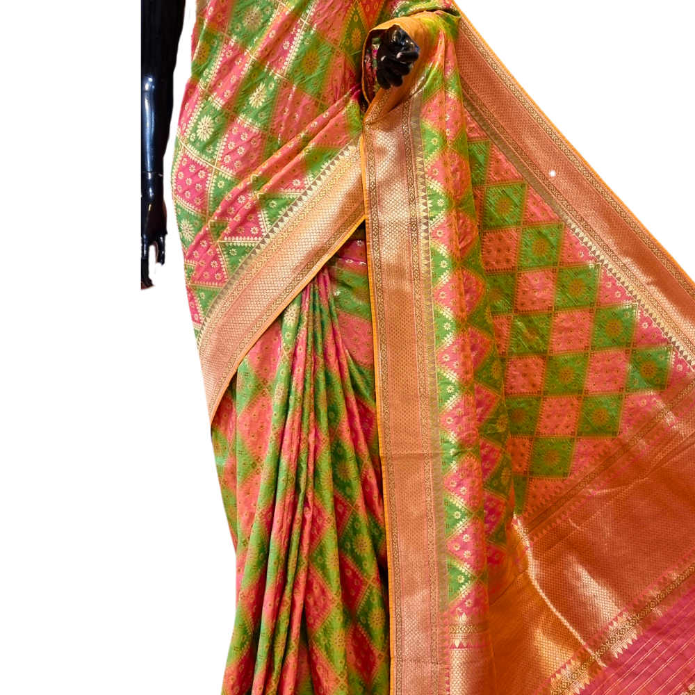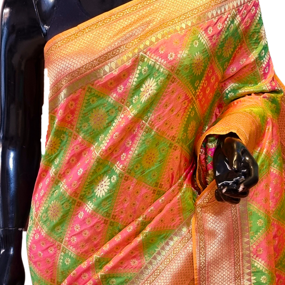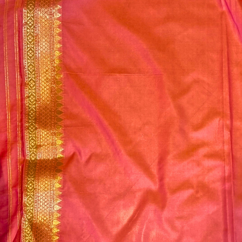 Experience the grandeur of our Semi Banarasi Saree, featuring an intricate zari-woven brocade design, contrast zari-woven borders, and a rich brocade pallu paired with contrast blouse....