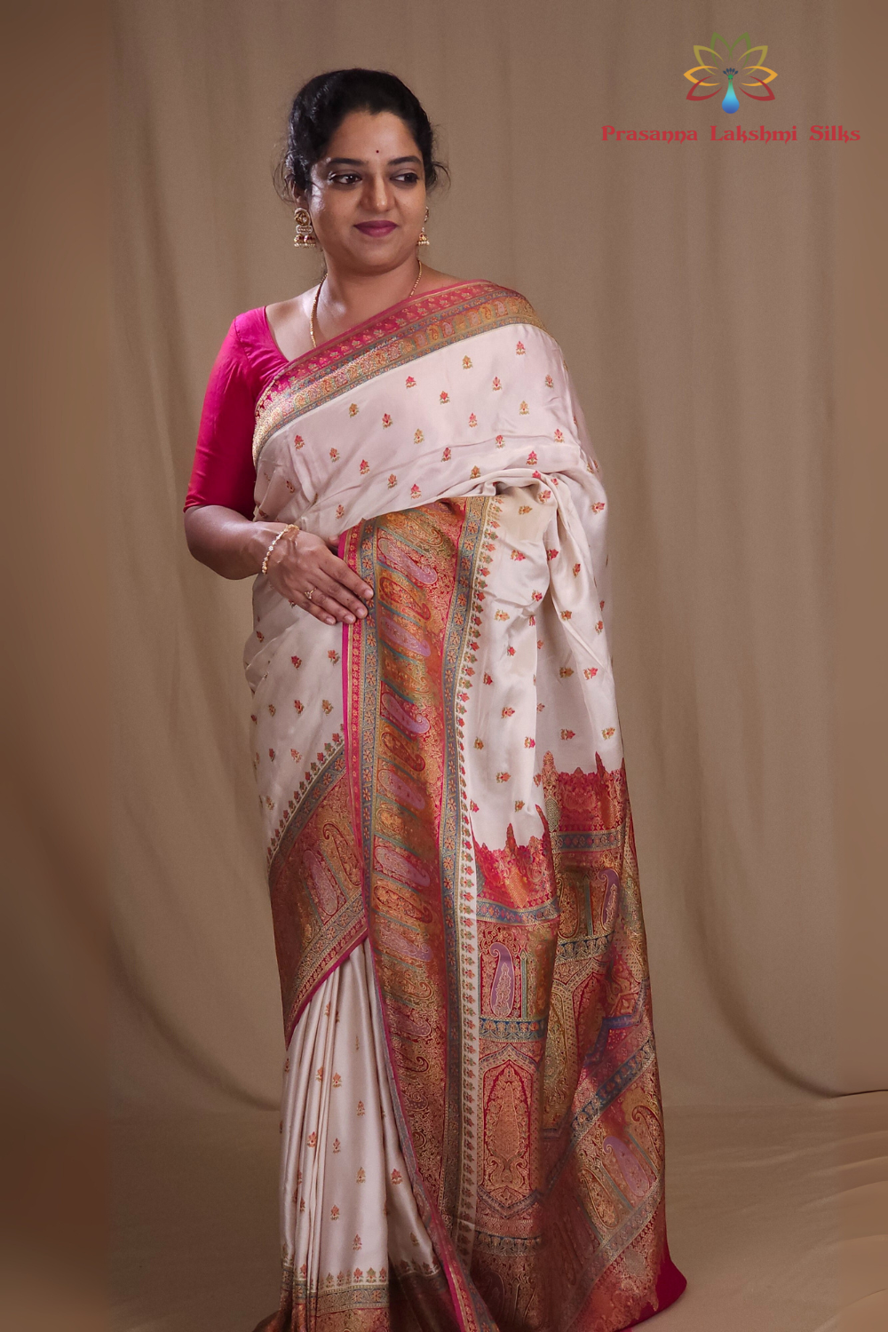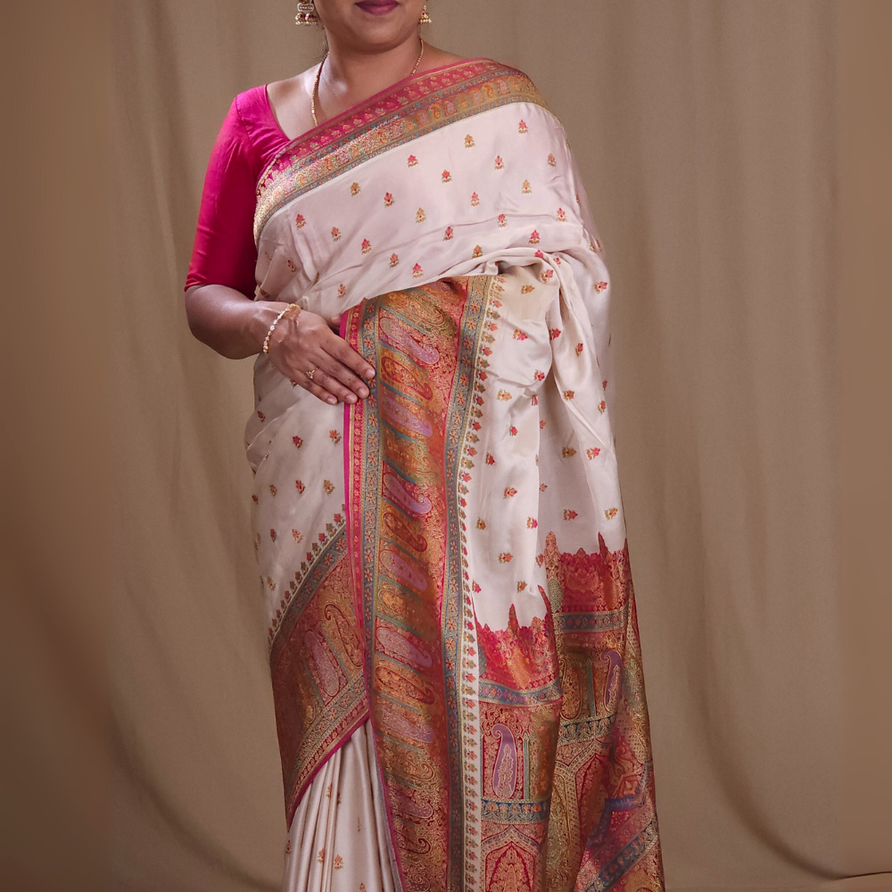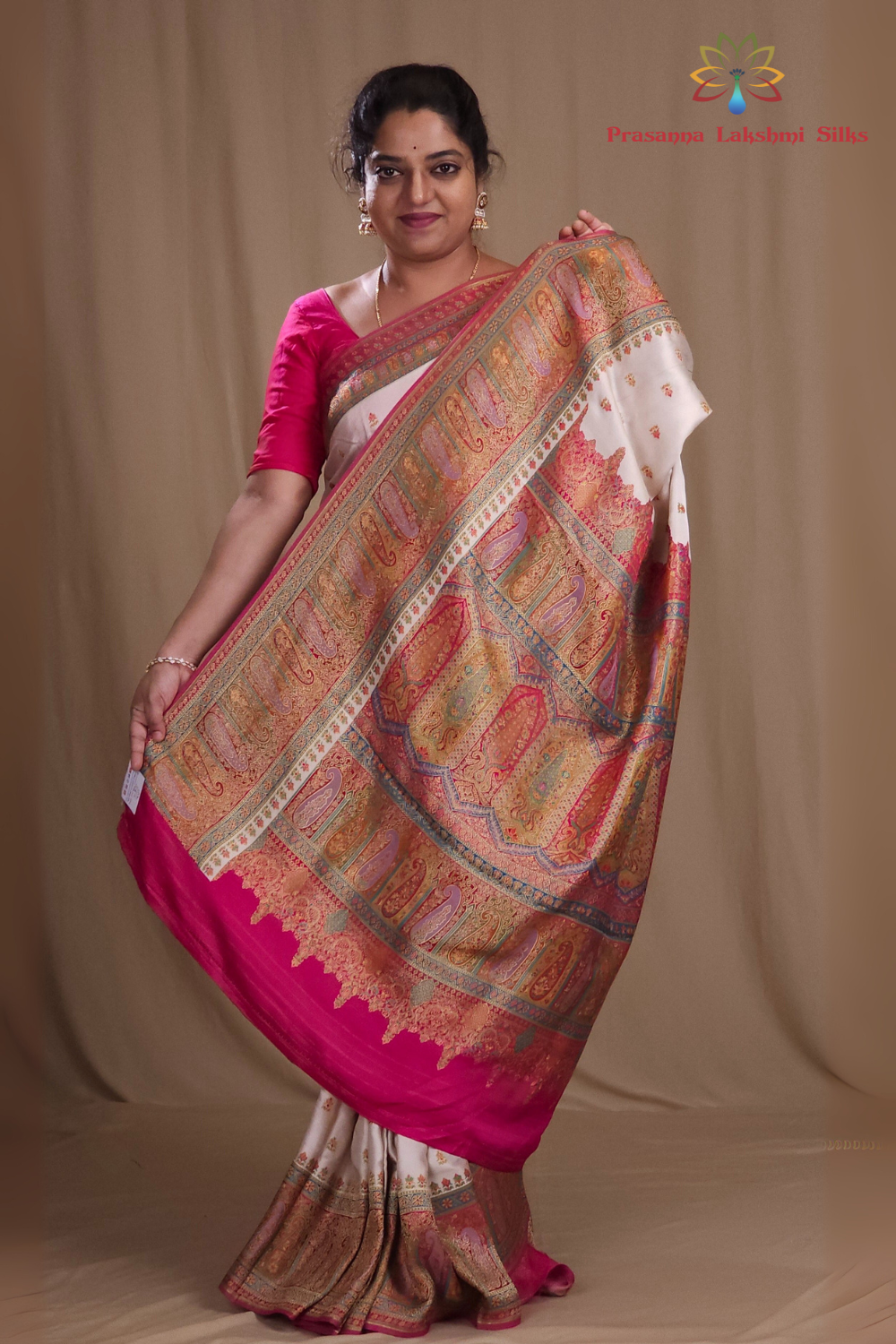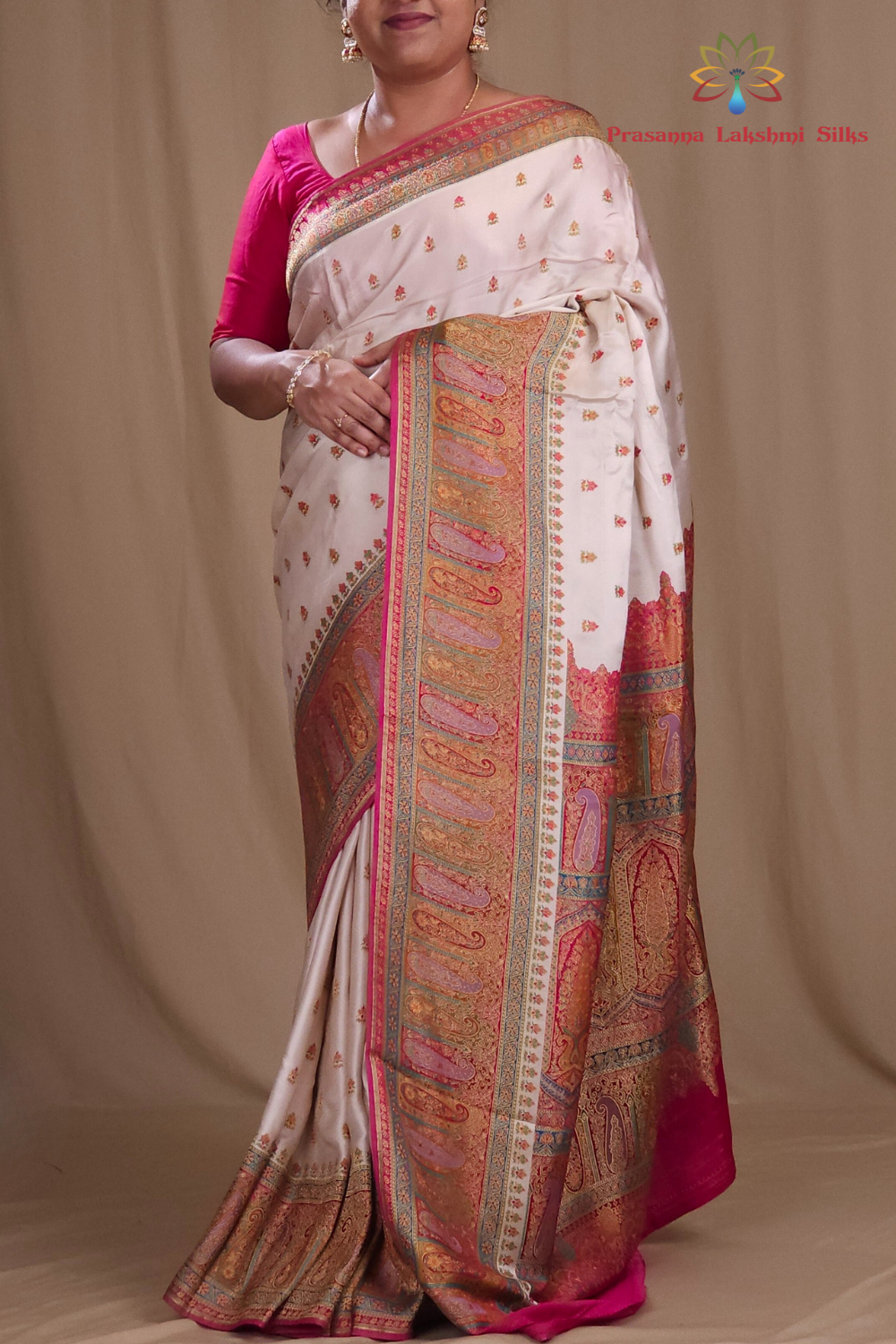 Exquisite Pashmina Satin Saree is adorned with allover meenakaari small thread-woven motifs that bring out timeless elegance. The saree is enhanced with rich meenakaari pashmina work borders and a luxuriously woven pashmina work pallu, .Paired with a contrast zari brocade blouse.....