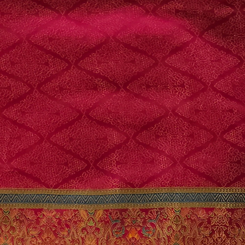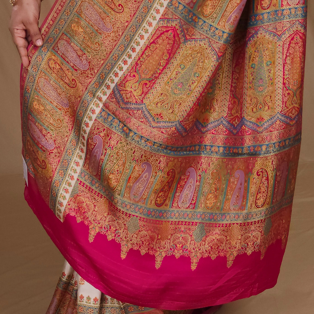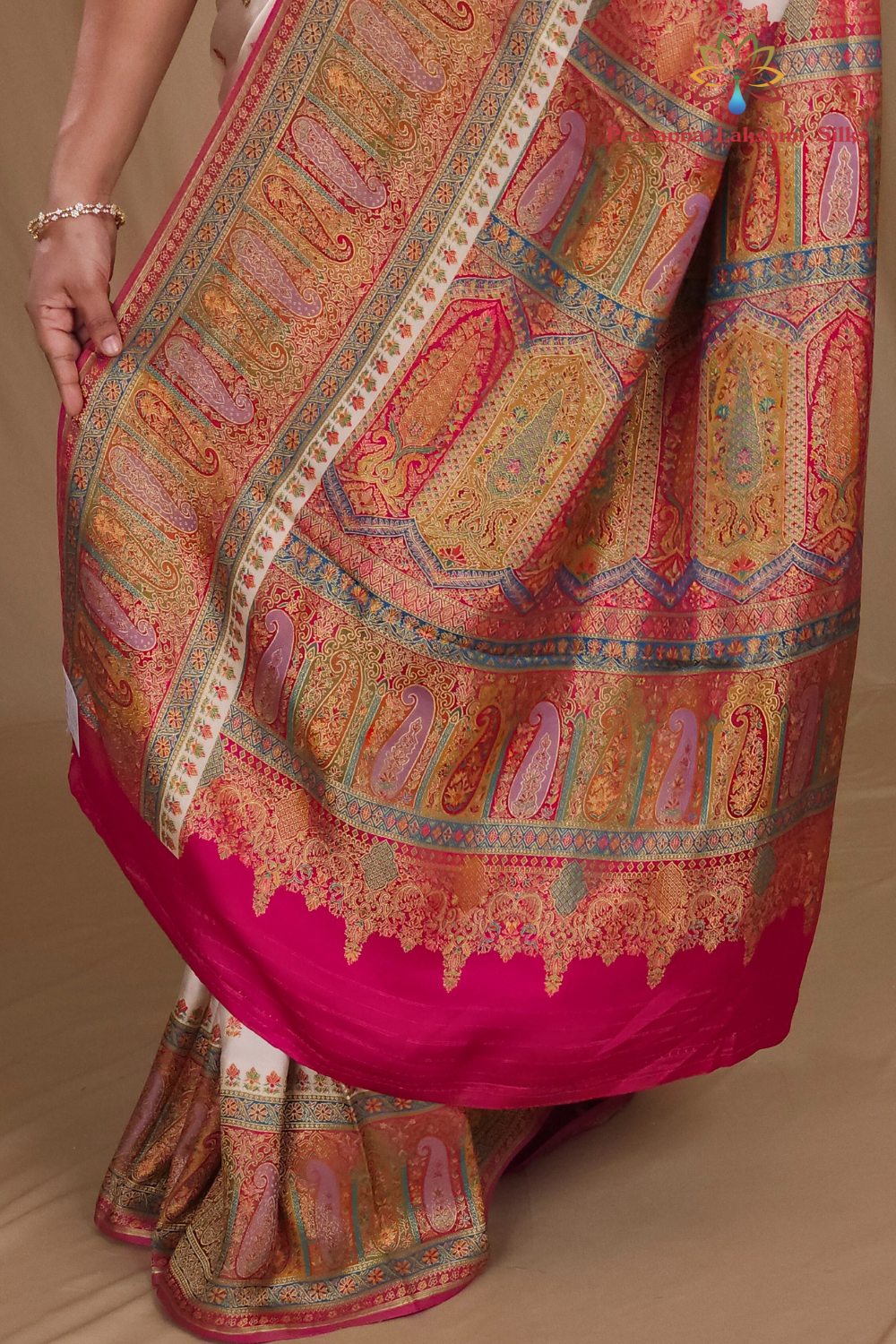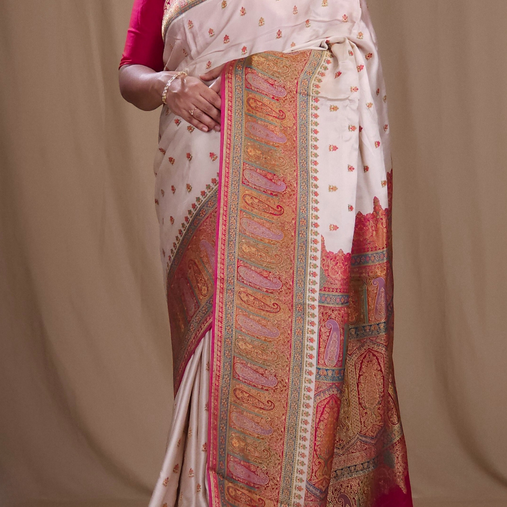 Exquisite Pashmina Satin Saree is adorned with allover meenakaari small thread-woven motifs that bring out timeless elegance. The saree is enhanced with rich meenakaari pashmina work borders and a luxuriously woven pashmina work pallu, .Paired with a contrast zari brocade blouse.....