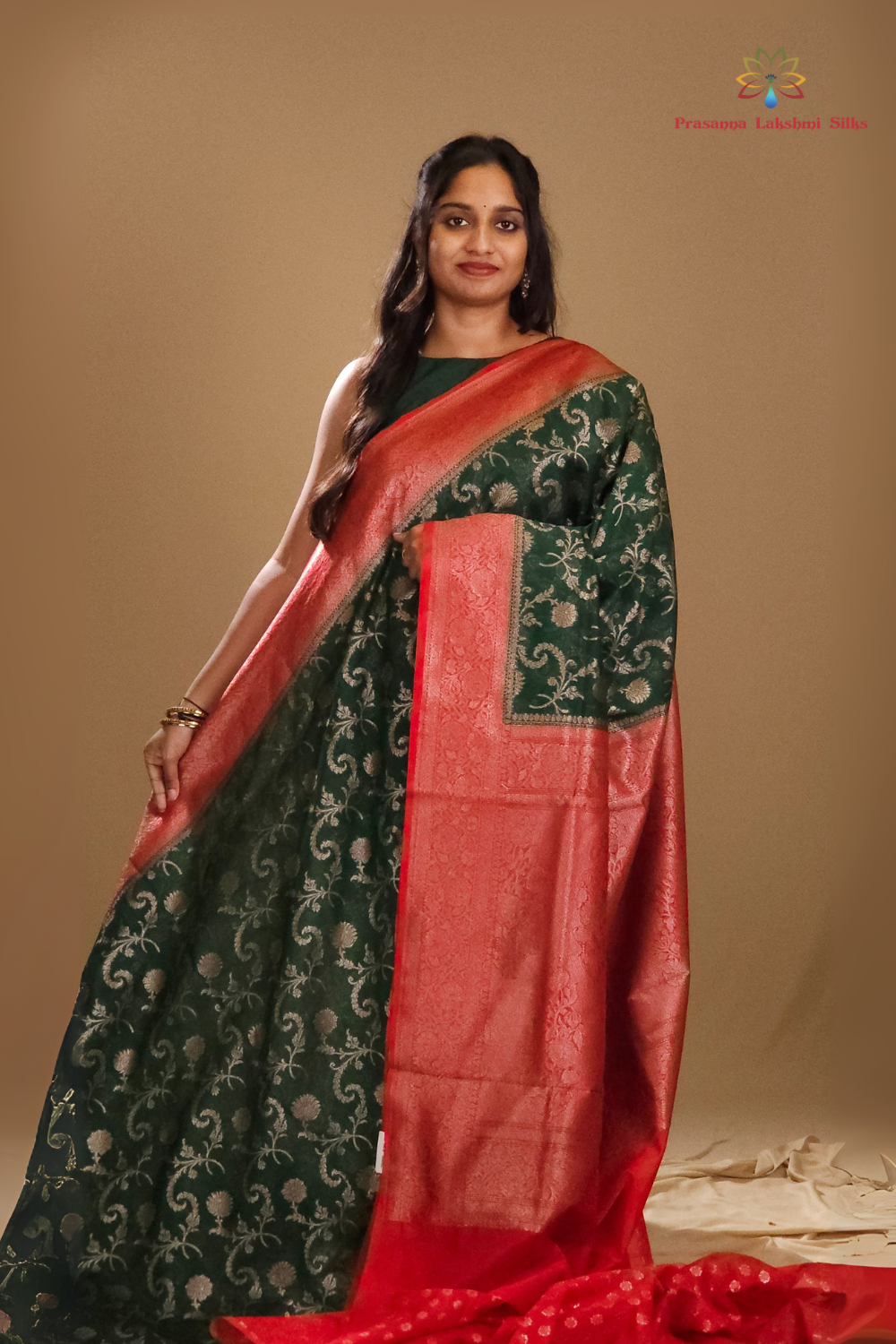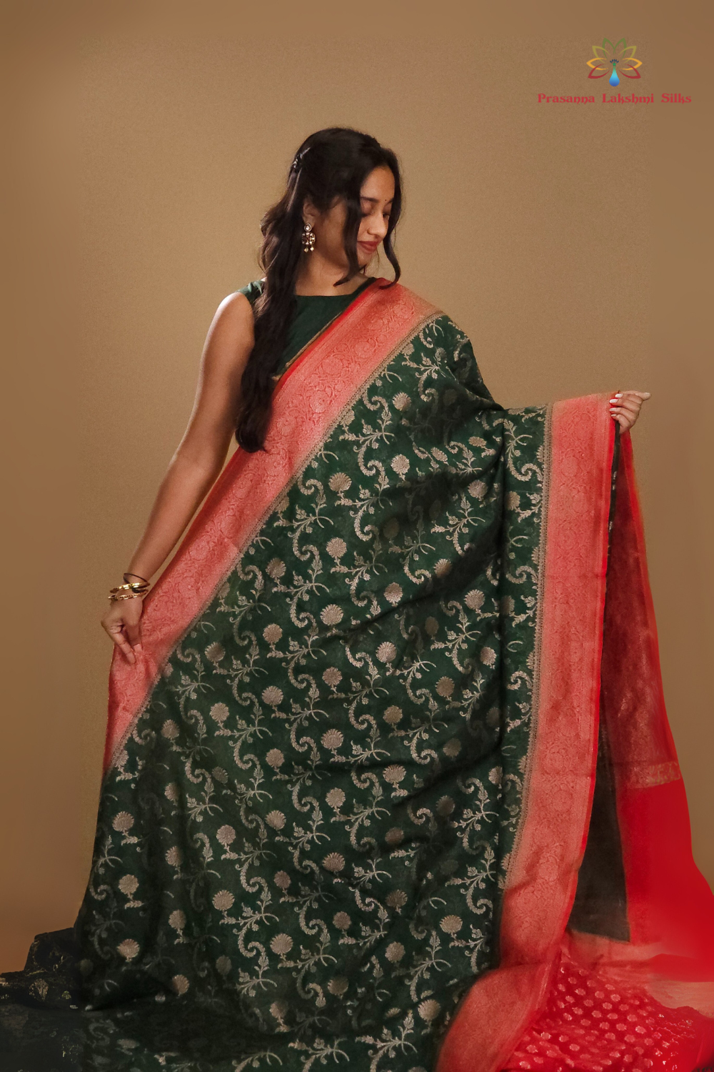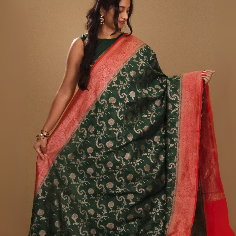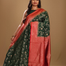 Dark Green and Red Banarasi Organza Saree
