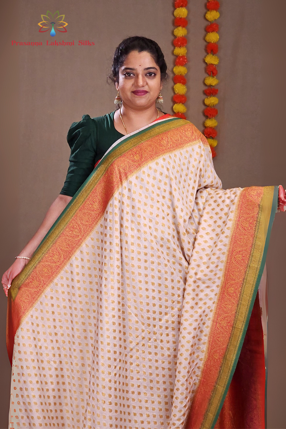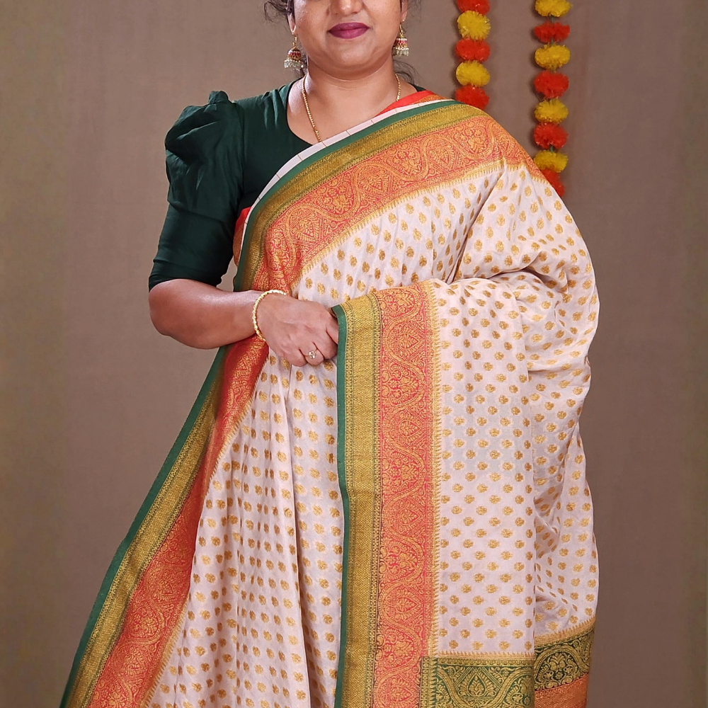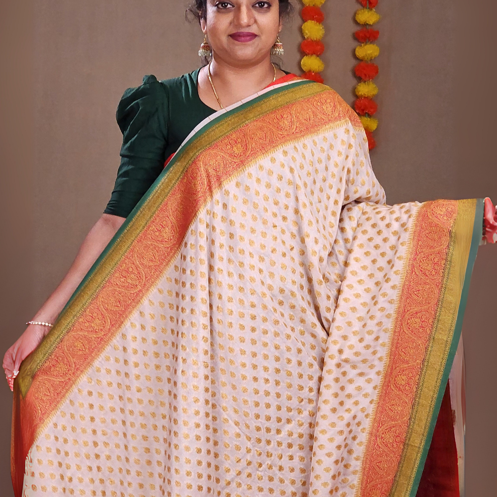 Experience the epitome of luxury and elegance with our stunning Semi Banarasi Khaddi Georgette Saree All Over Antique Zari motifs, Zari Woven Borders, Rich Pallu, and running Blouse