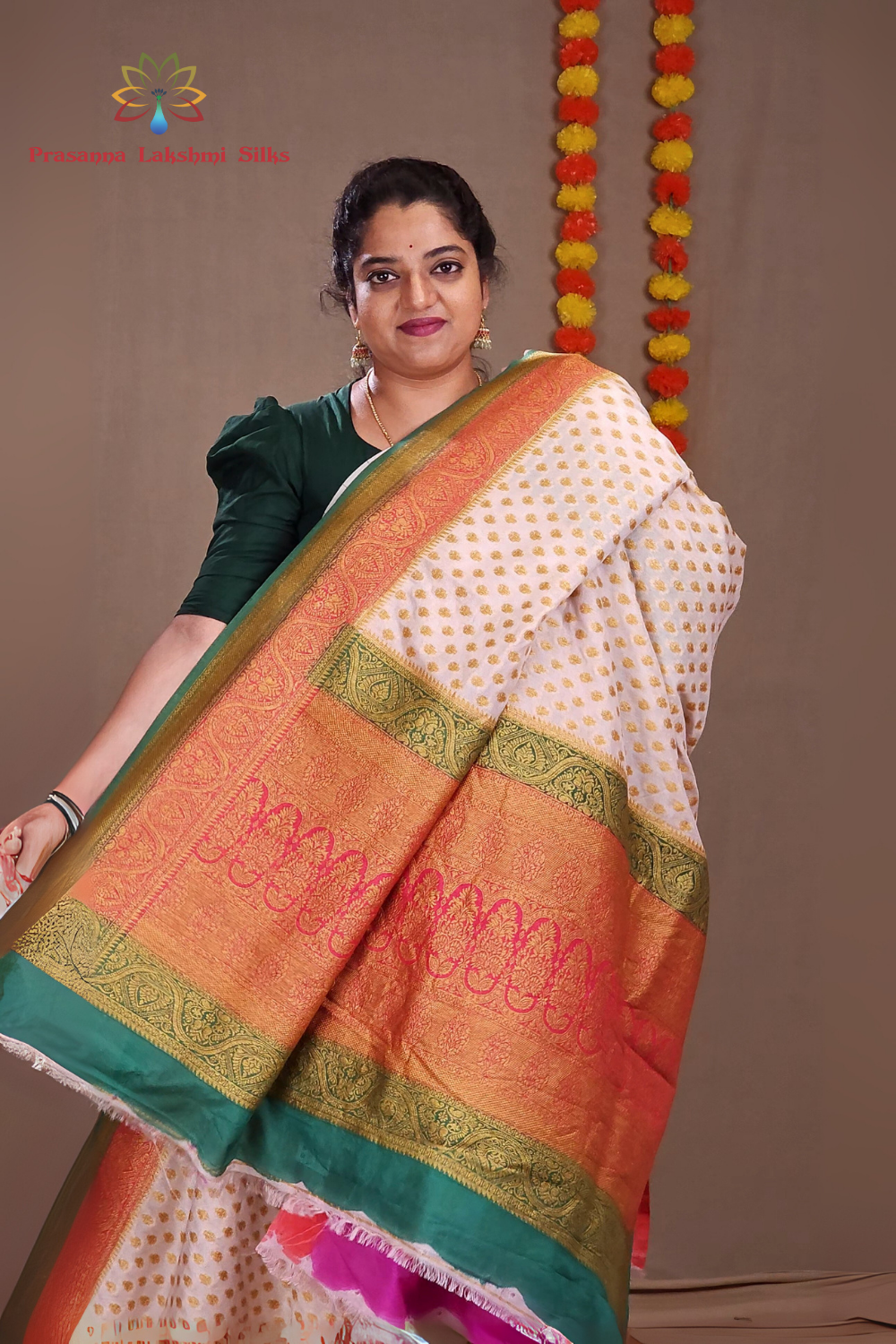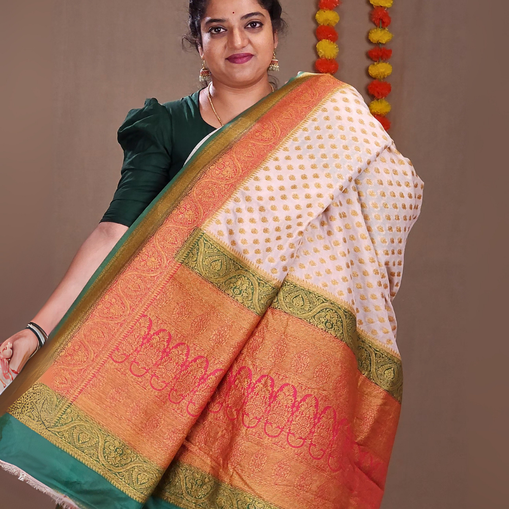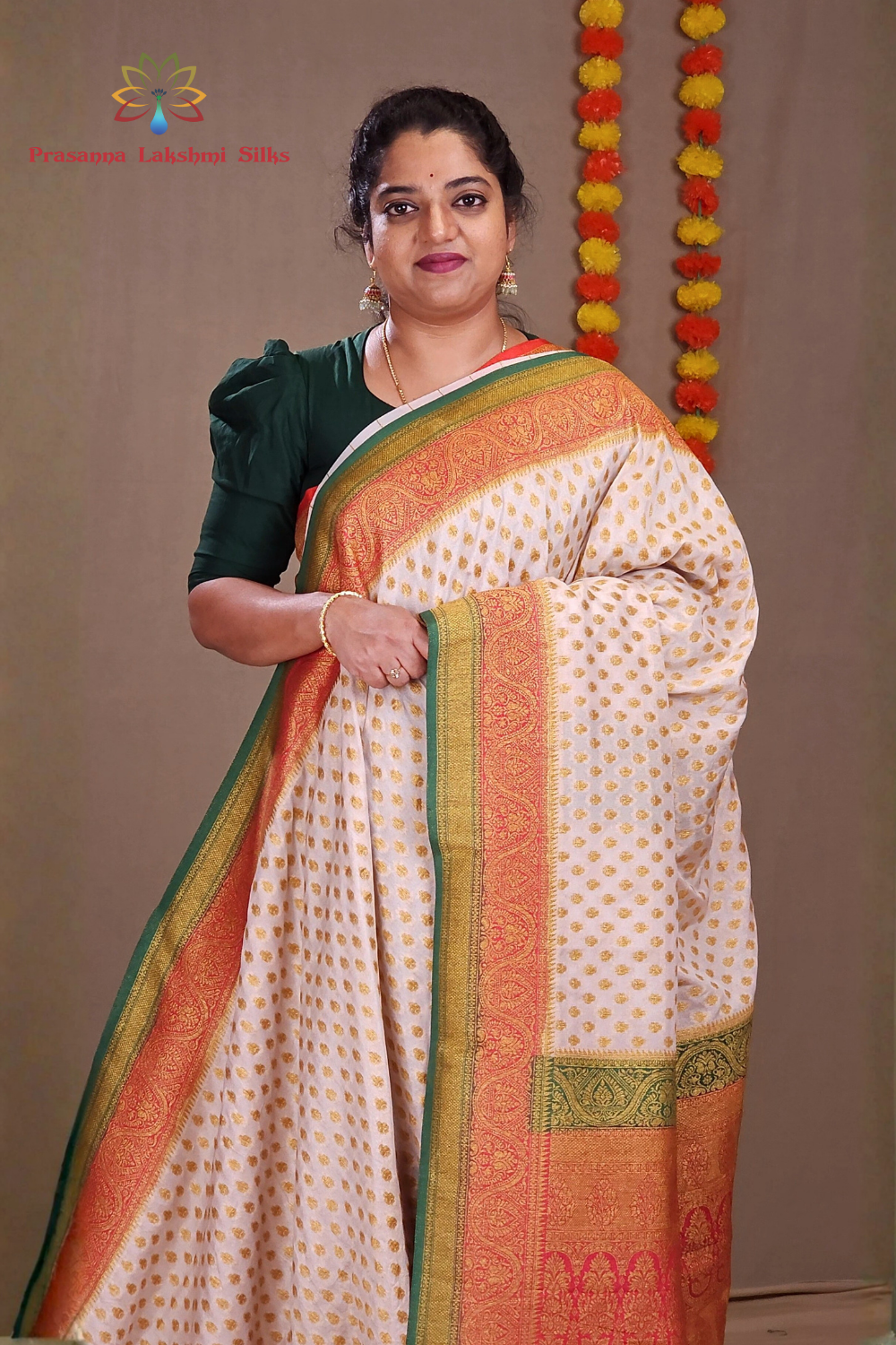 Experience the epitome of luxury and elegance with our stunning Semi Banarasi Khaddi Georgette Saree All Over Antique Zari motifs, Zari Woven Borders, Rich Pallu, and running Blouse