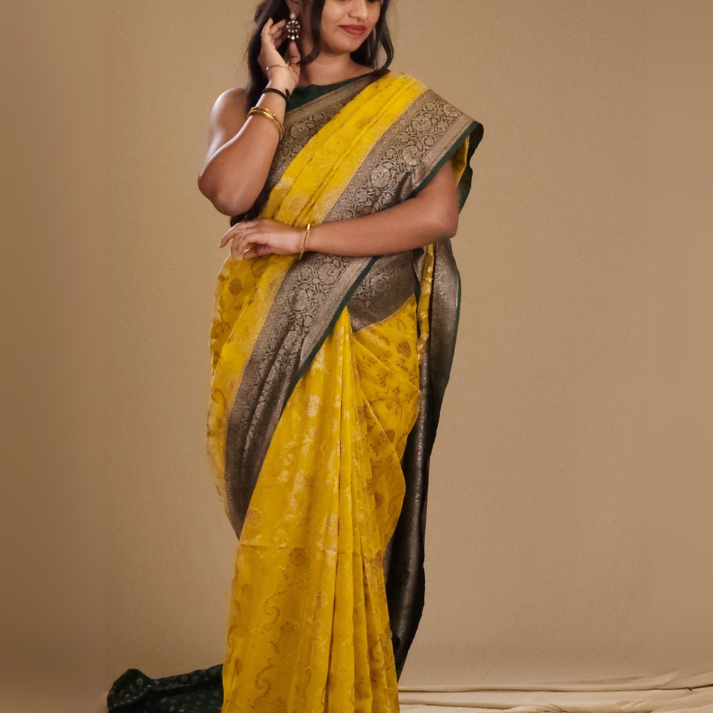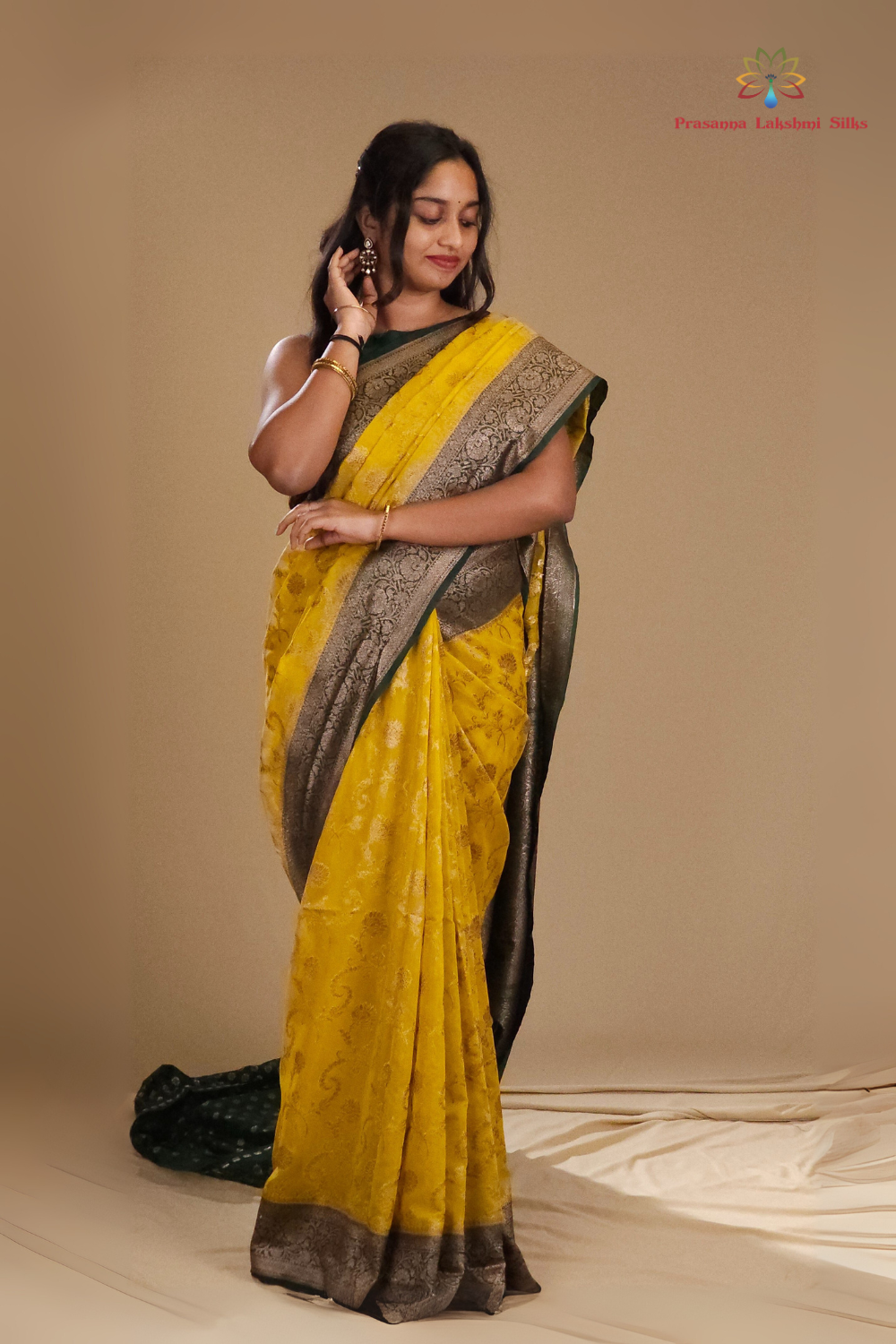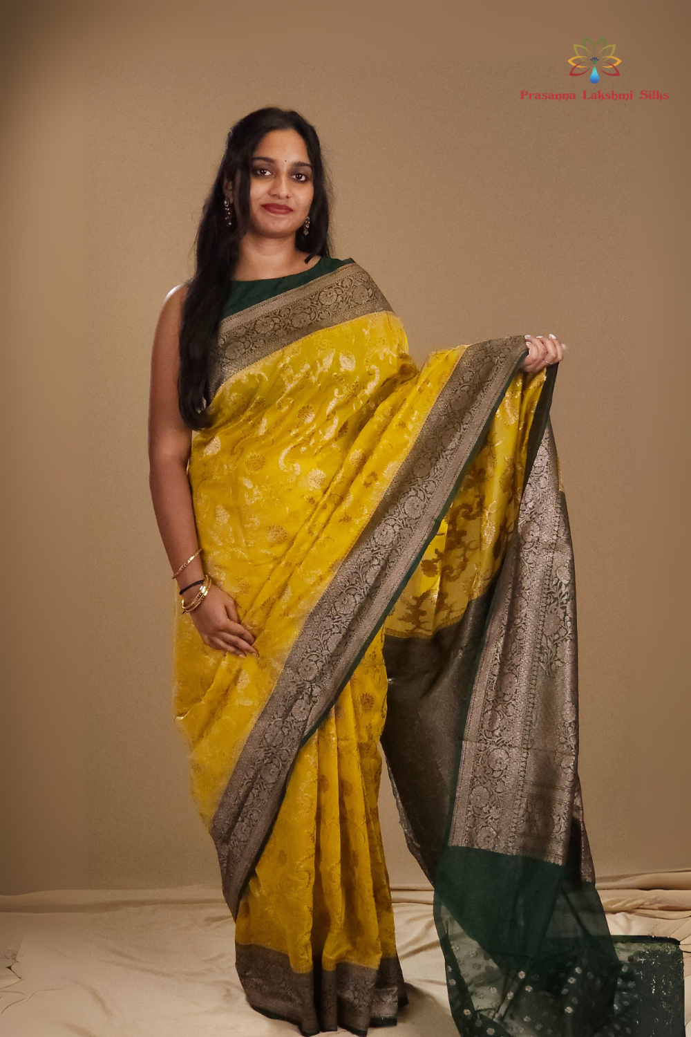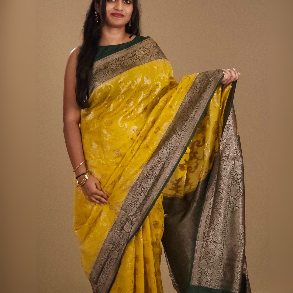 Mustard Yellow and Bottle Green Banarasi Organza Saree