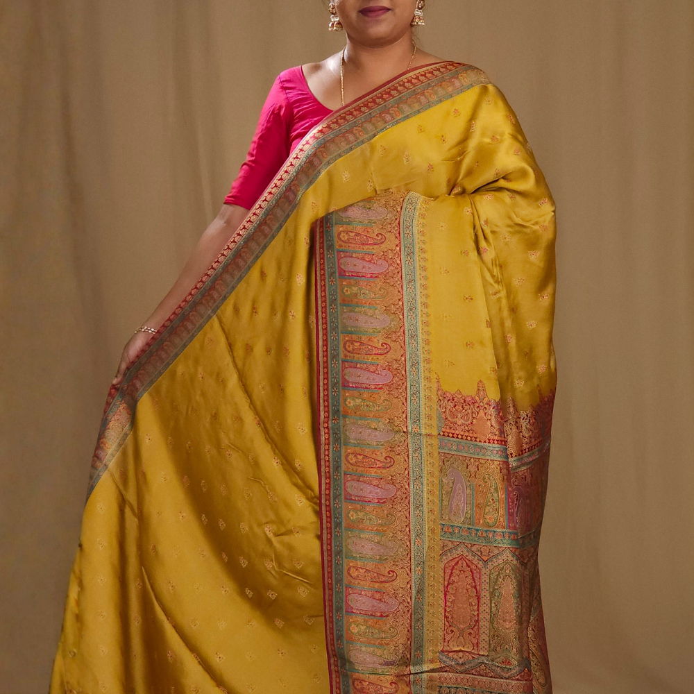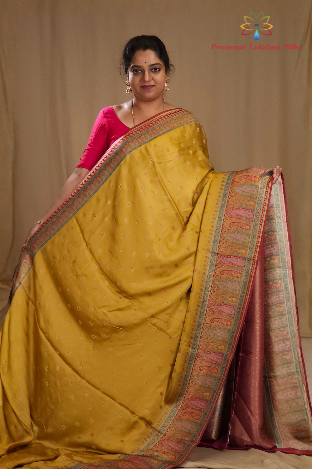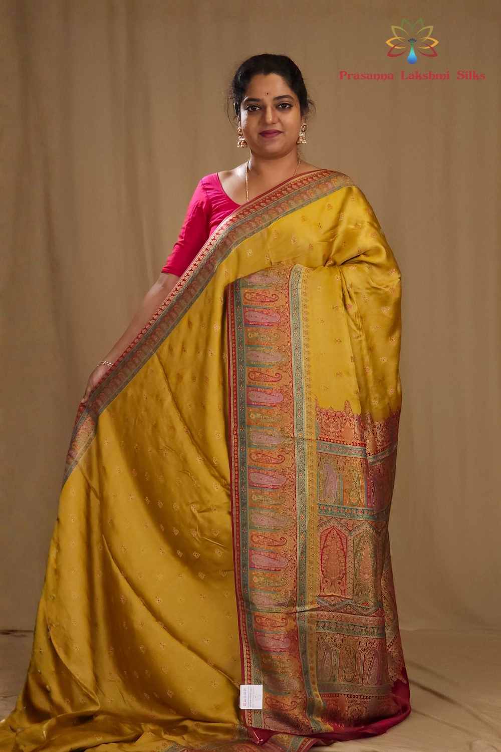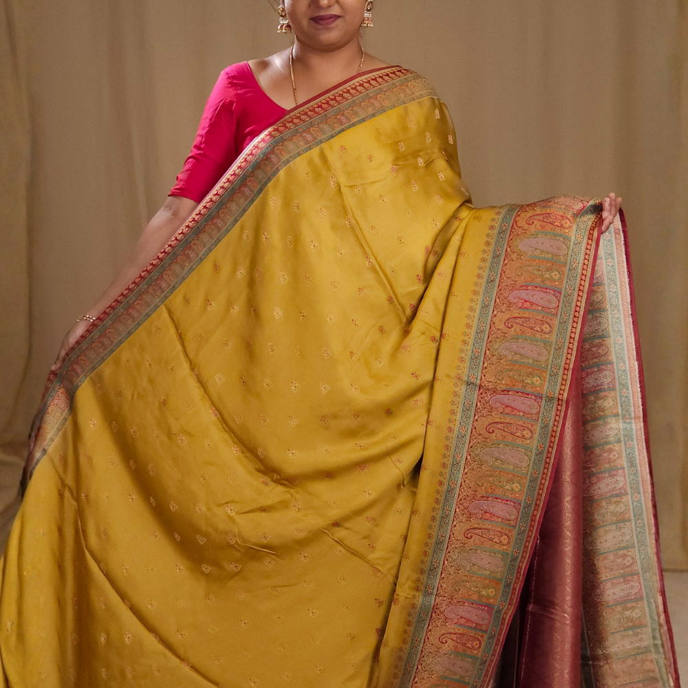 Exquisite Pashmina Satin Saree is adorned with allover meenakaari small thread-woven motifs that bring out timeless elegance. The saree is enhanced with rich meenakaari pashmina work borders and a luxuriously woven pashmina work pallu, .Paired with a contrast zari brocade blouse.....