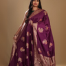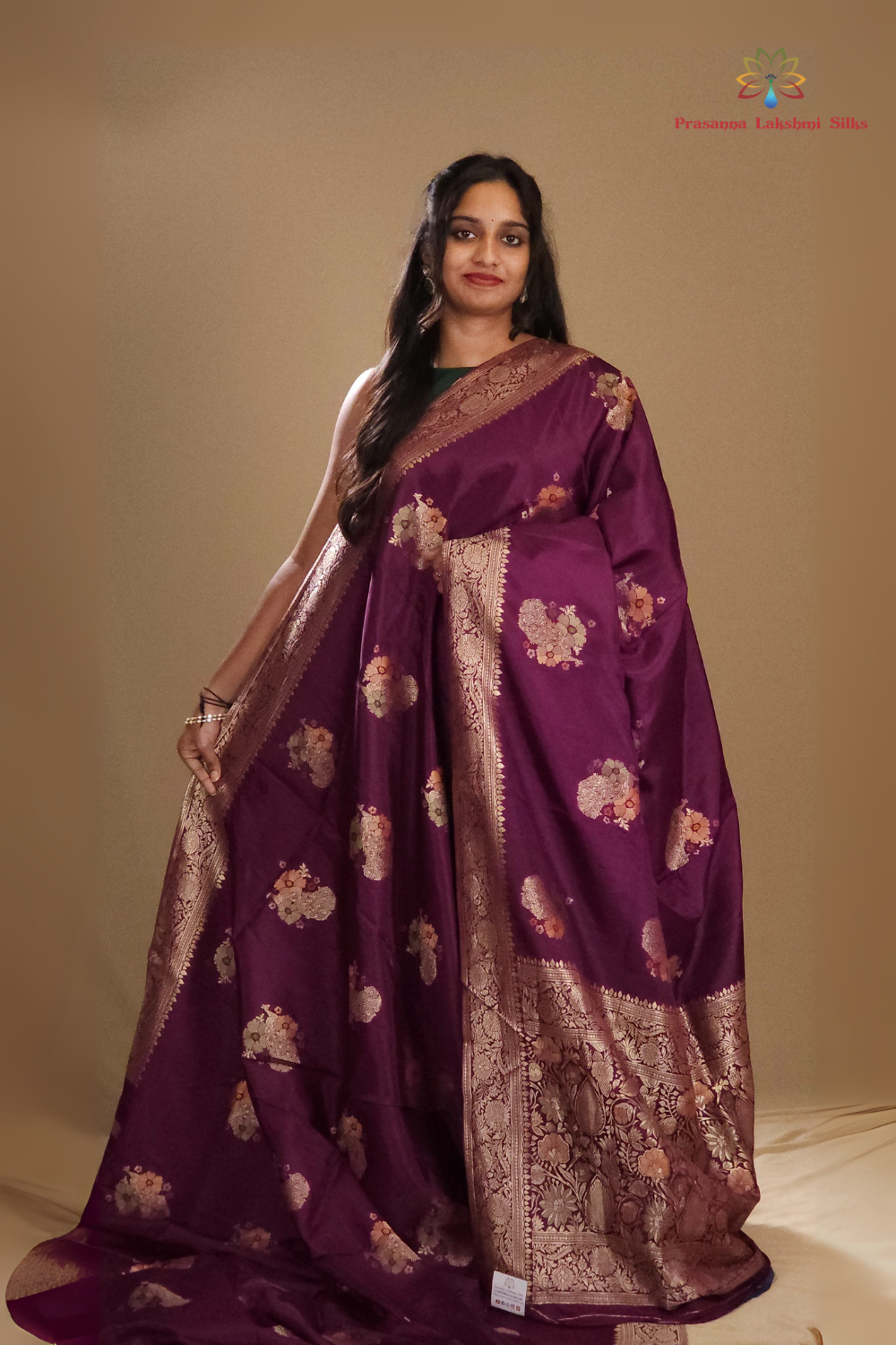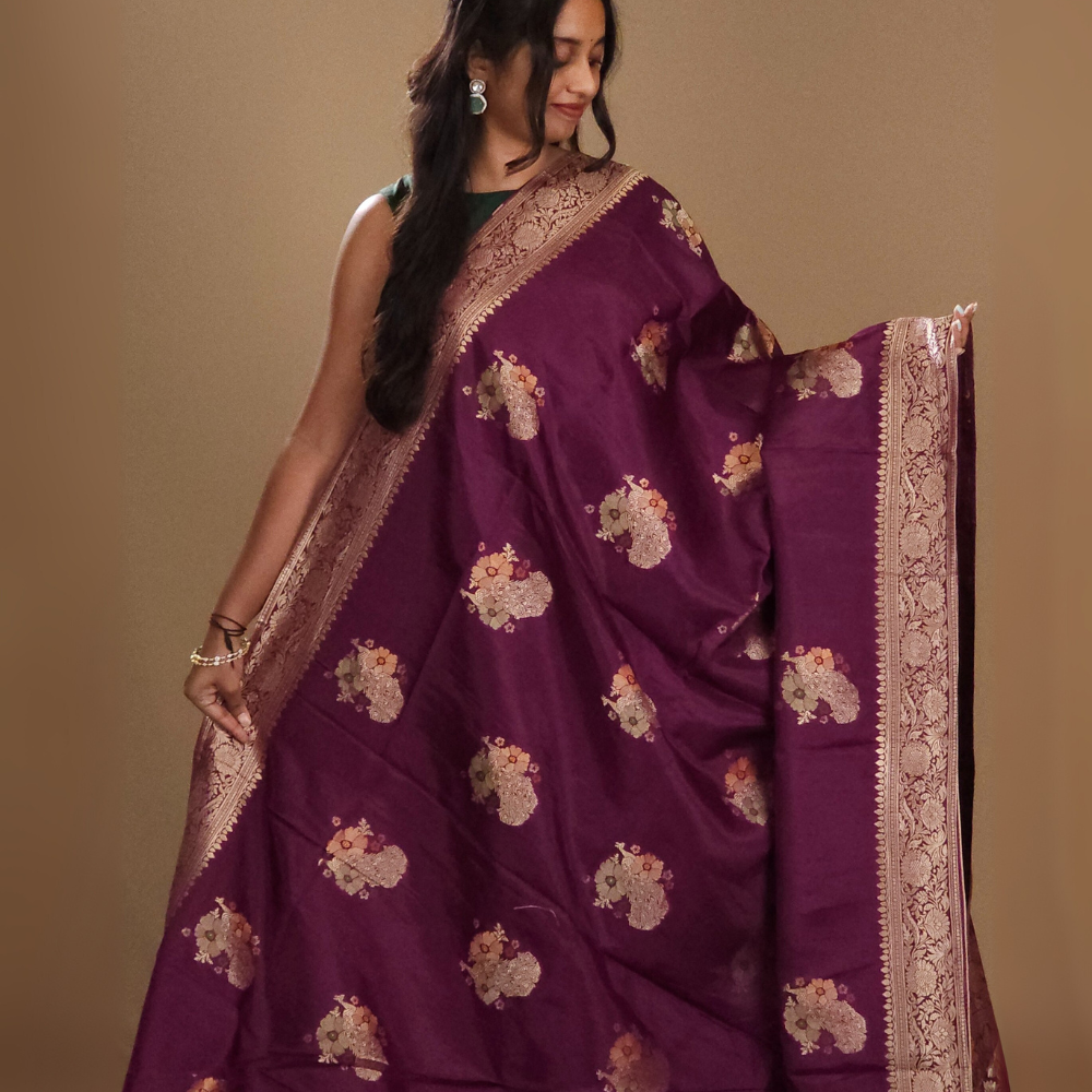Experience effortless elegance in our Banarasi Munga Sarees,Adorned with floral motifs in meenakaari touch , zari woven borders rich brocade pallu, paired with contrast blouse.....