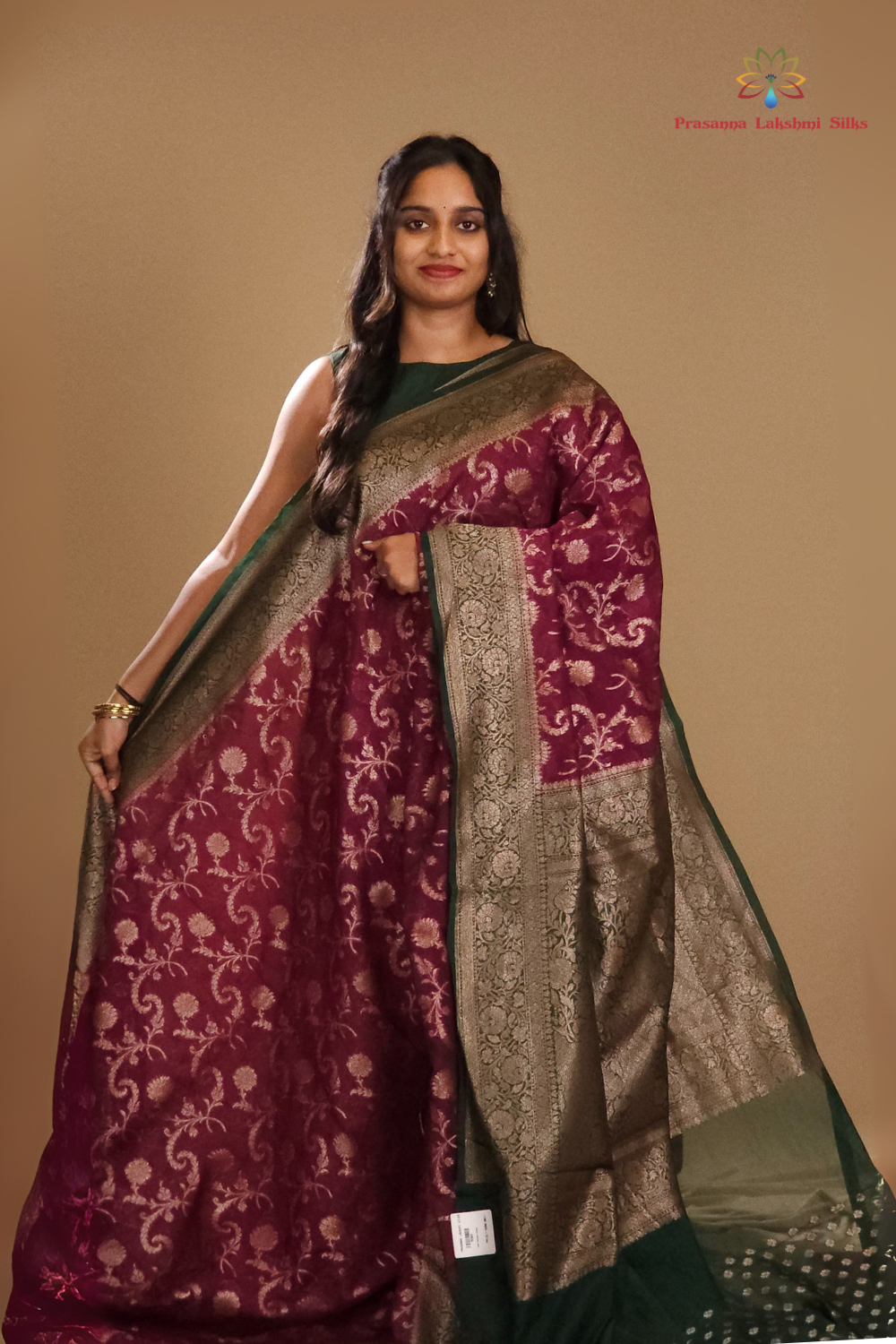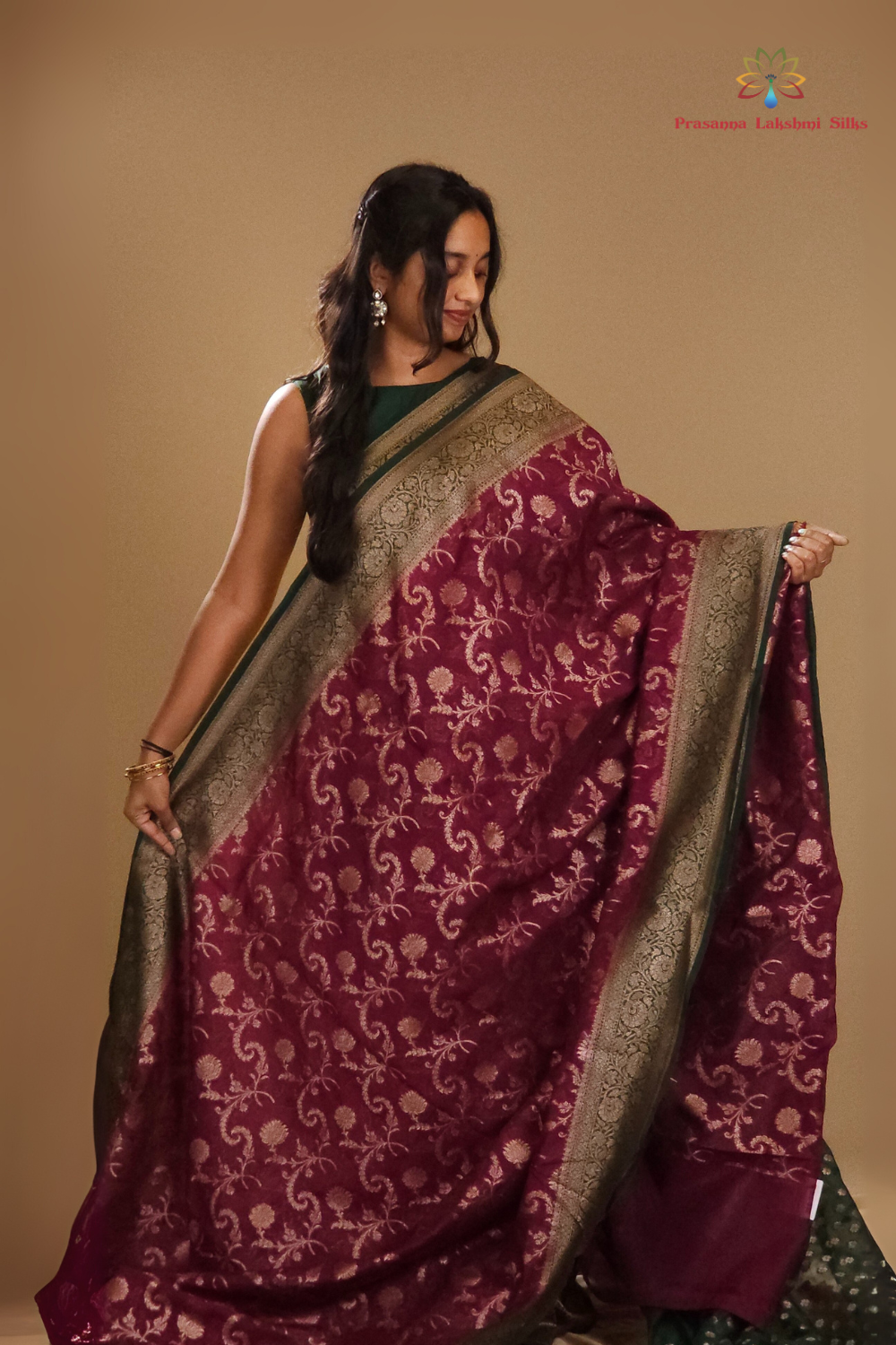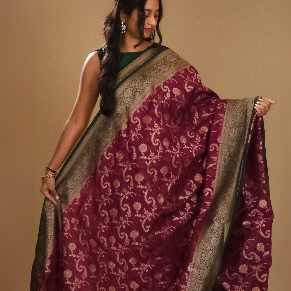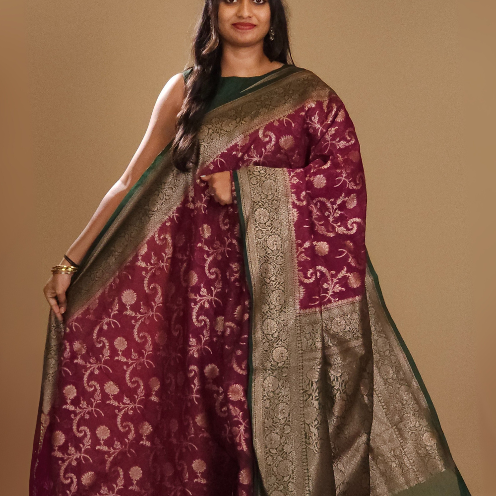Wine and Bottle Green Banarasi Organza Saree