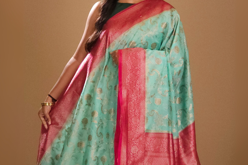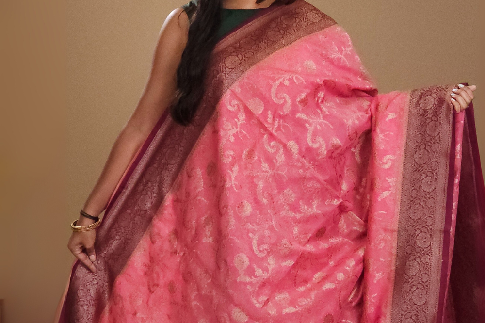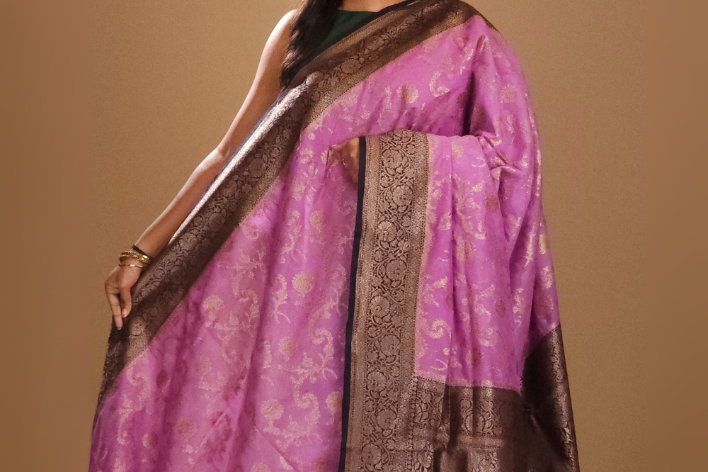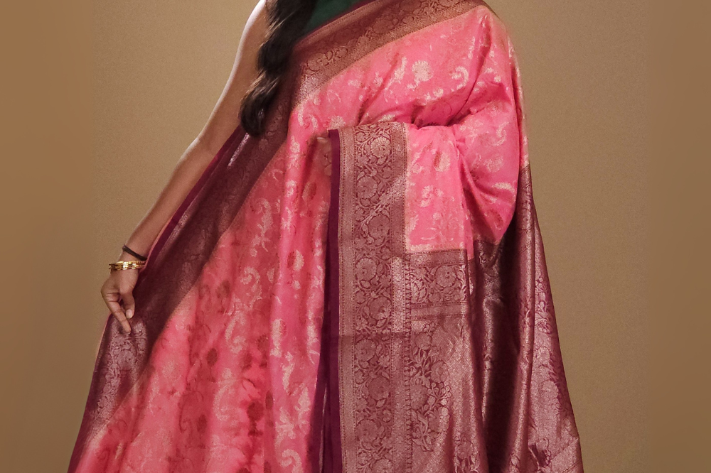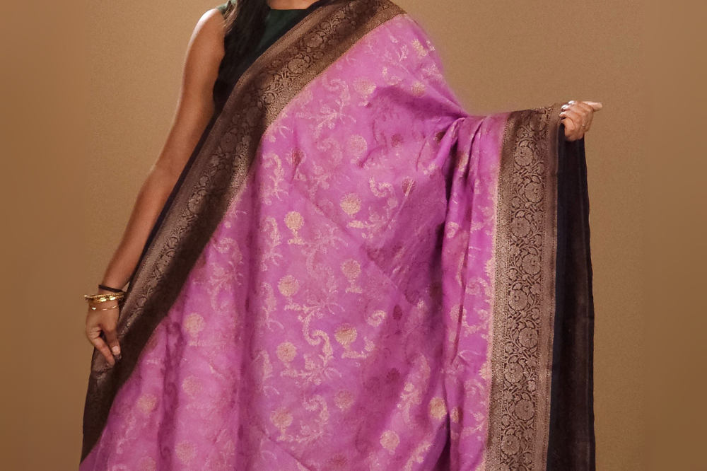 Baby Pink and Dark Purple Banarasi Organza Saree