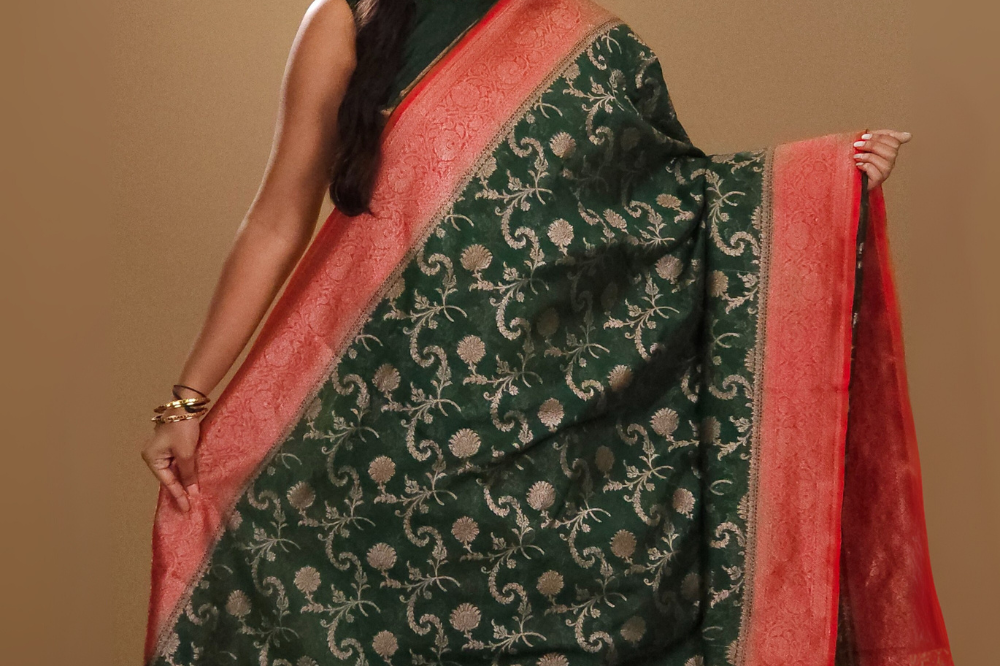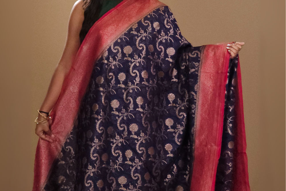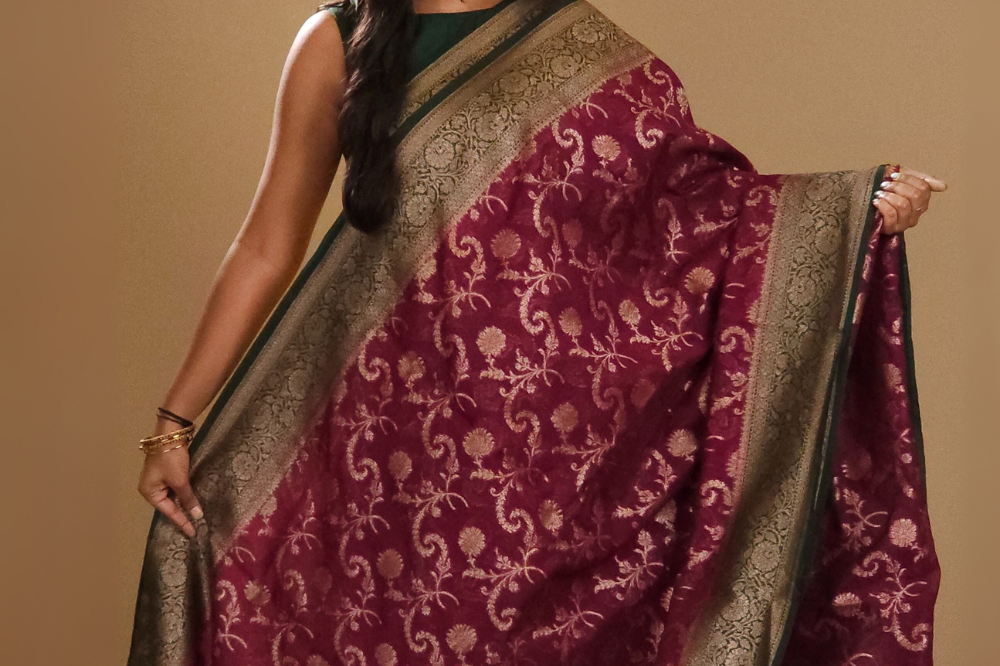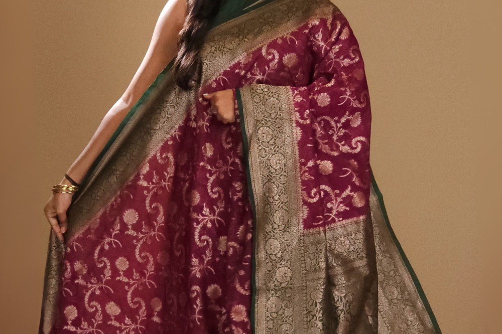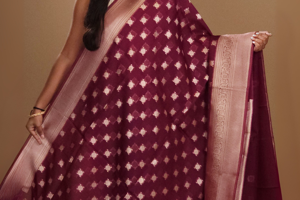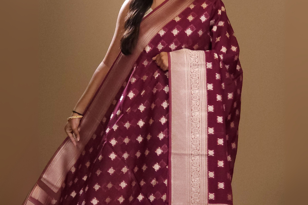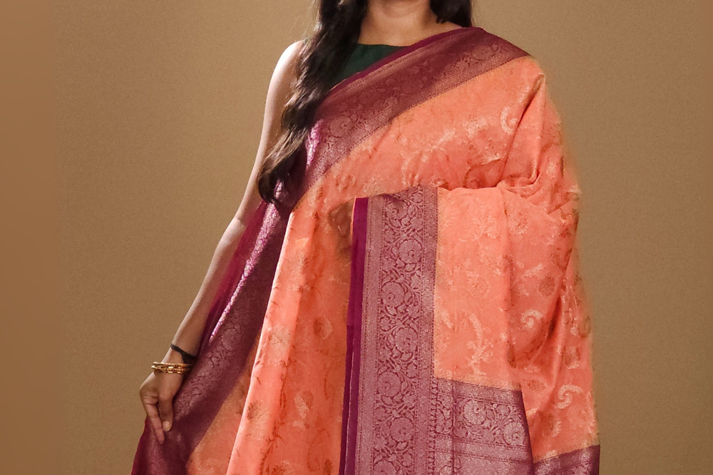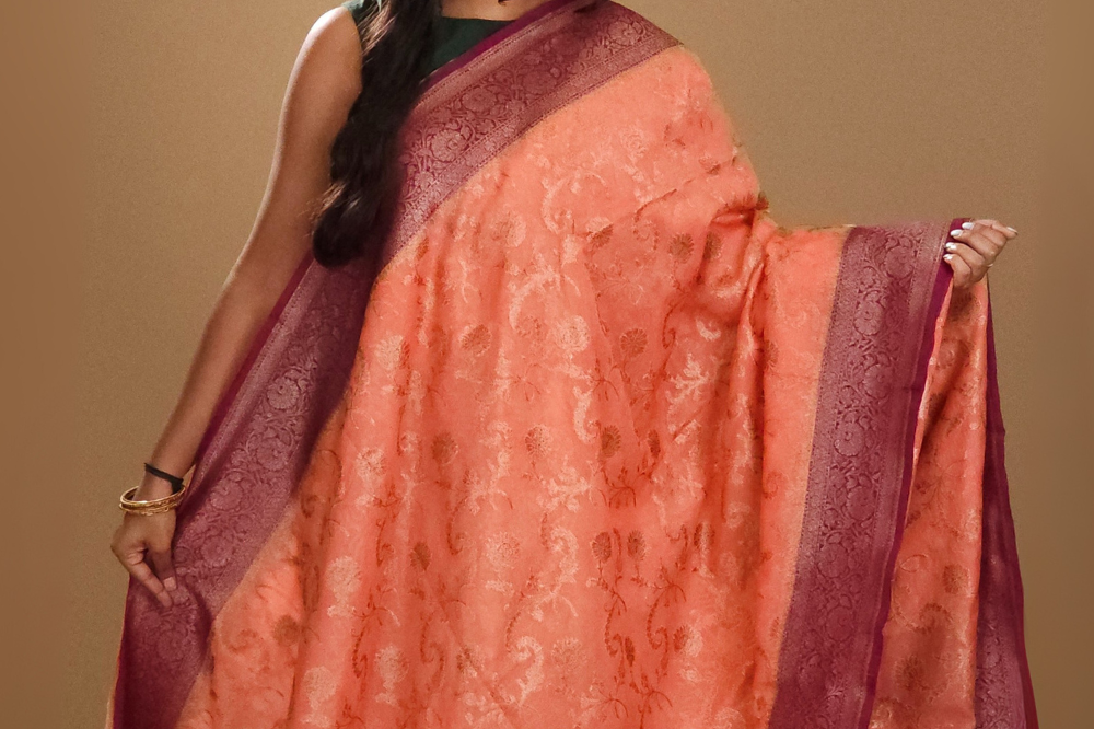 Dark Peach and Dark Purple Banarasi Organza Saree