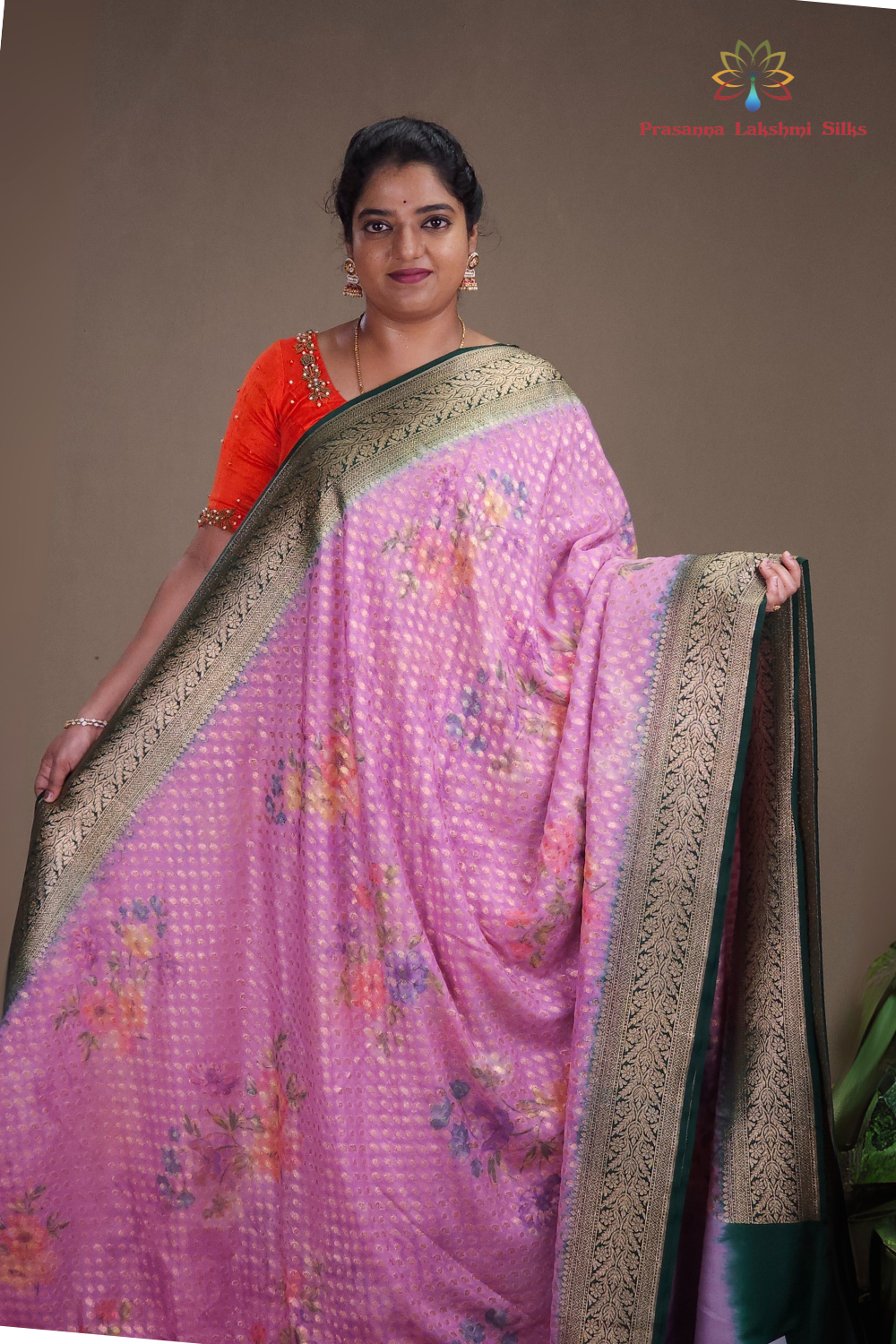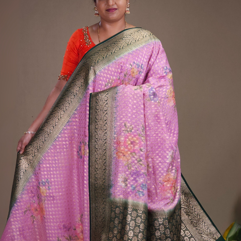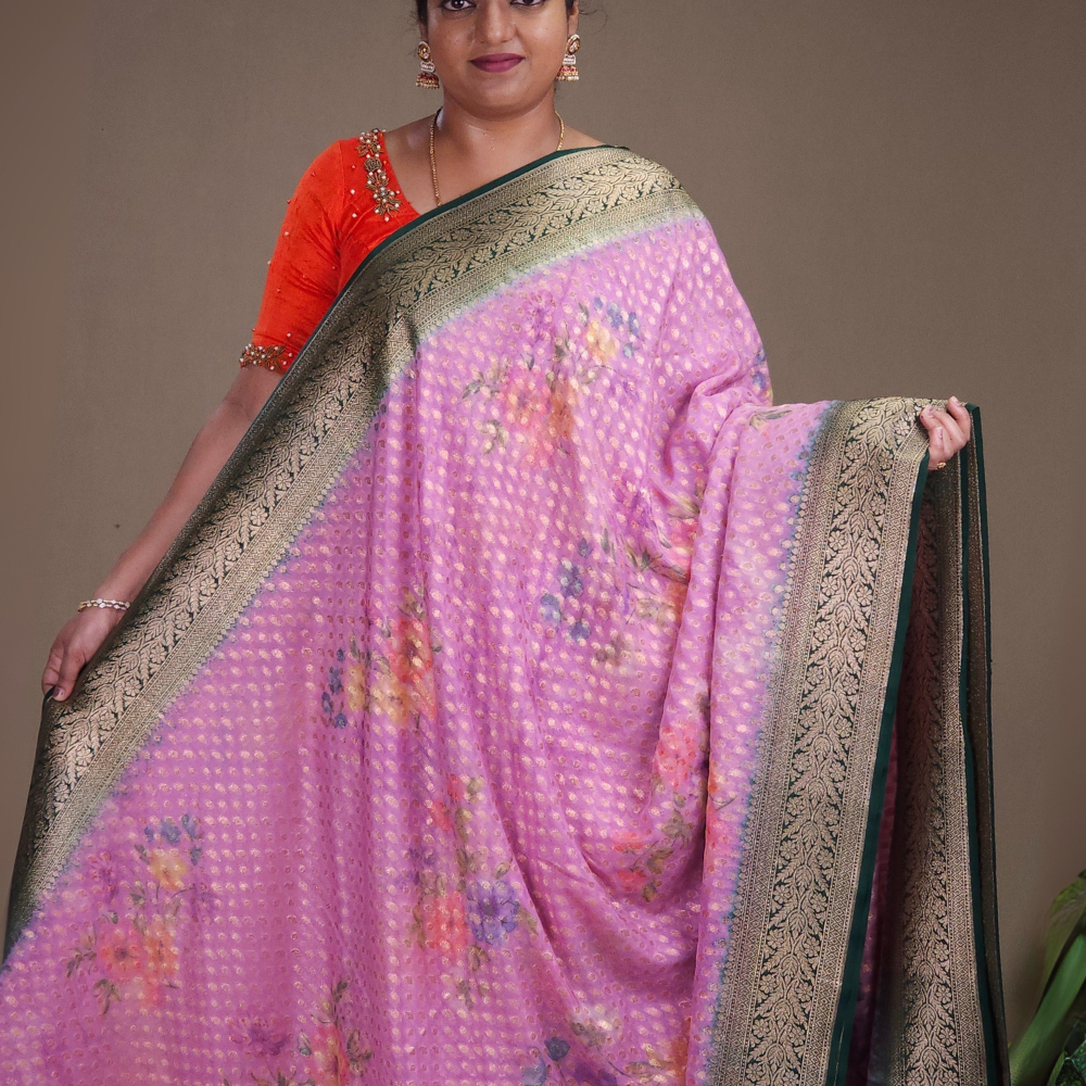 Elevate with our Banaras Georgette Saree, featuring intricate allover zari motifs beautifully blended with vibrant digital floral bunches. The contrast floral borders, rich brocade pallu. Paired with contrast blouse.