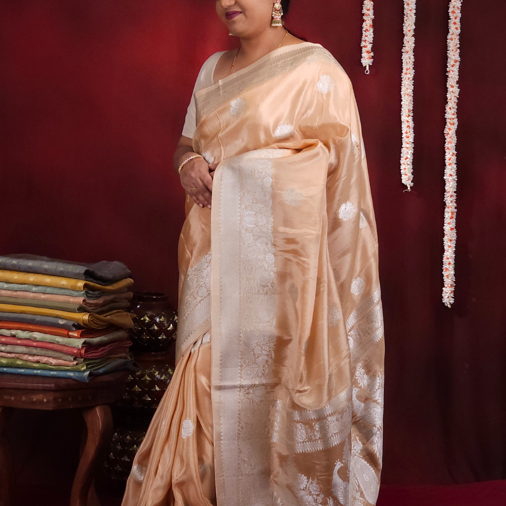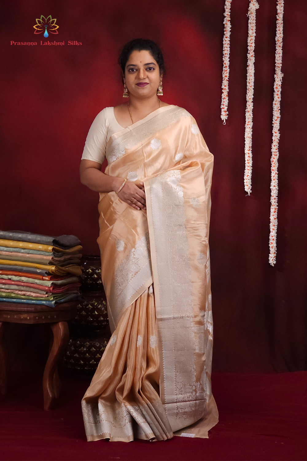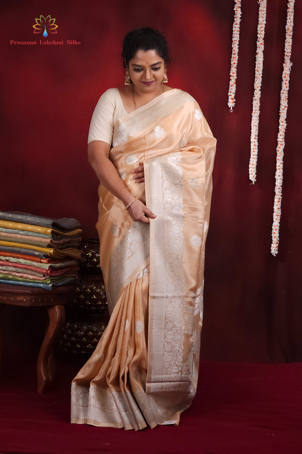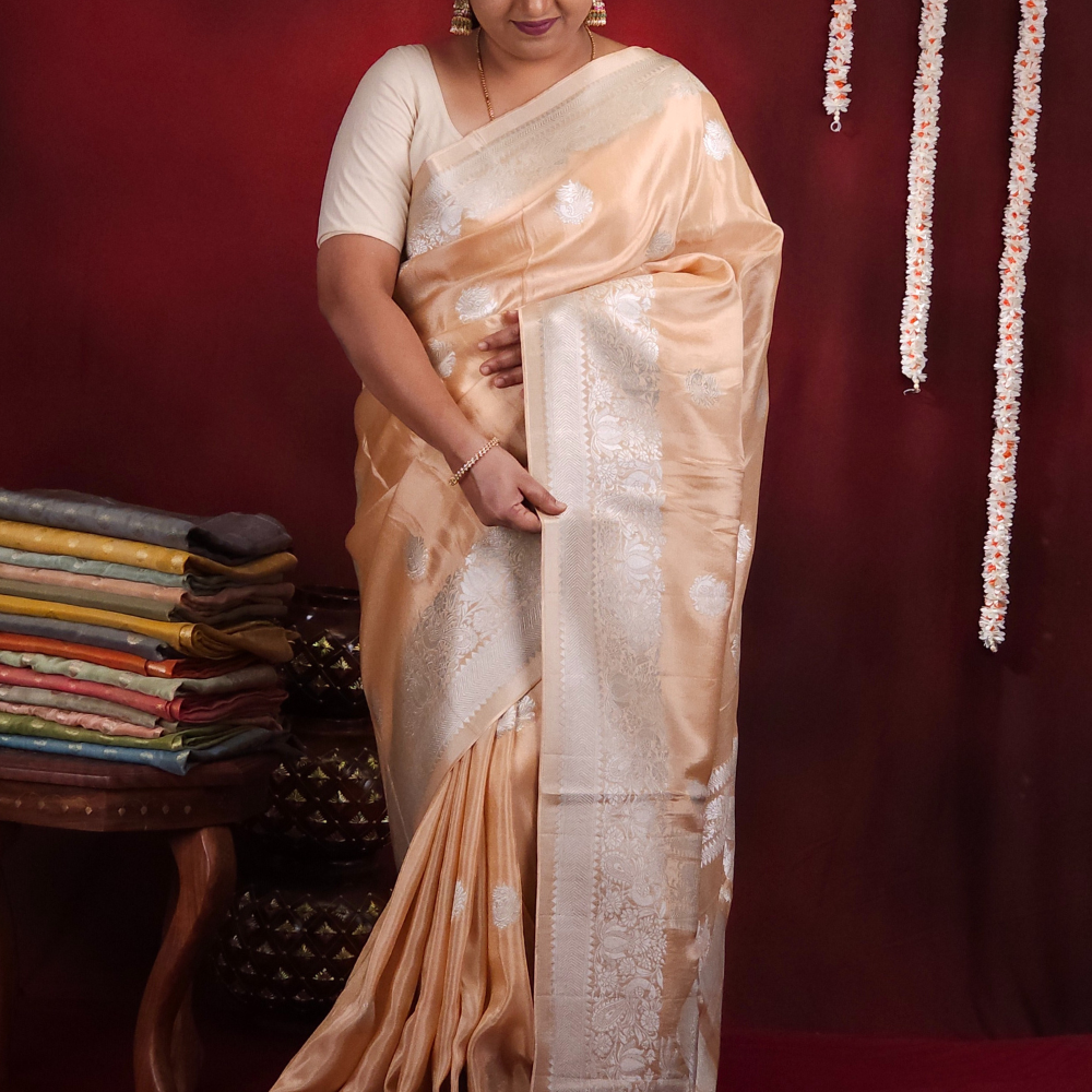 Wrap yourself in the opulence of our Banaras Munga Tissue Saree, with silver zari woven motifs and floral borders rich brocade pallu . Paired with a running blouse