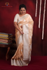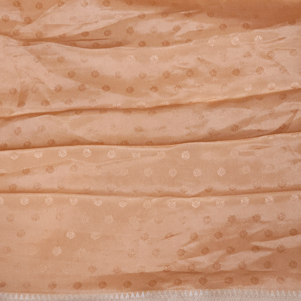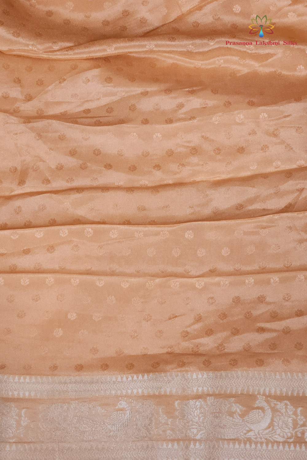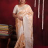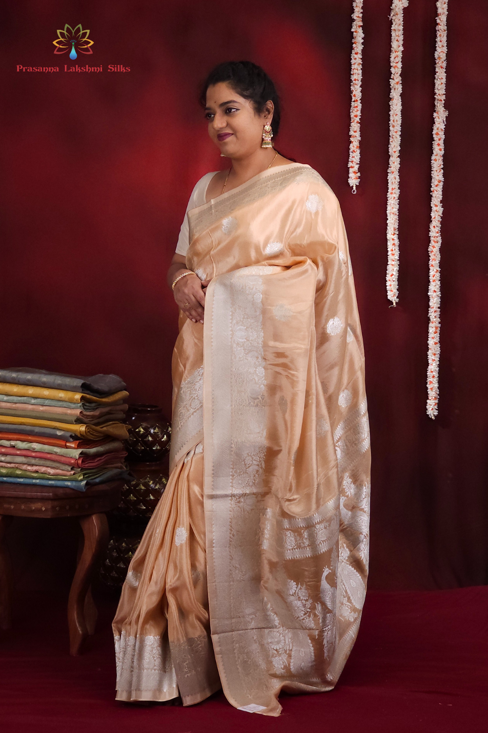 Wrap yourself in the opulence of our Banaras Munga Tissue Saree, with silver zari woven motifs and floral borders rich brocade pallu . Paired with a running blouse
