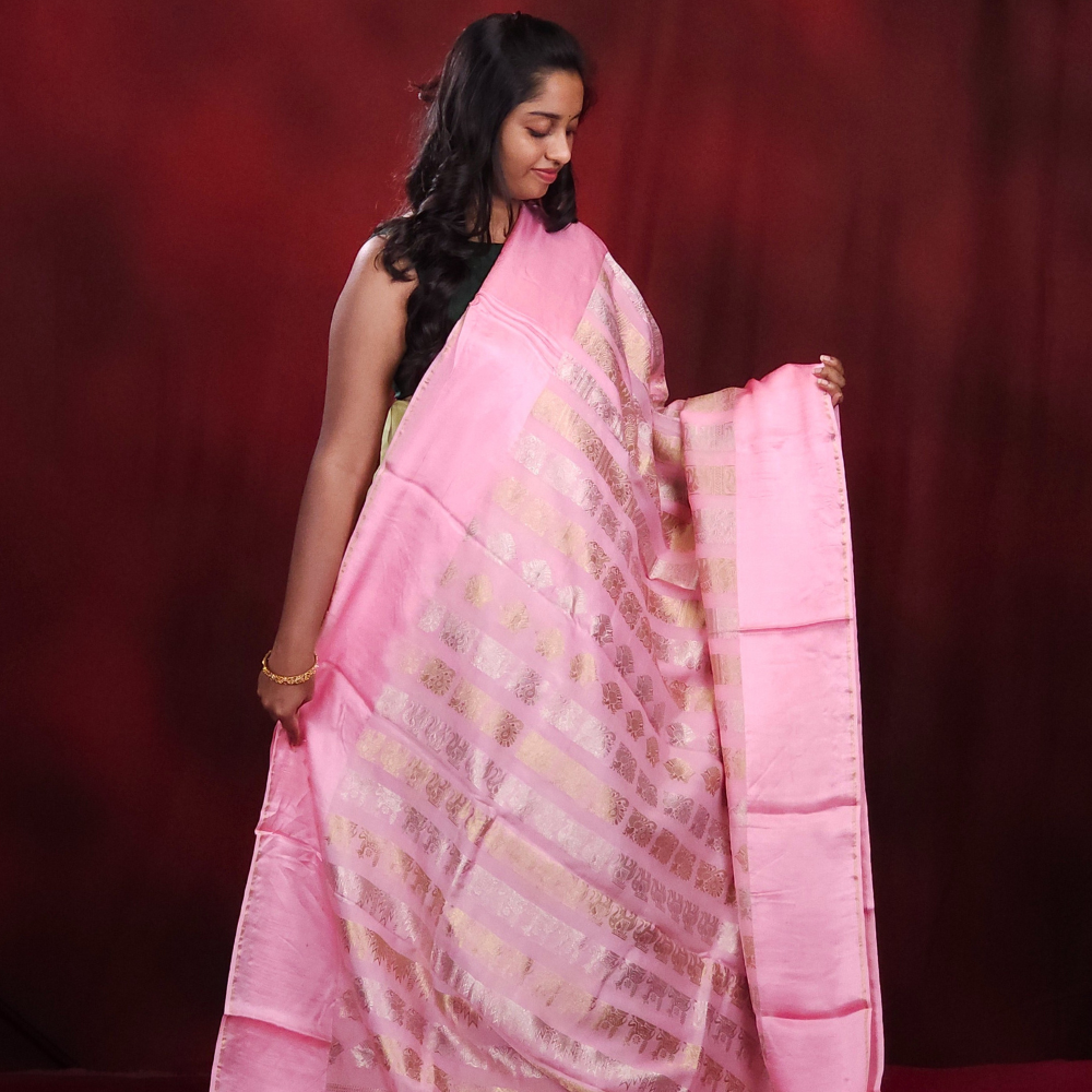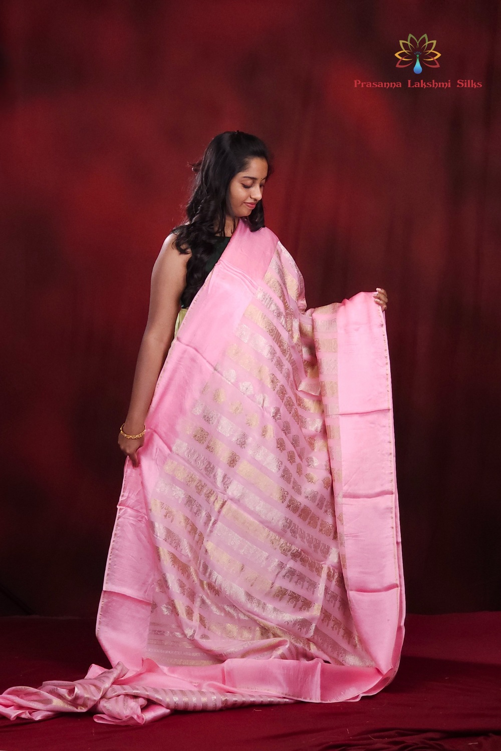 Banarasi Silk Sarees allover rich zari brocade, featuring stunning vertical stripes in alternating gold and silver zari with a detailing of elephants, peacocks and deer ,designed with elegant plain satin borders, a rich brocade pallu, and a running blouse......