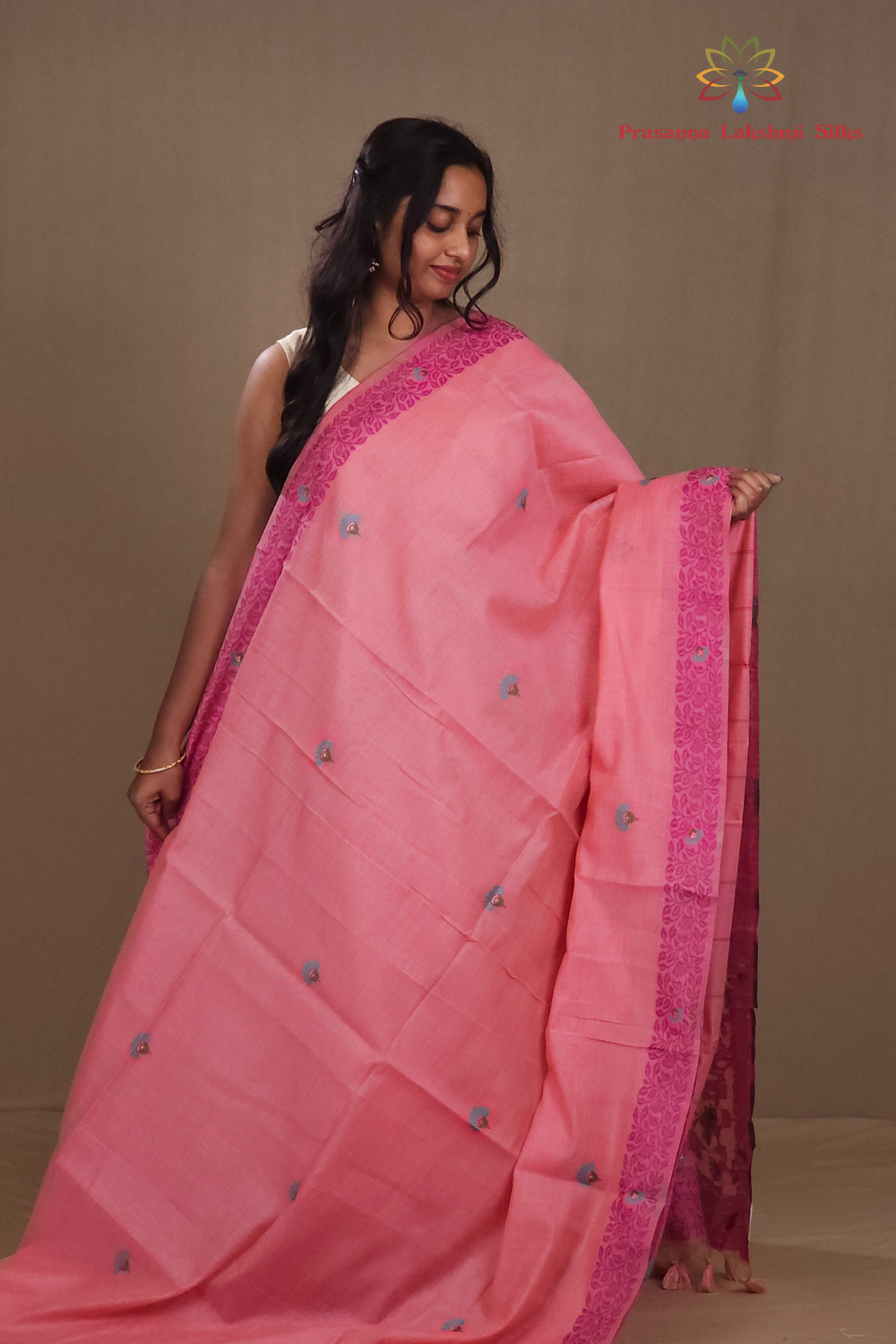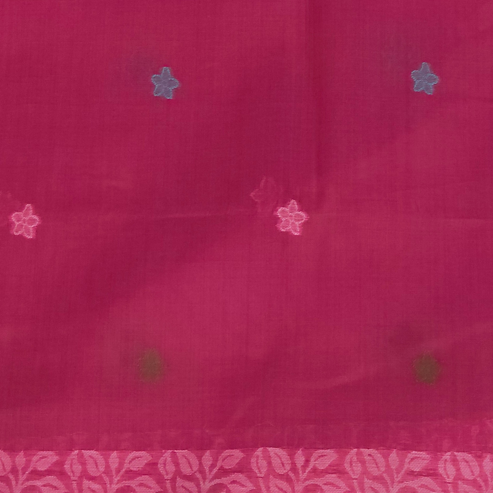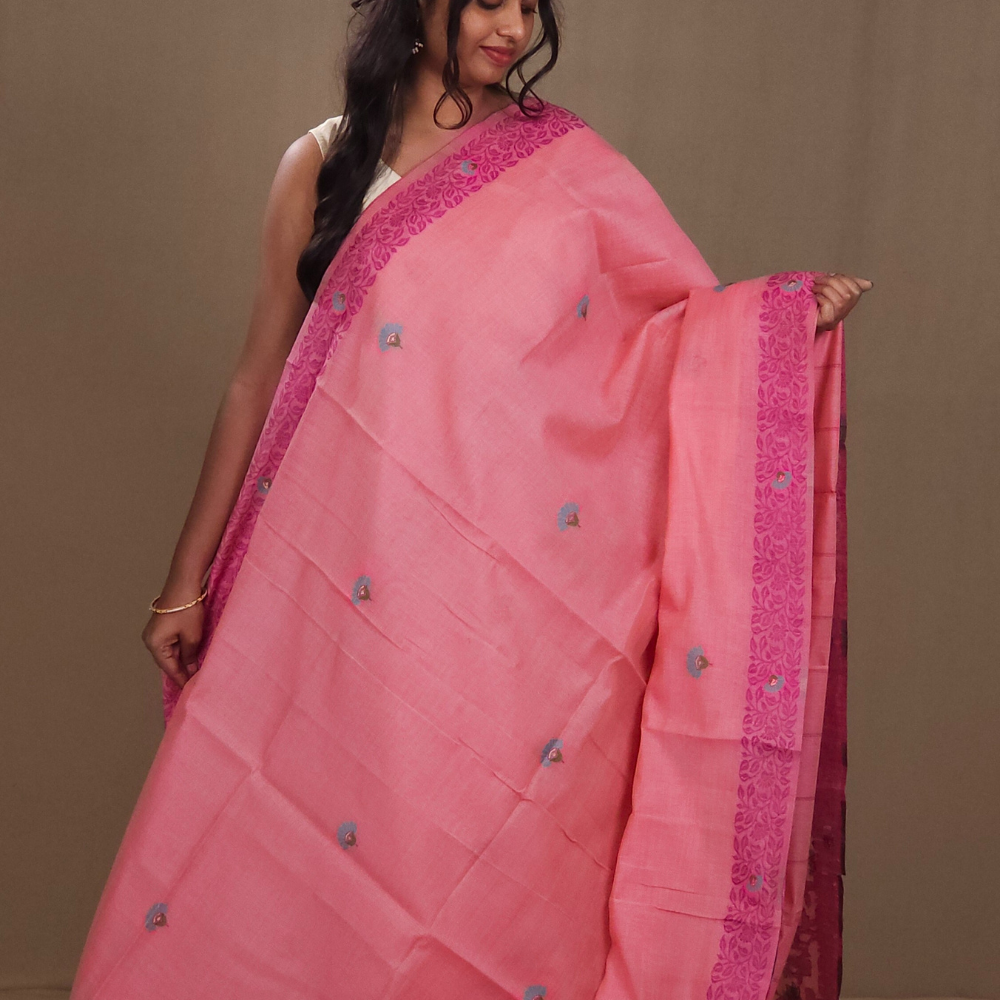 Timeless grace of our Chanderi Silk Cotton Saree, adorned with elegant meenakari motifs across the body. A vibrant meenakari pallu finished with delicate tassels, paired beautifully with a contrast blouse