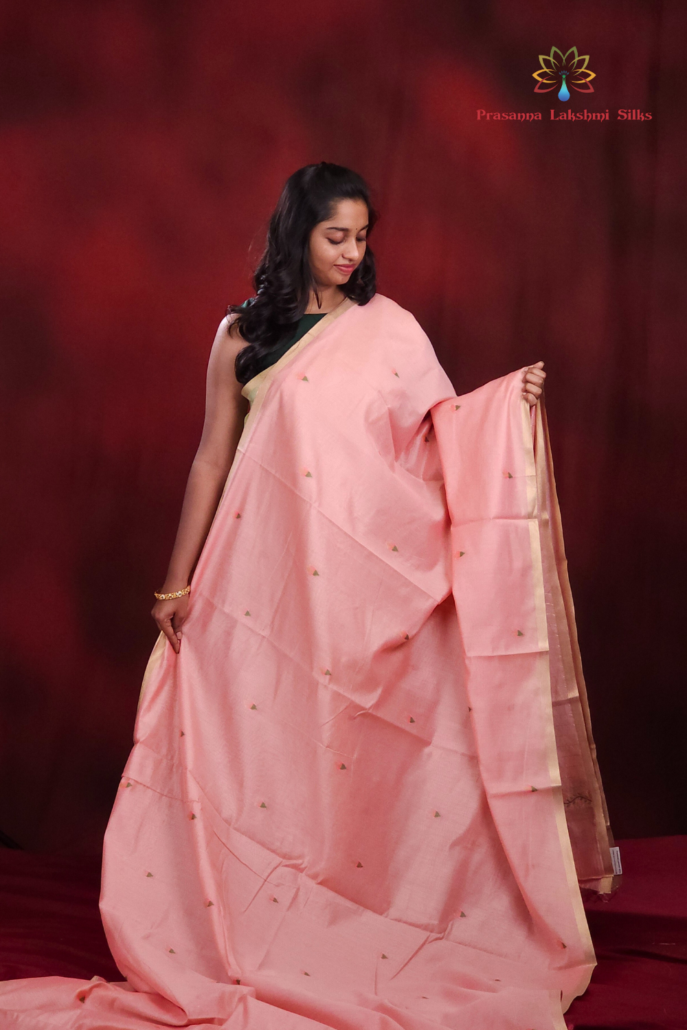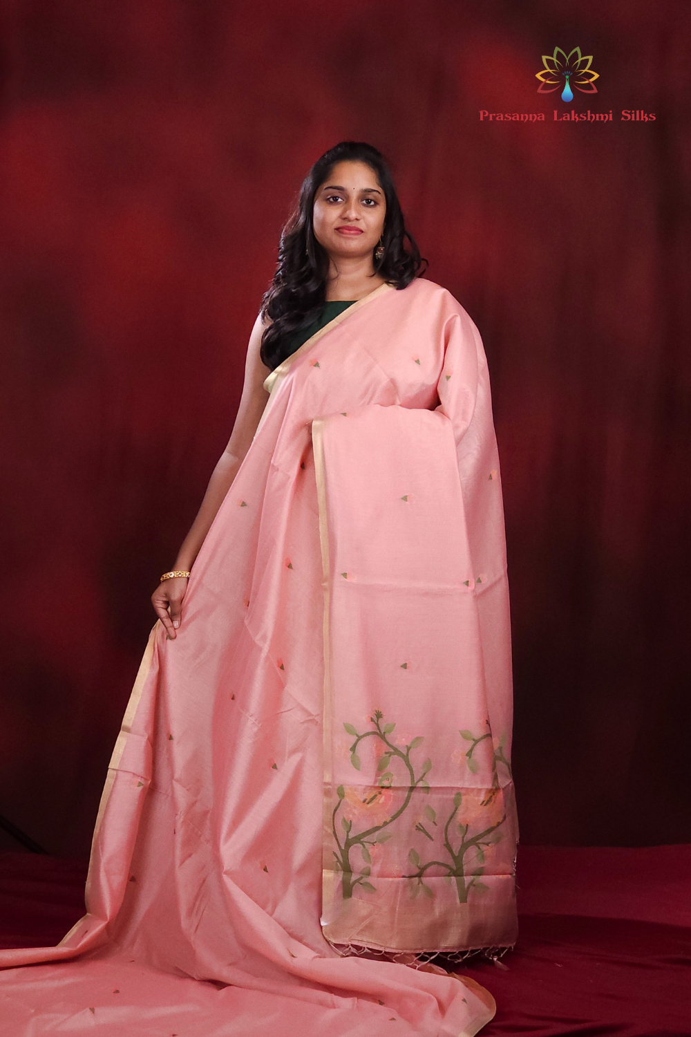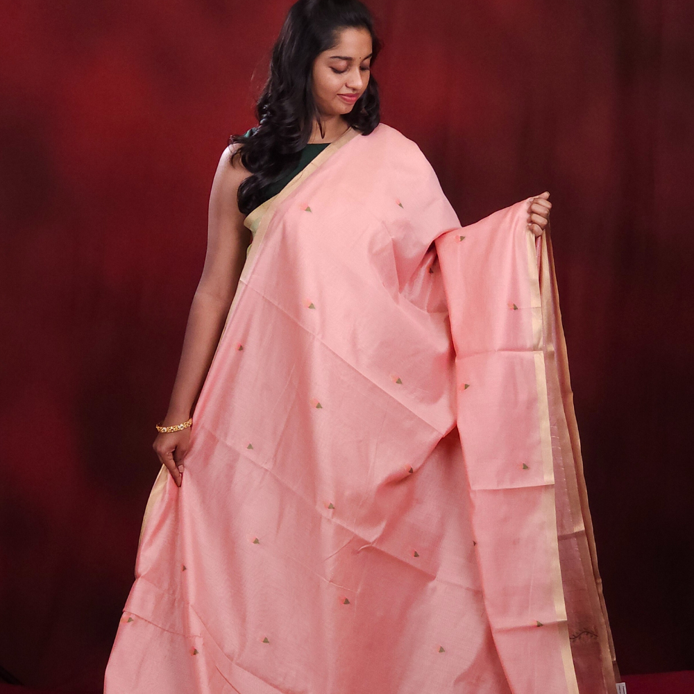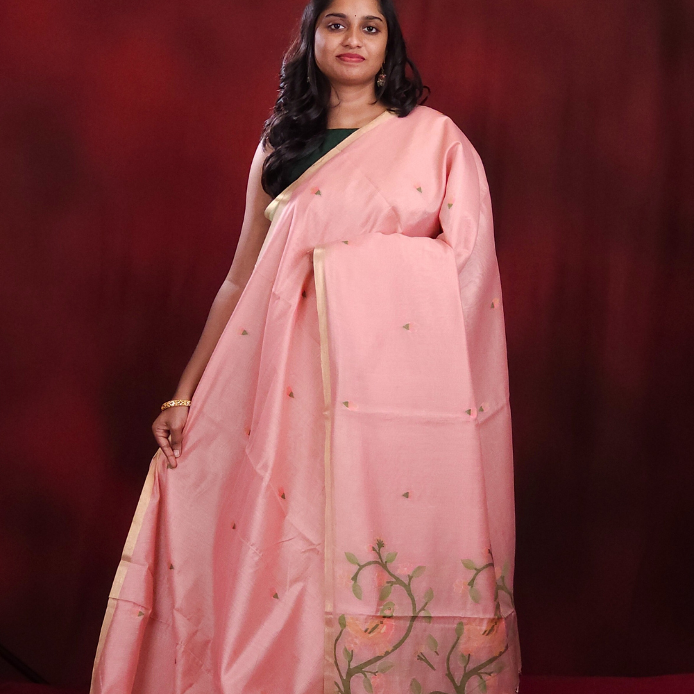 Experience the elegance of our Chanderi silk cotton saree, allover Floral motifs with 1inch jari borders and beautiful Jhamdhani weaving pallu ,with tassel paired with Running blouse....