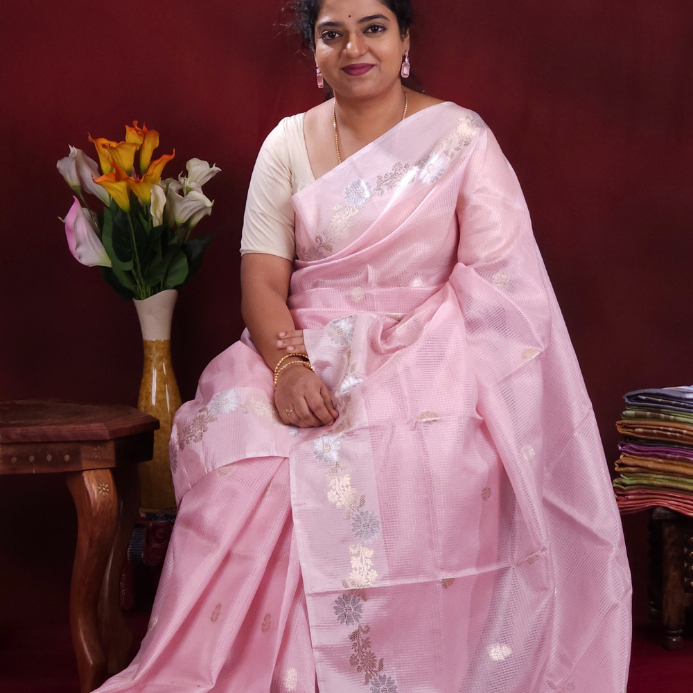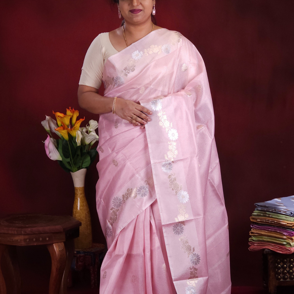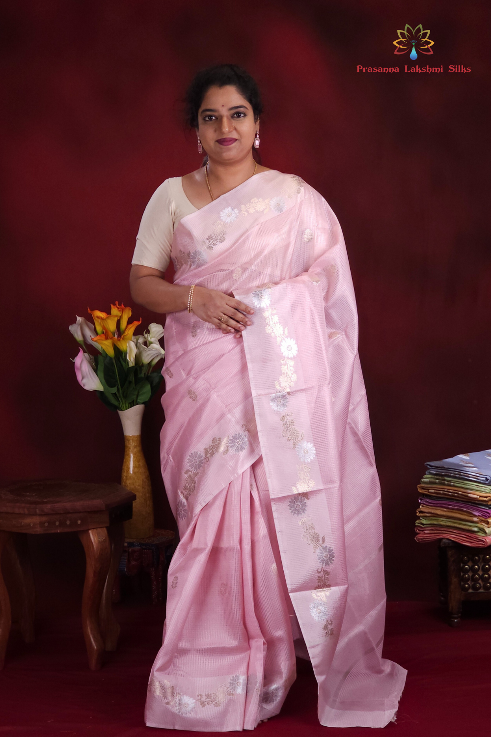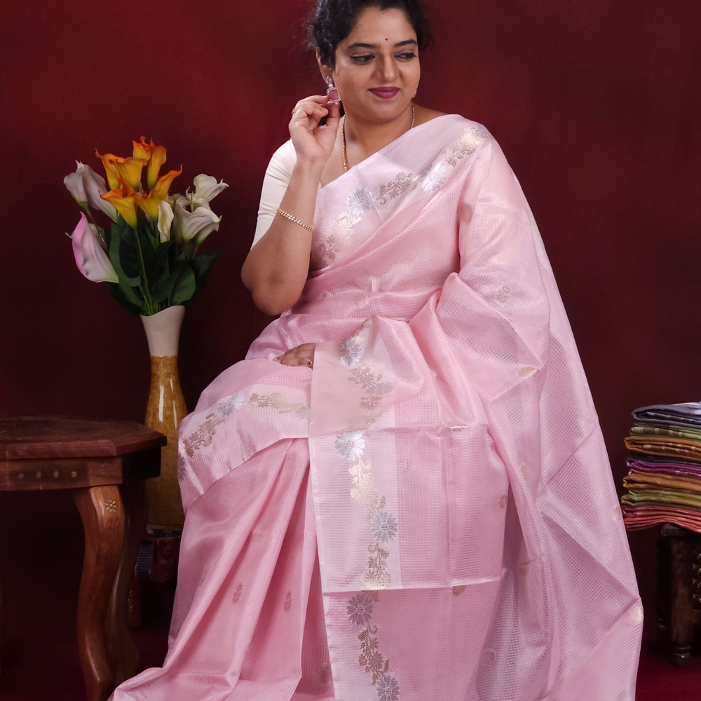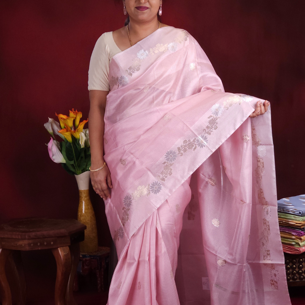 Experience the grandeur of Kota checks saree allover tiny checks with zari-woven motifs and small floral creeper-style borders in gold and silver zari with simple pallu and running blouse.....
