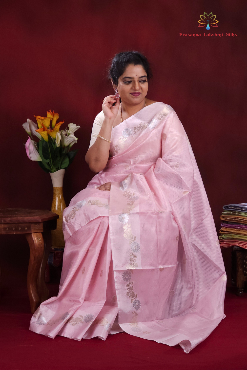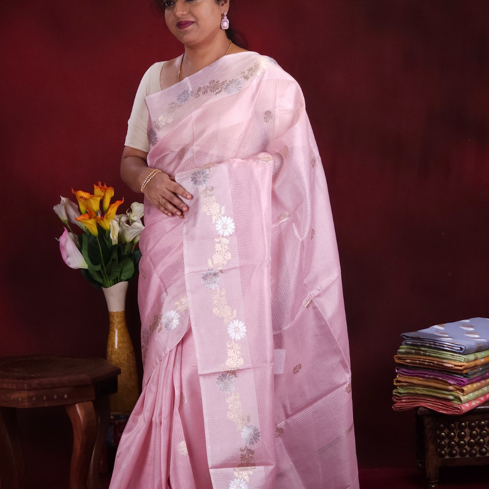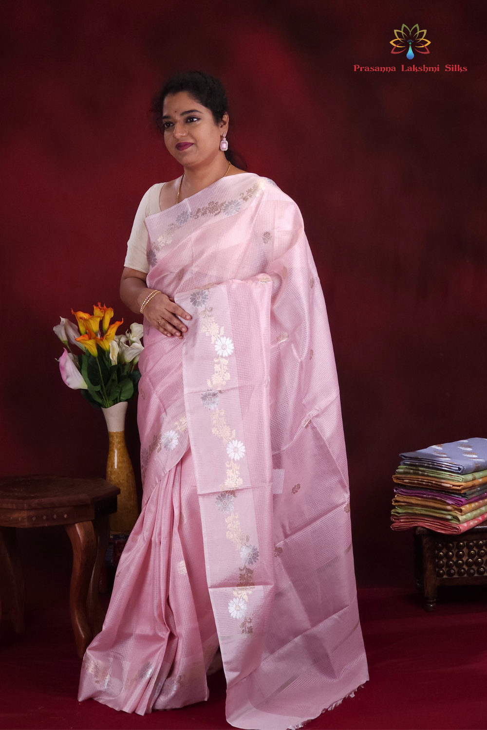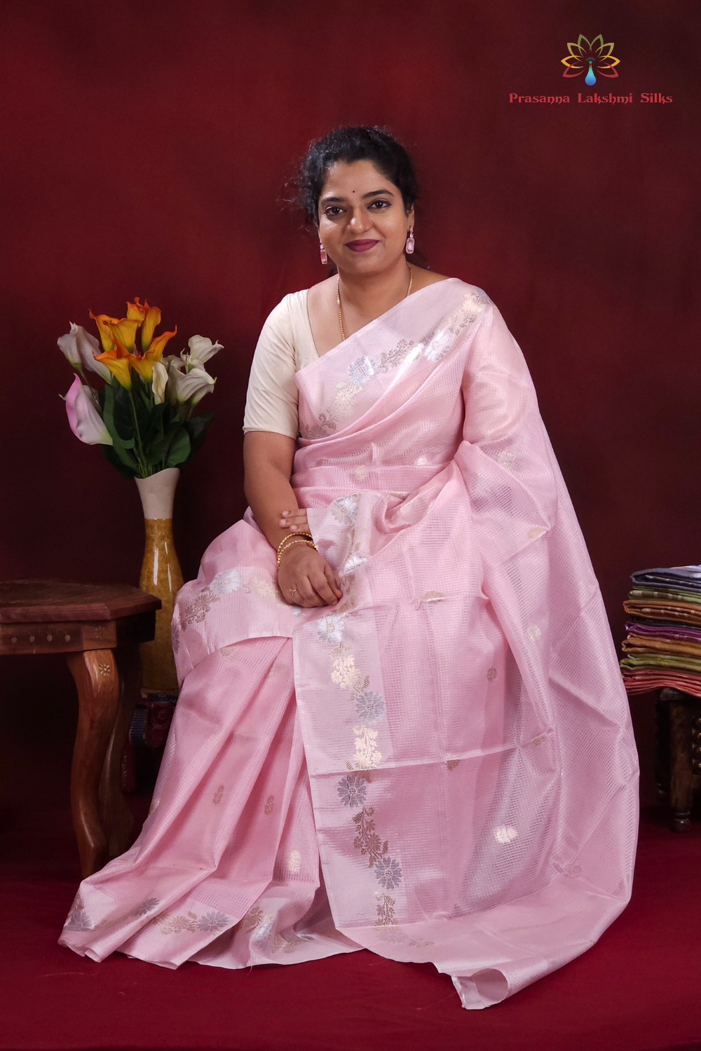 Experience the grandeur of Kota checks saree allover tiny checks with zari-woven motifs and small floral creeper-style borders in gold and silver zari with simple pallu and running blouse.....