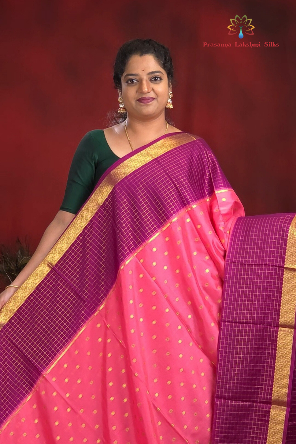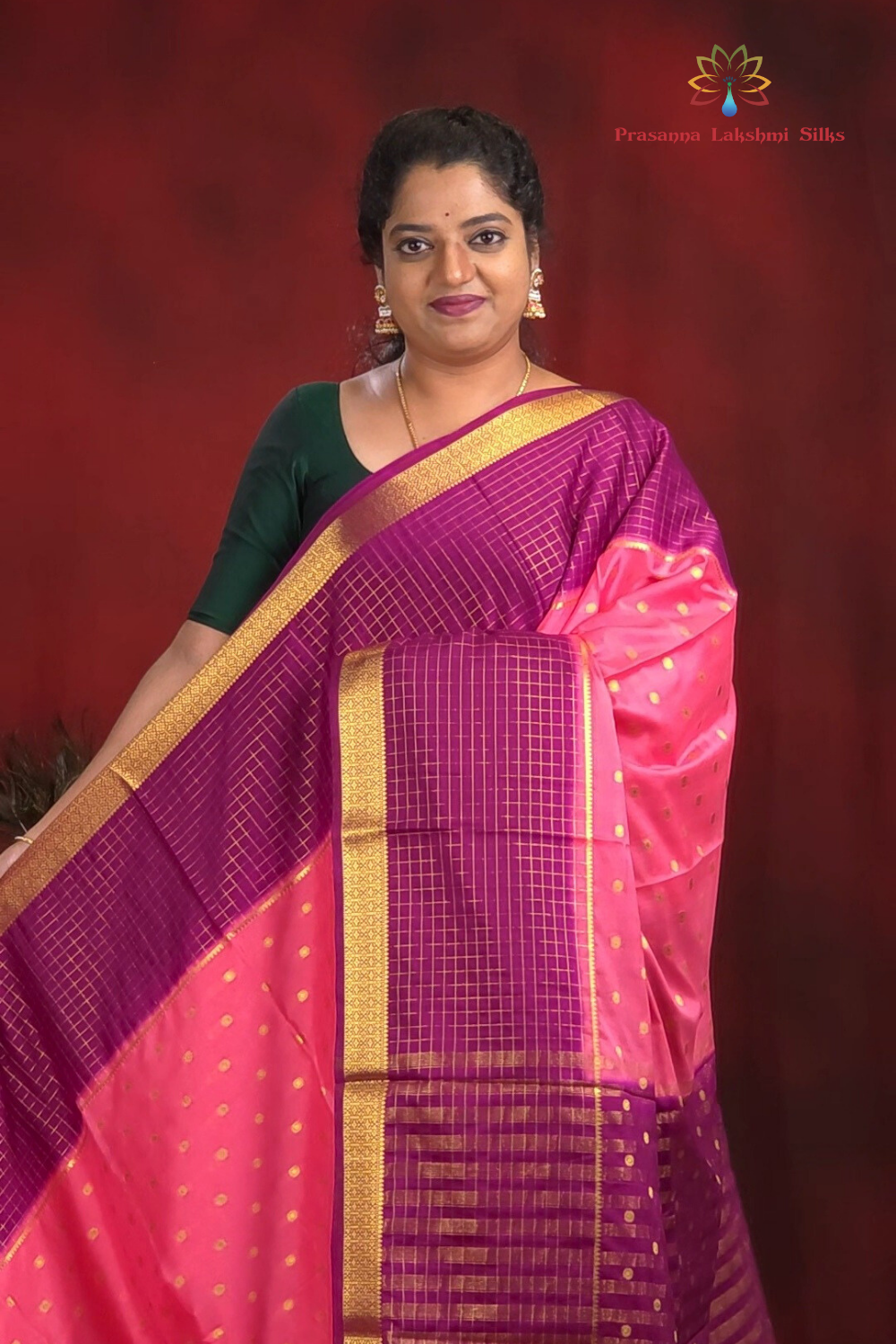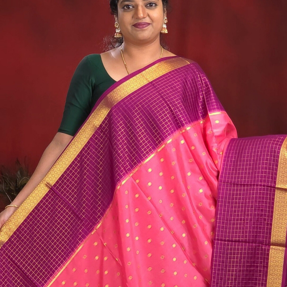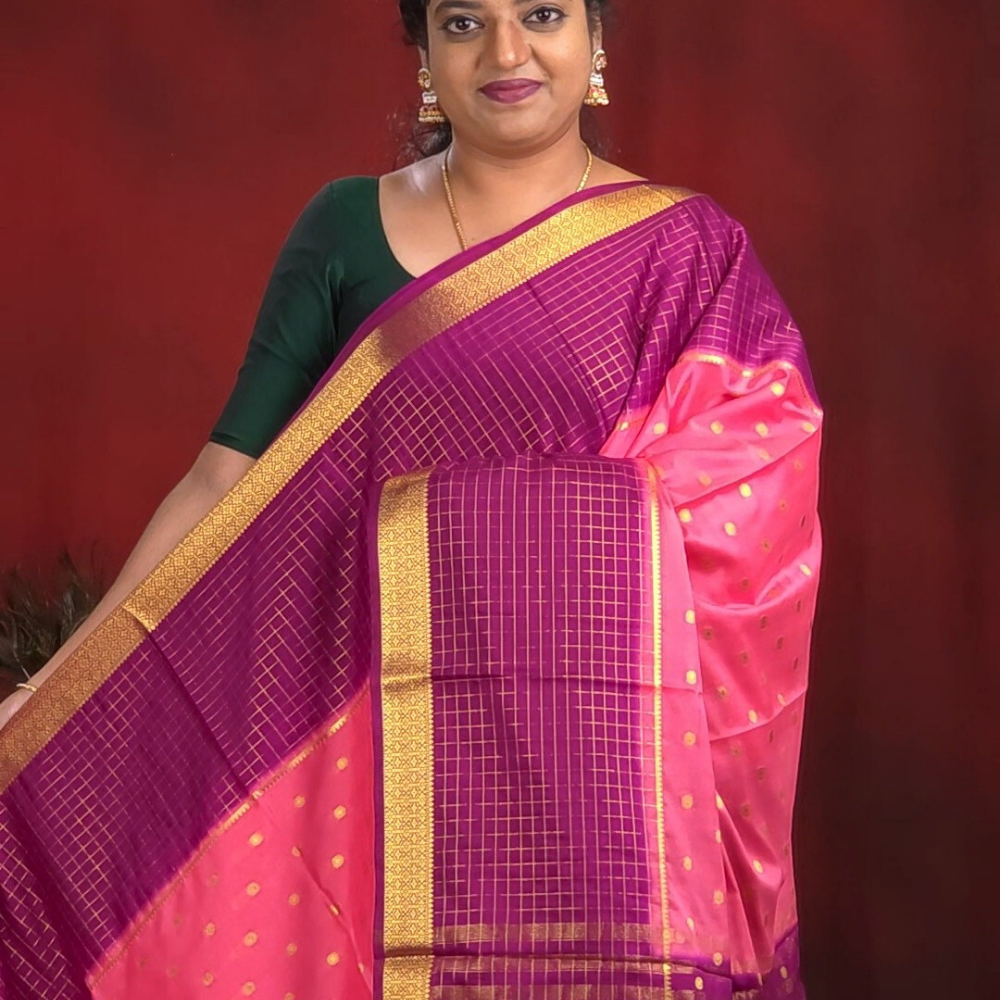 Experience the richness of Semi Mysore silk saree with zari woven motifs all over the saree, complemented by contrast checks borders, paired with contrast tissue stripe pallu and contrast blouse with zari woven motifs.....