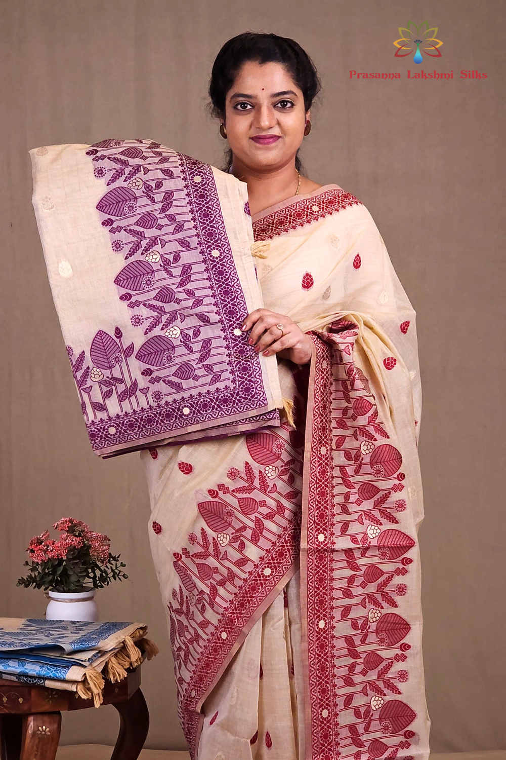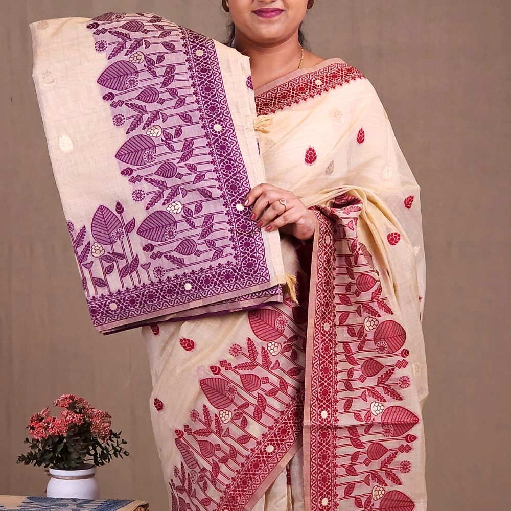 Experience the elegance of our Chanderi silk cotton saree, allover floral and zari buttas with Contrast big floral bunches pallu with tassels paired with running blouse....