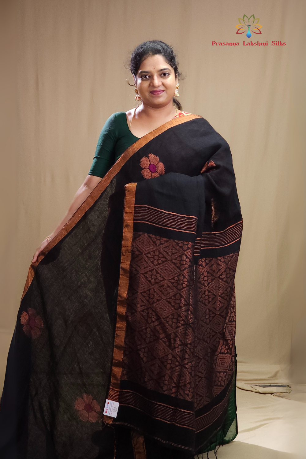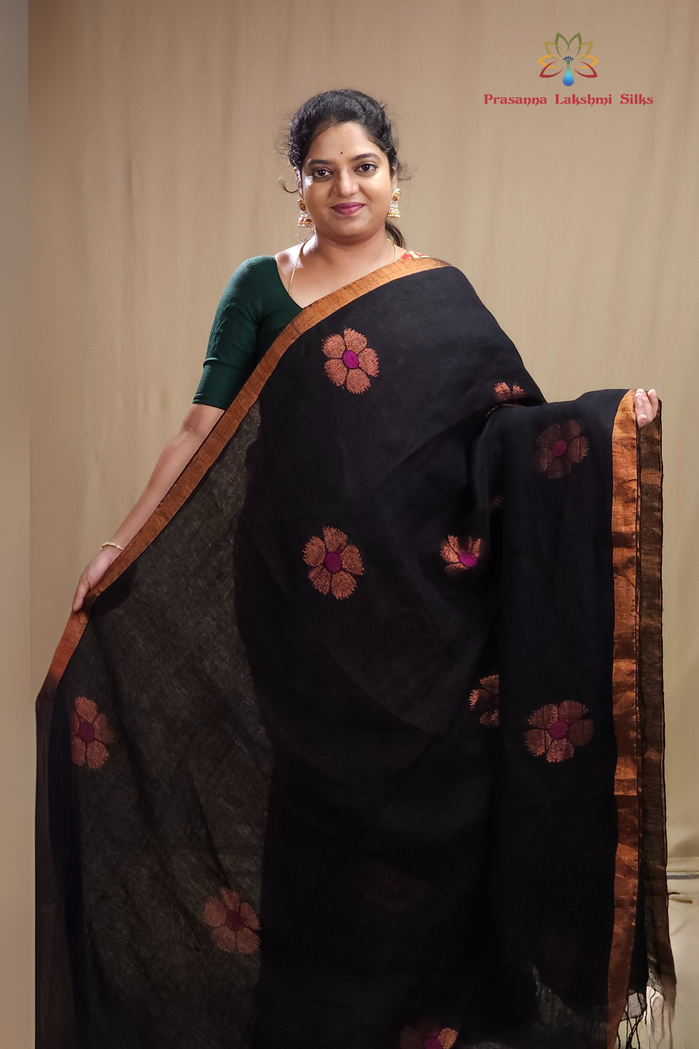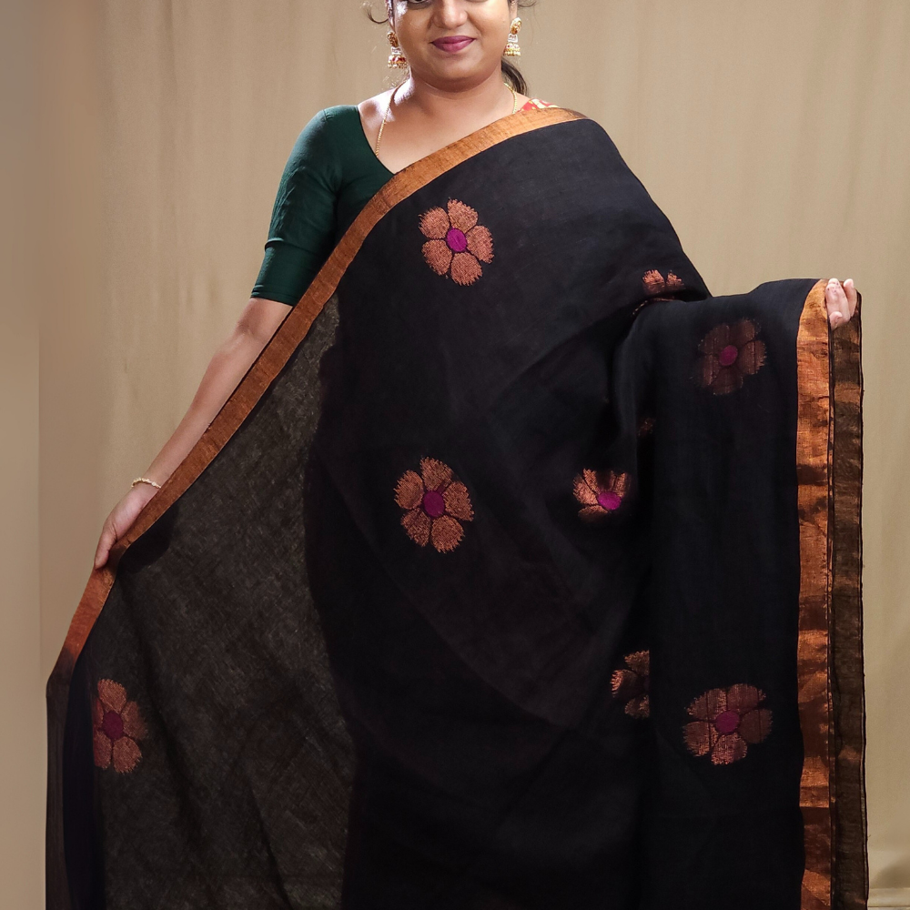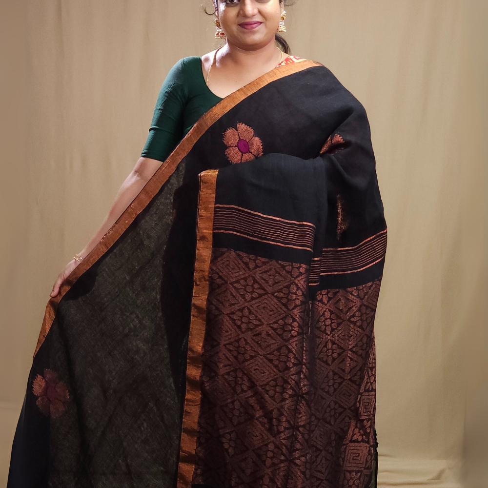 Exquisite Pure Linen Sarees featuring intricate Jamdhani floral motifs all over the body, with subtle Meenakari detailing for a touch of elegance. A sleek 1-inch zari border with rich brocade pallu paired with a running blouse for a complete graceful look.....