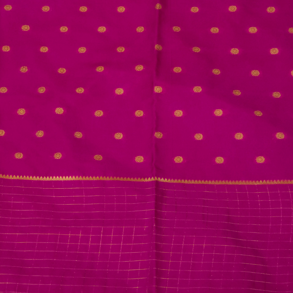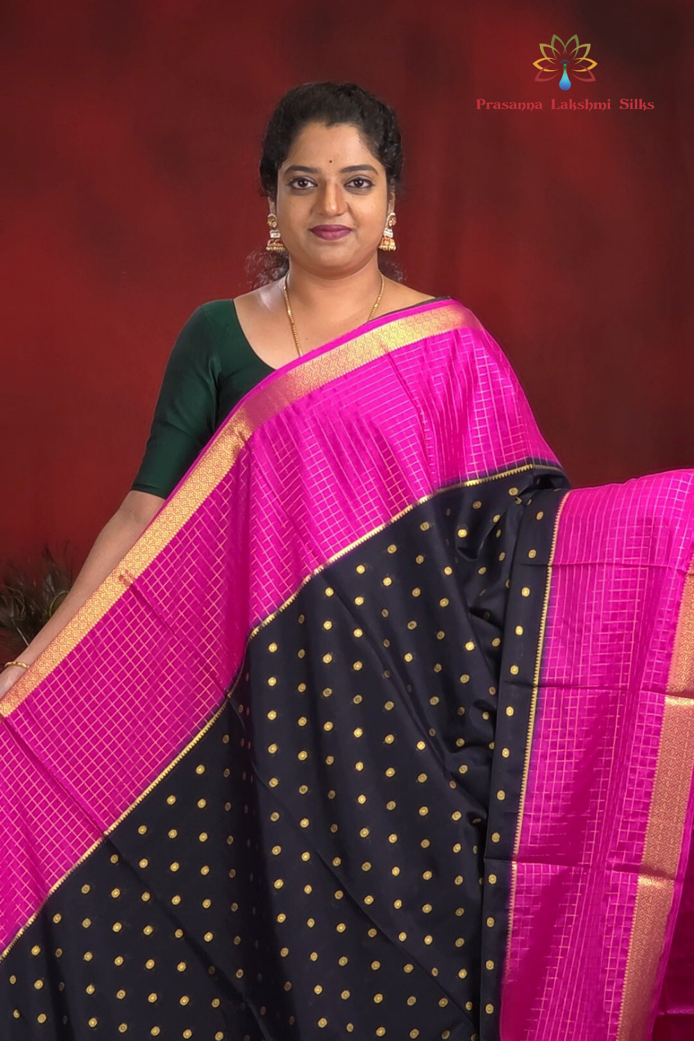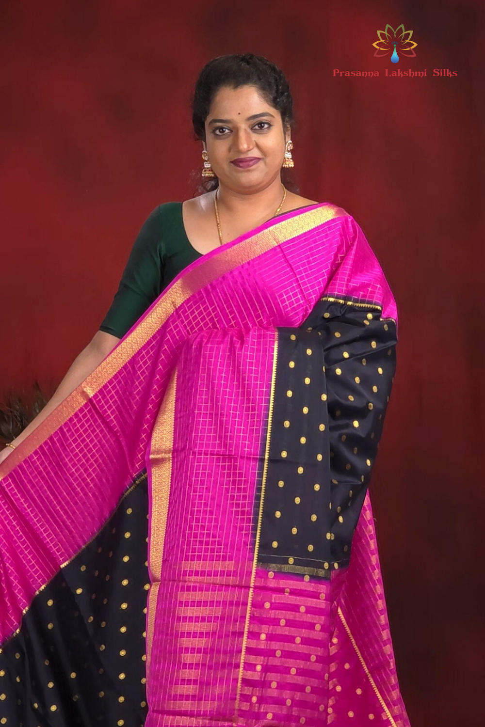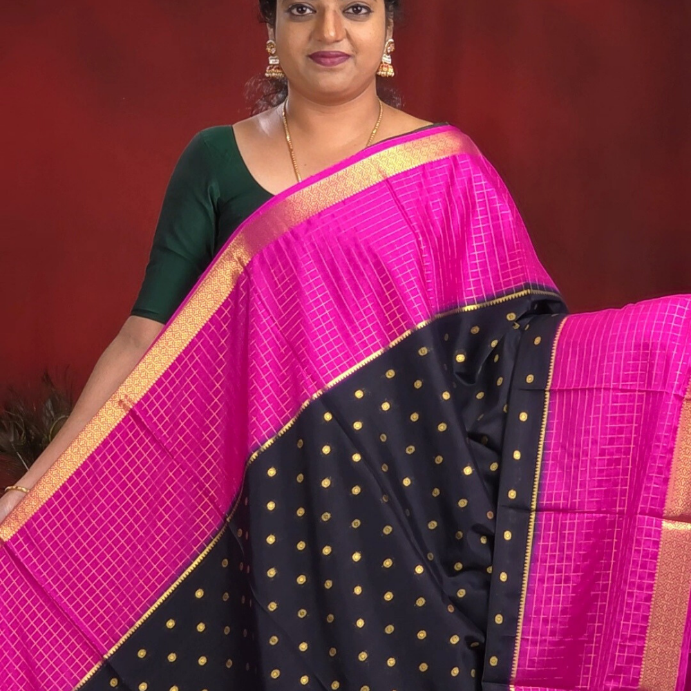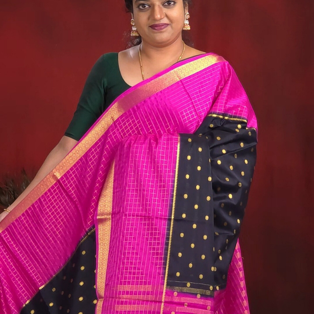 Experience the richness of Semi Mysore silk saree with zari woven motifs all over the saree, complemented by contrast checks borders, paired with contrast tissue stripe pallu and contrast blouse with zari woven motifs.....