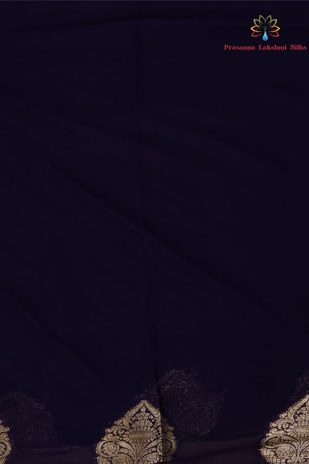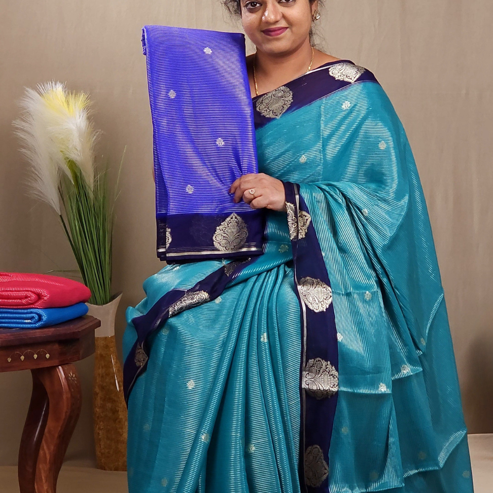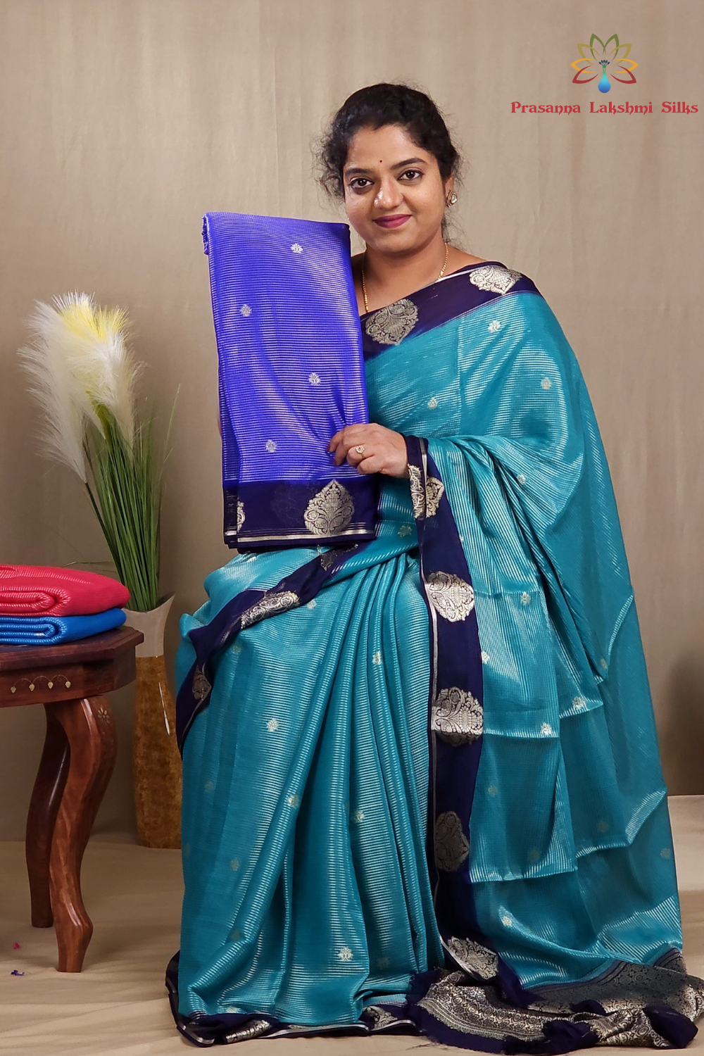 Elegant chiffon sarees with allover horizontal zari stripes, small zari woven motifs, contrast zari floral borders and paired with matching blouse