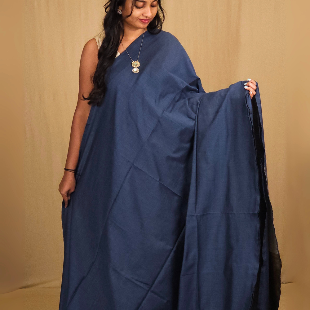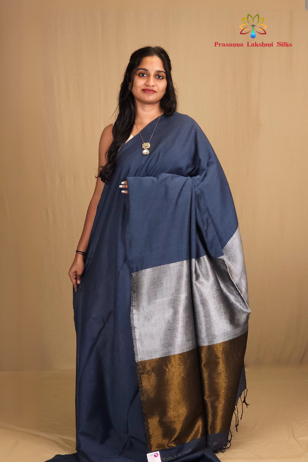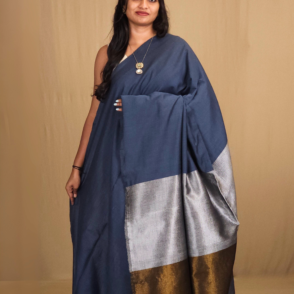 Discover the elegance of our Khadi Cotton Saree, featuring a plain body paired with contrast gold & silver pallu finished with tassels paired with a running blouse.....