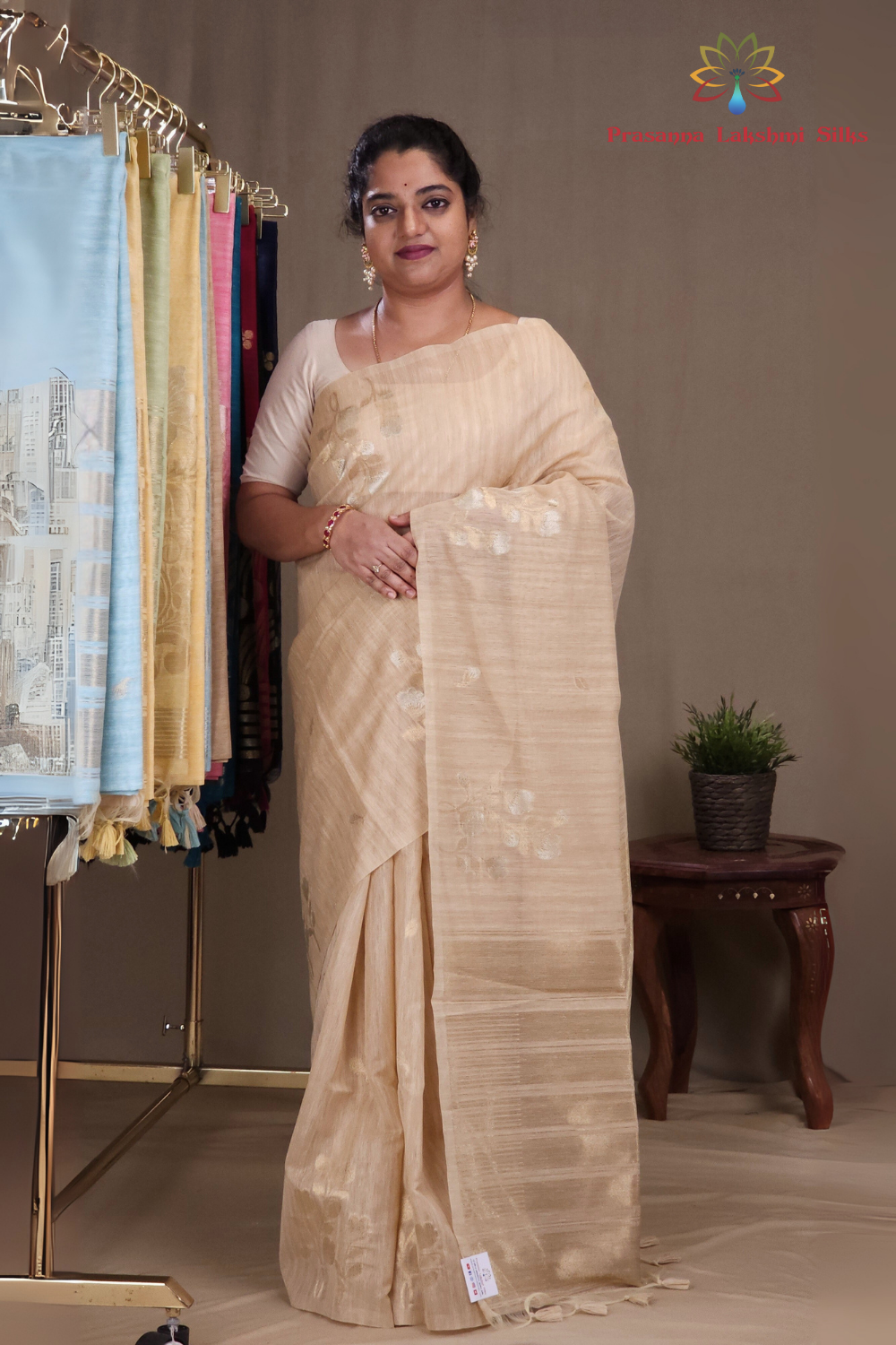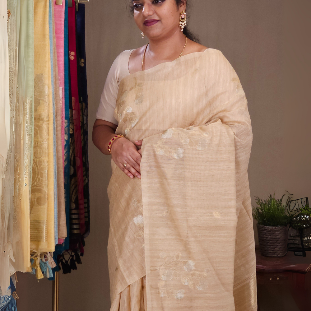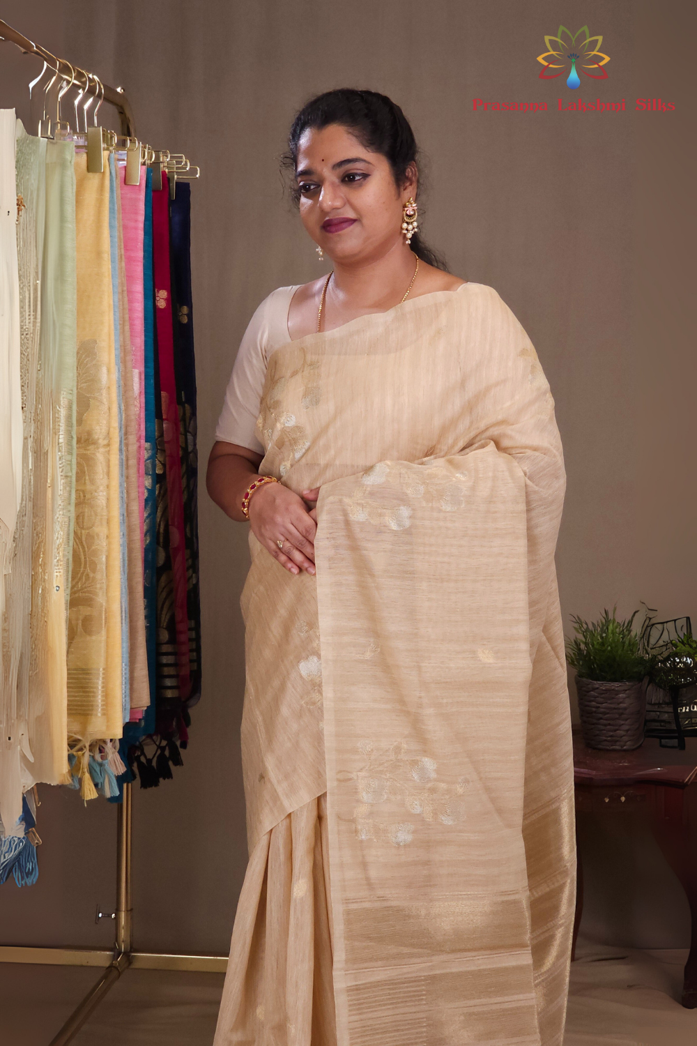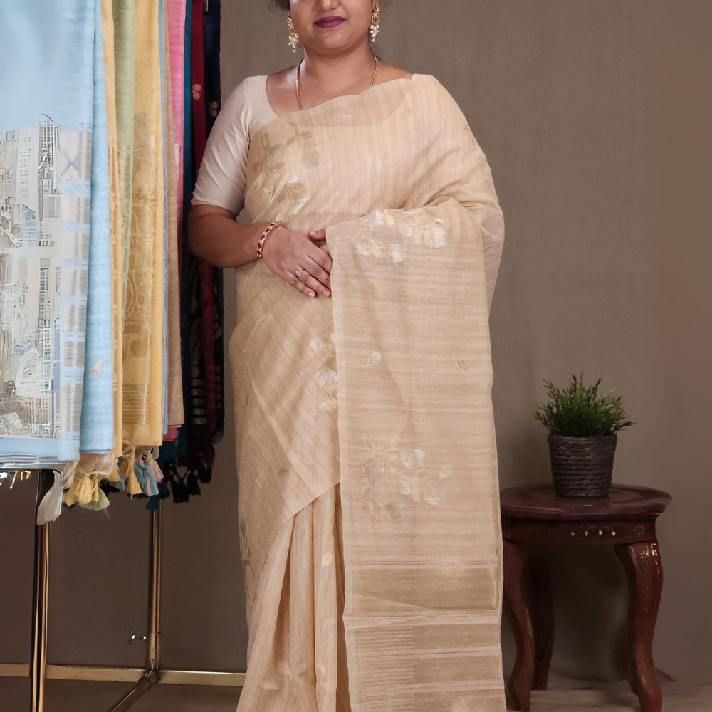 Experience the elegance of our Chanderi Dupion saree, allover gold and silver floral zari motifs , gold brocade pallu with tassels paired with running blouse....