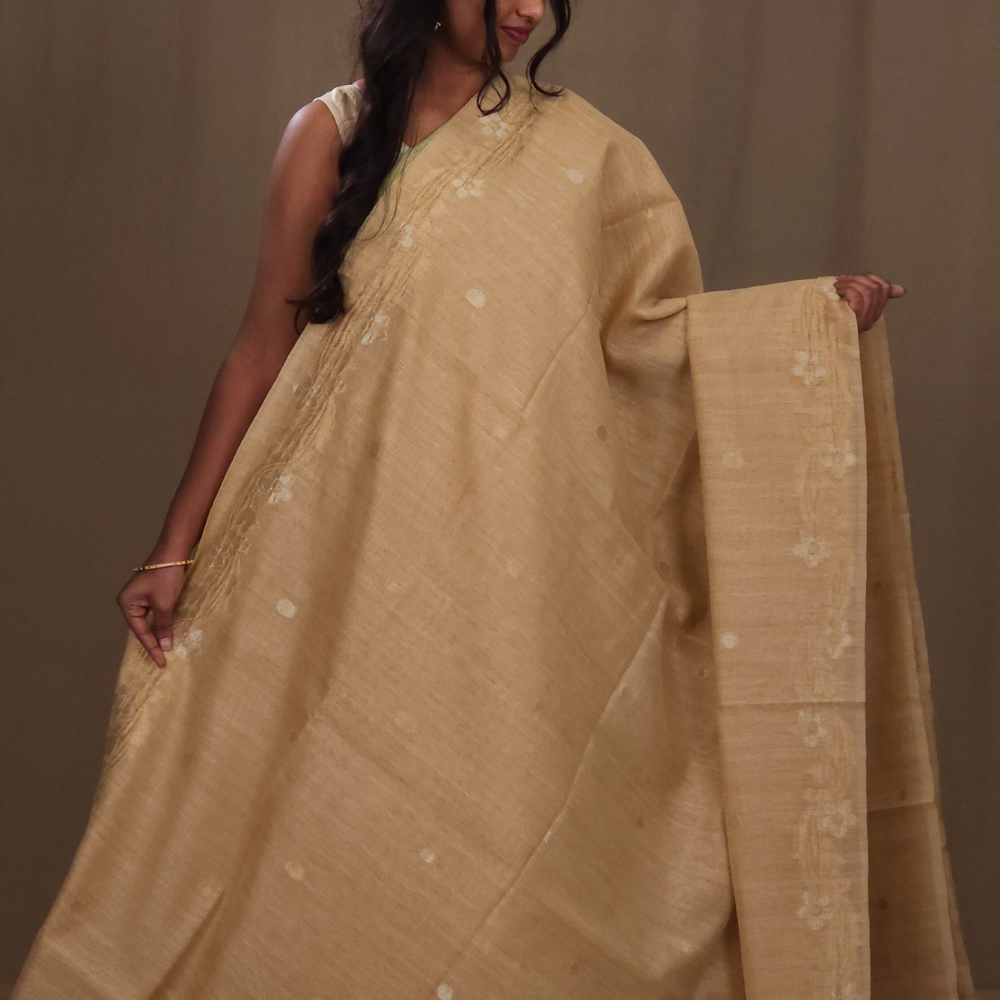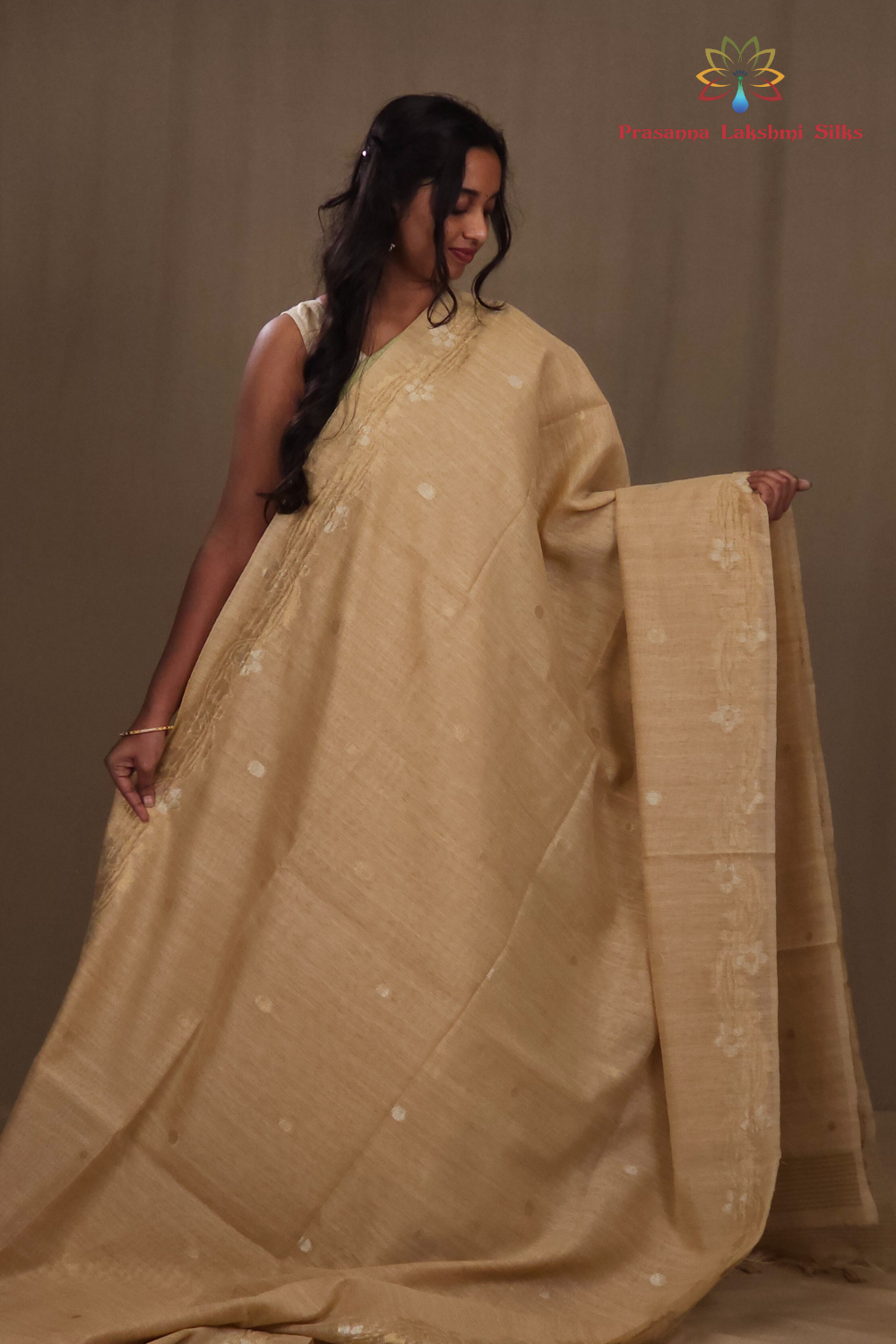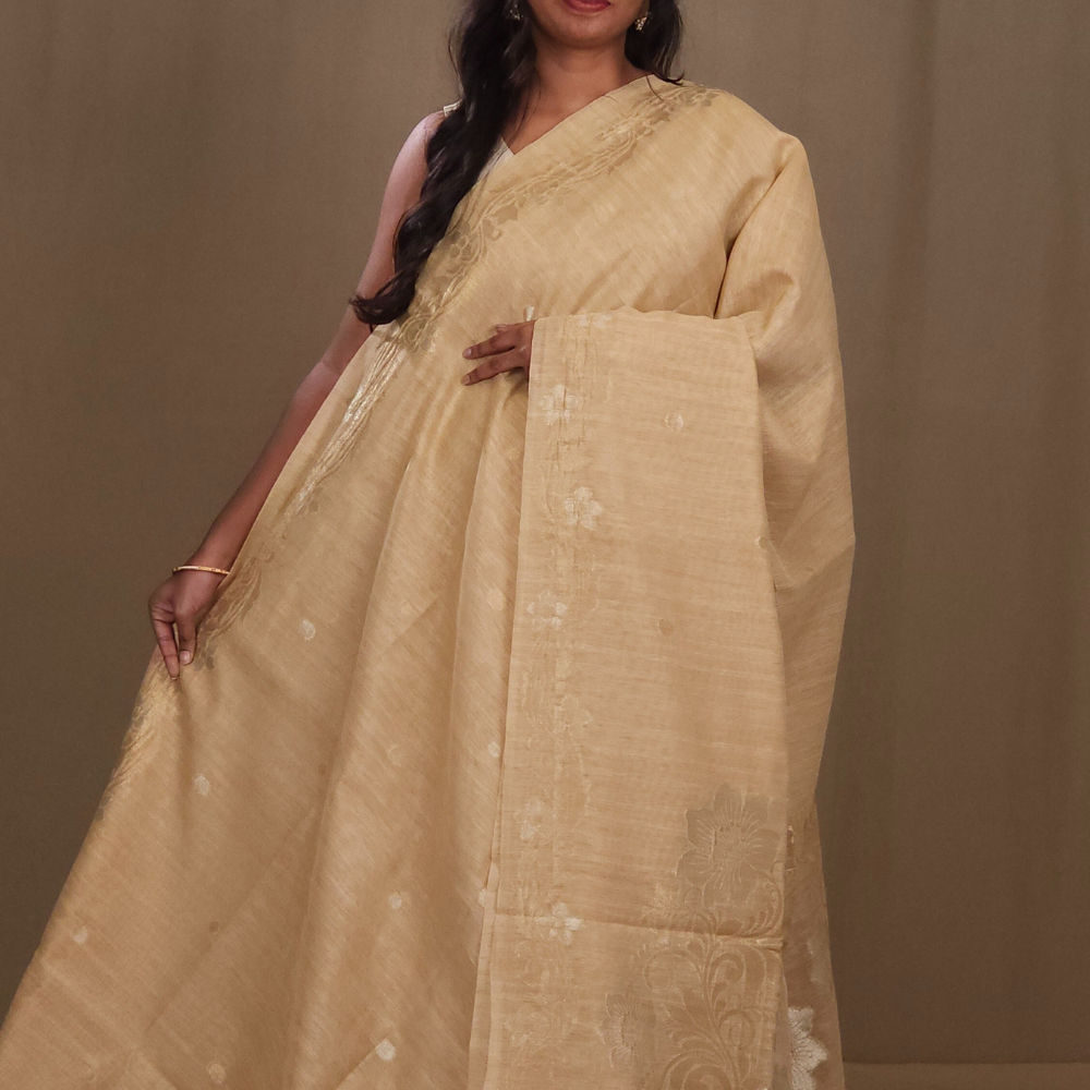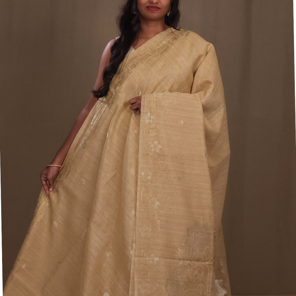 Experience the elegance of our Chanderi Dupion saree, allover zari motifs with gold and silver zari woven borders , gold and silver big floral bunches pallu with tassels paired with contrast blouse....