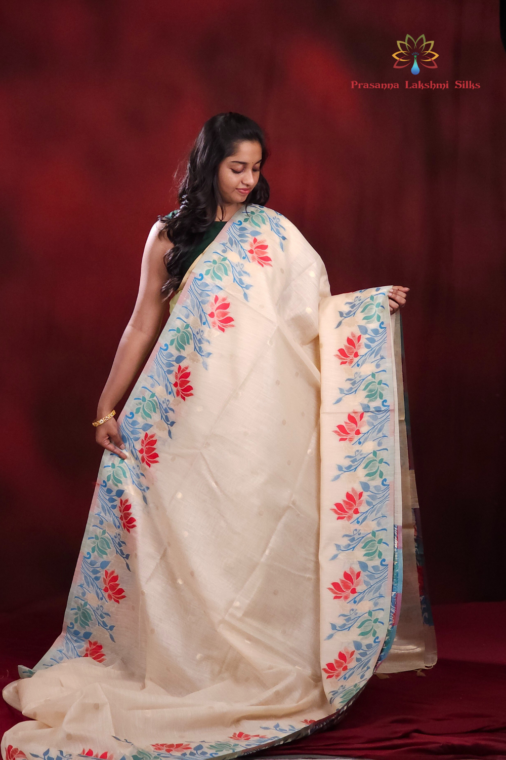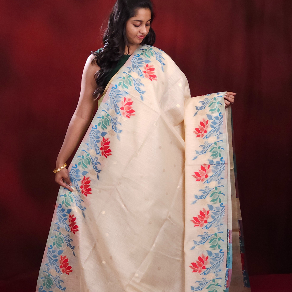 Timeless grace of our Chanderi Silk Cotton Saree, adorned with elegant meenakari motifs across the body. A vibrant meenakari pallu finished with delicate tassels, paired beautifully with a running blouse.....