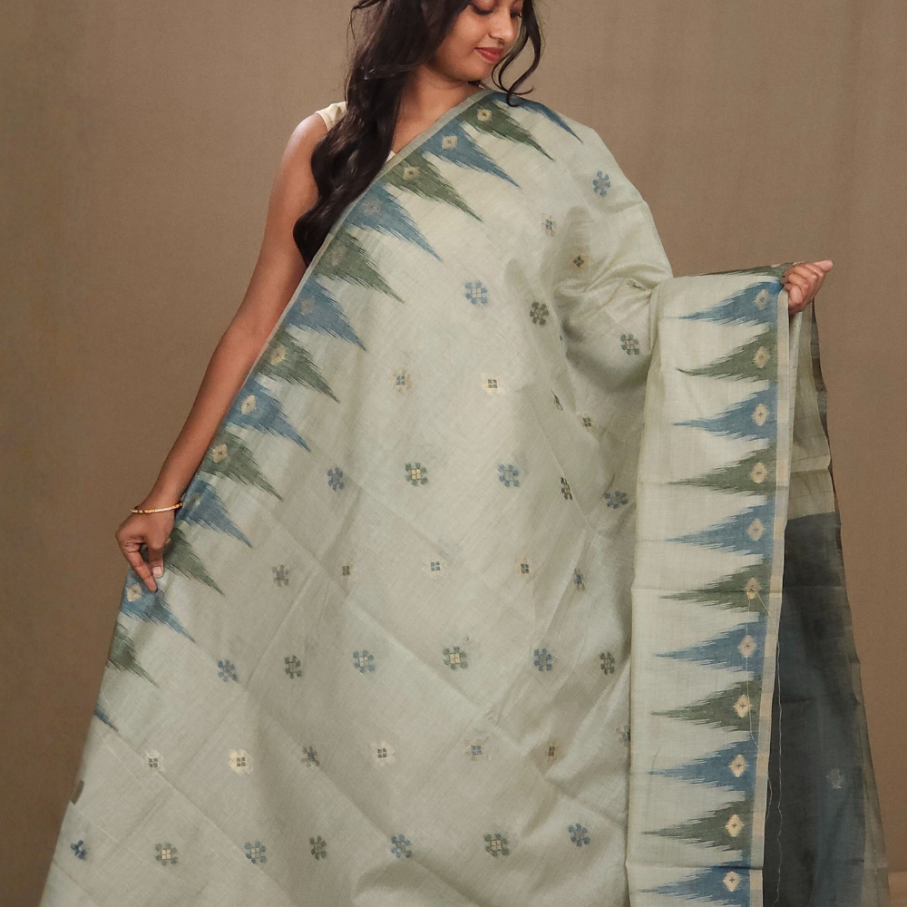 Experience the elegance of our Chanderi silk cotton saree, allover floral and zari buttas with Contrast temple borders pallu with tassels paired with contrast blouse....
