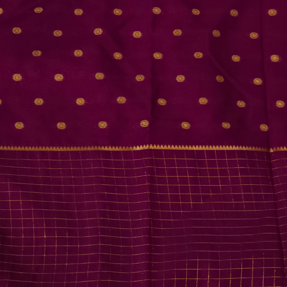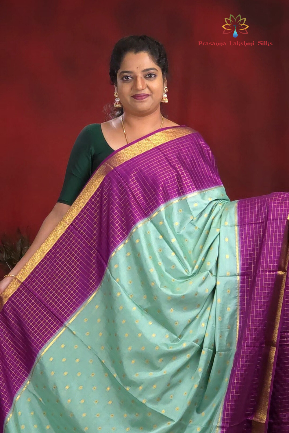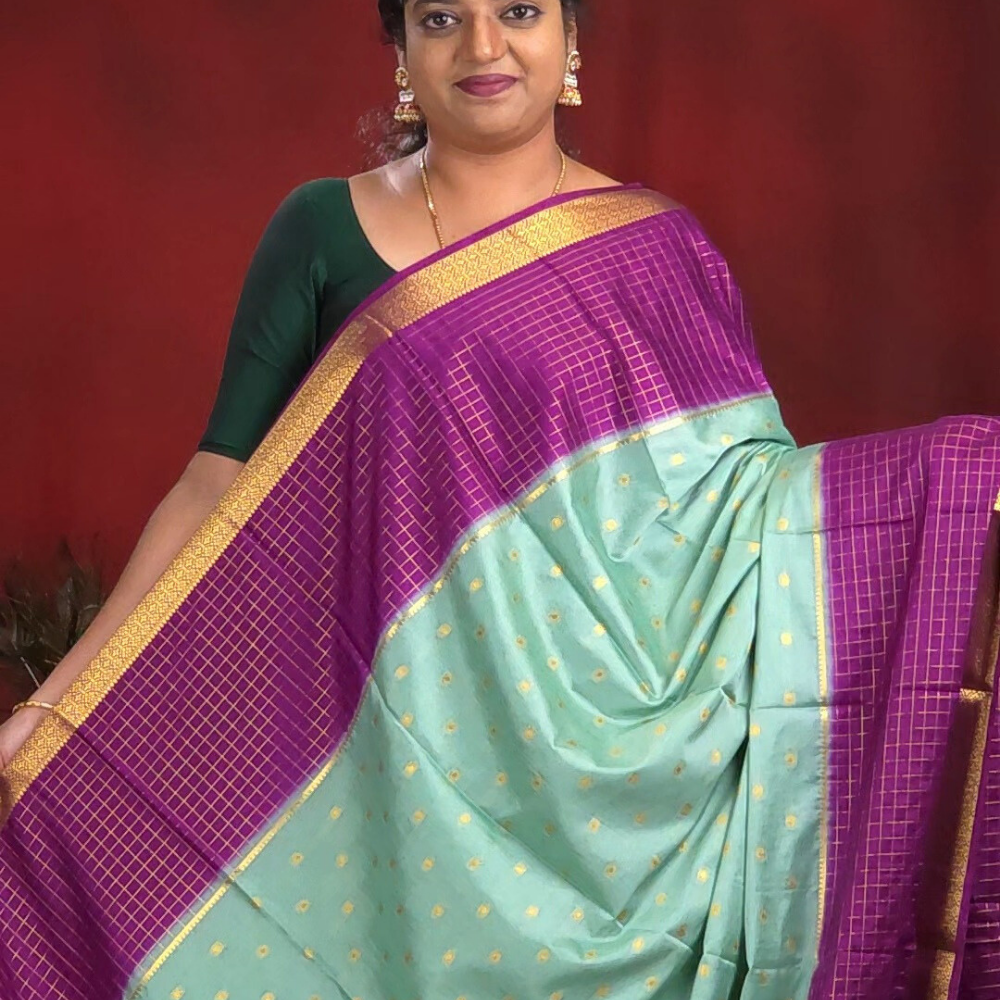 Experience the richness of Semi Mysore silk saree with zari woven motifs all over the saree, complemented by contrast checks borders, paired with contrast tissue stripe pallu and contrast blouse with zari woven motifs.....