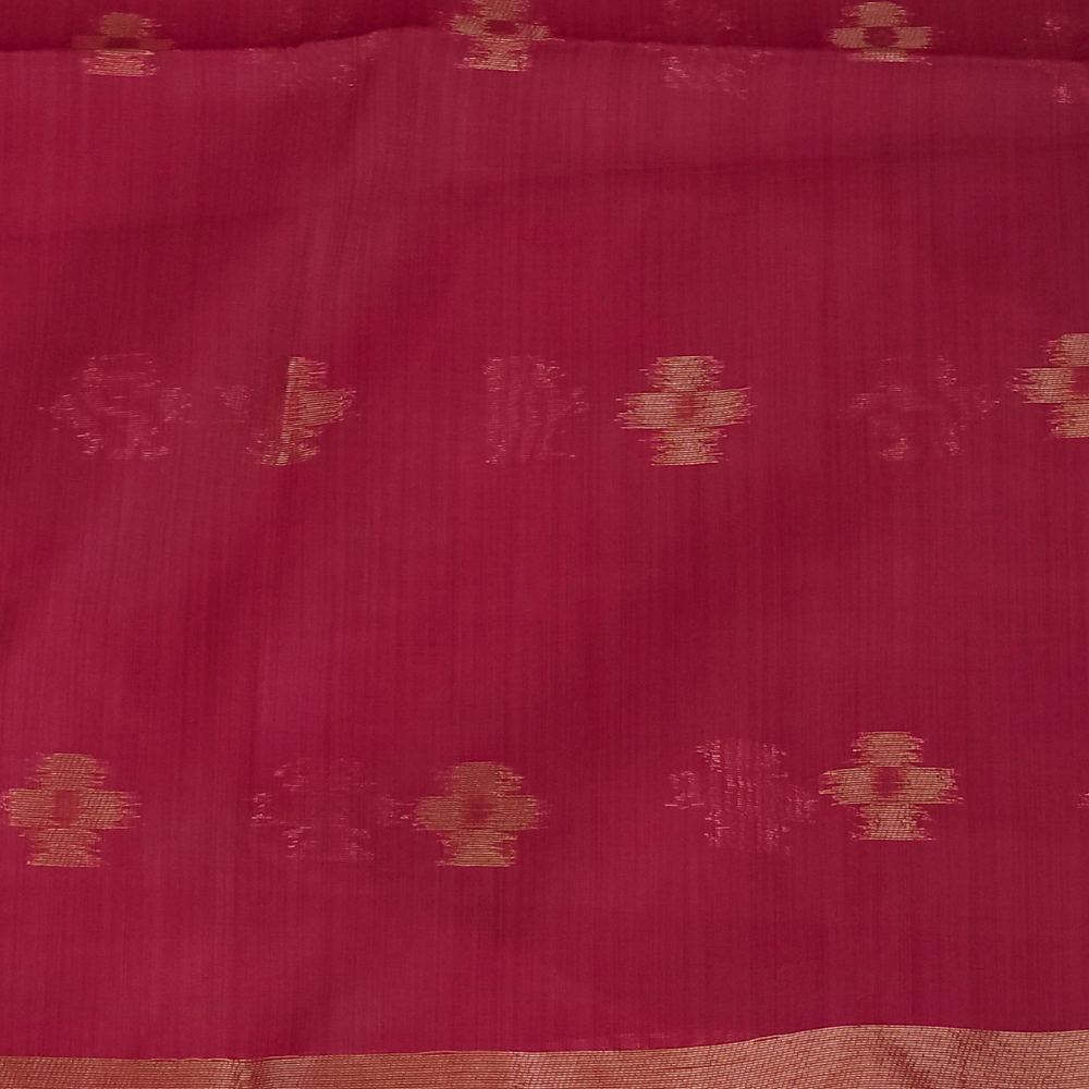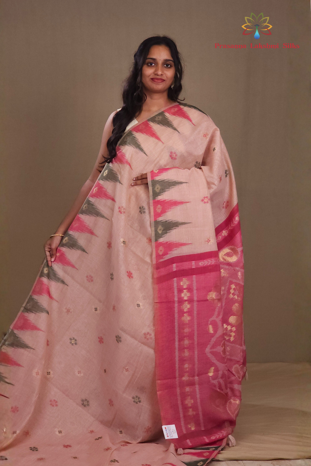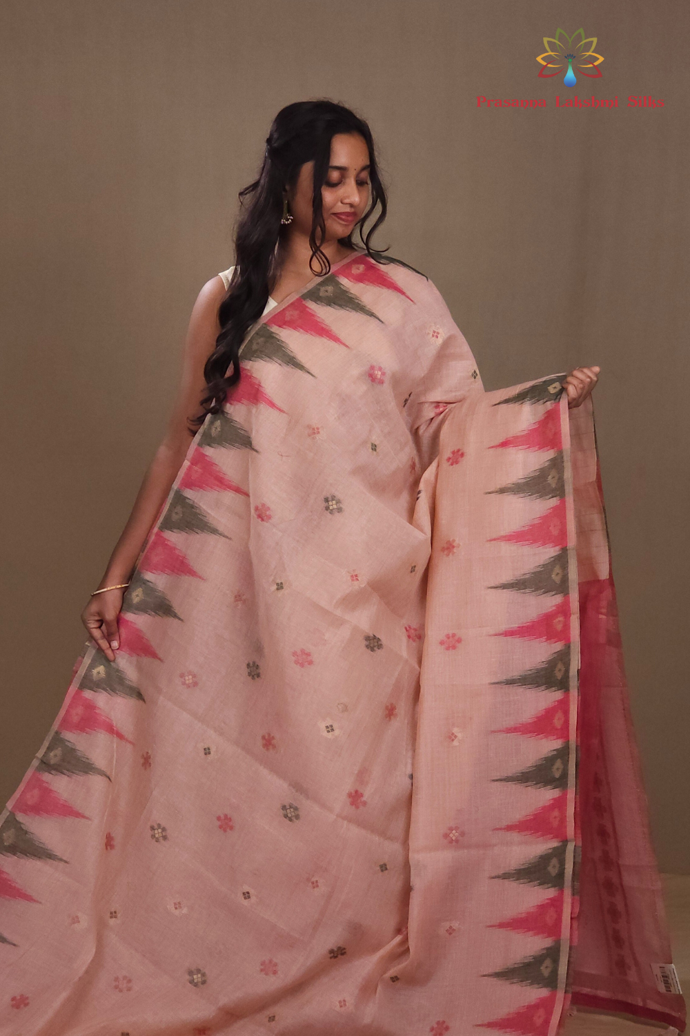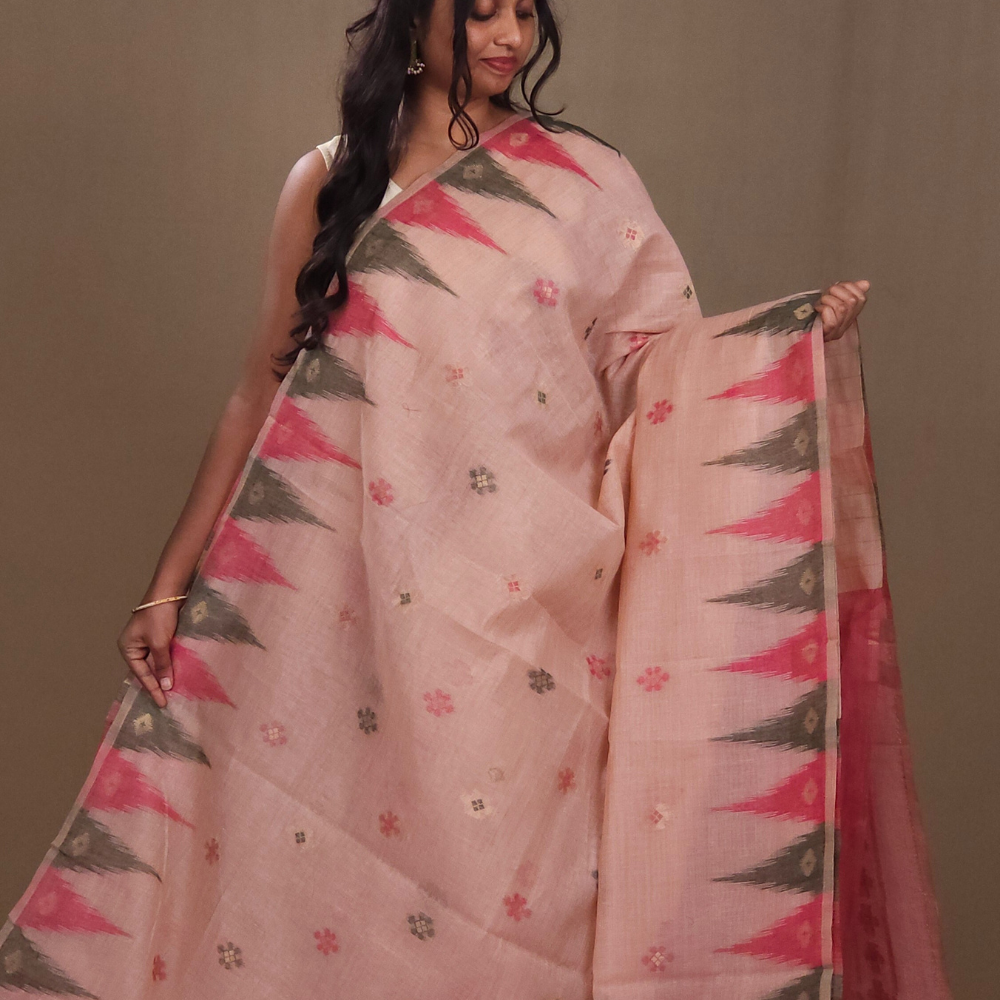 Experience the elegance of our Chanderi silk cotton saree, allover floral and zari buttas with Contrast temple borders pallu with tassels paired with contrast blouse....