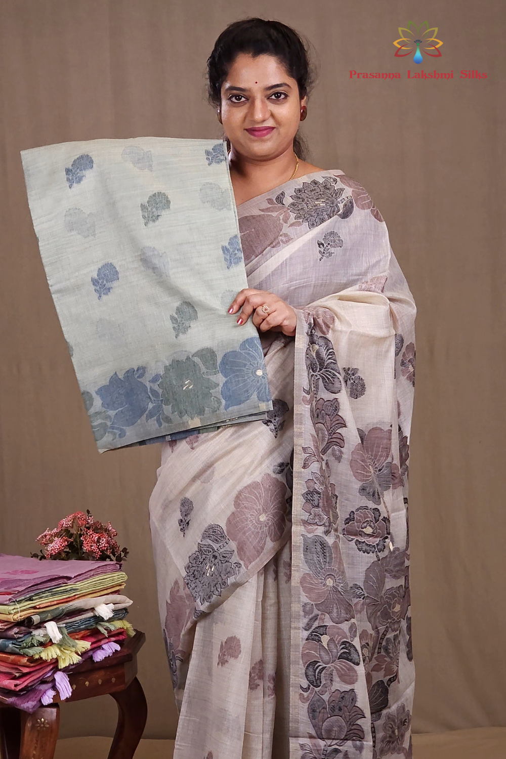 Experience the elegance of our Chanderi silk cotton saree, allover floral and zari buttas with Contrast big floral bunches pallu with tassels paired with contrast blouse....