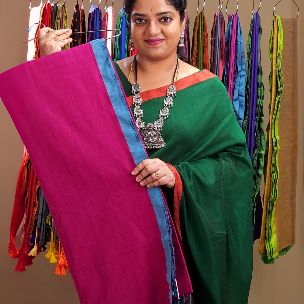 Discover the elegance of our Khadi Cotton Saree, featuring a plain body paired with contrast color detailing in 1 inch , pallu finished with tassels paired with a running blouse.....
