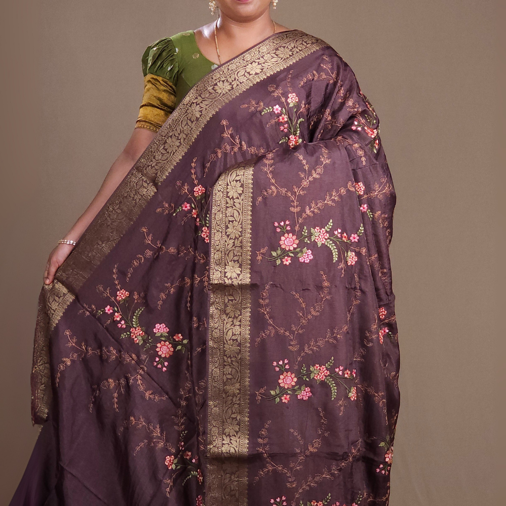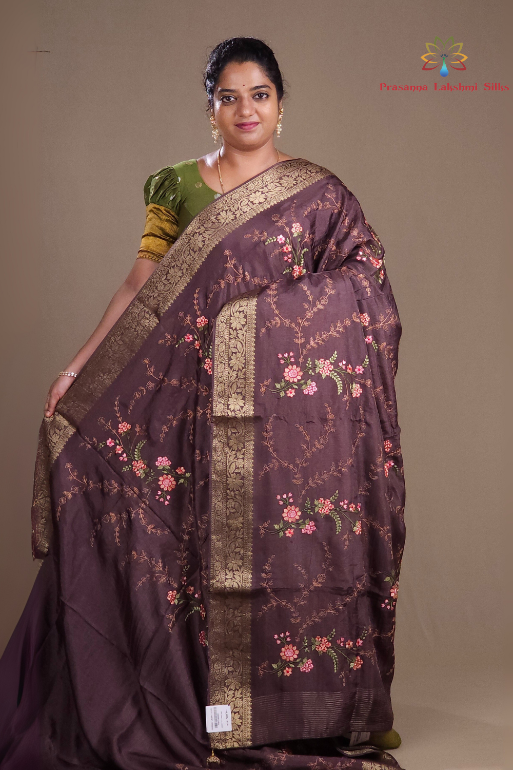 Elegant Crepe silk sarees Allover beautiful thread embroidery zari-woven borders thread-woven pallu finished with beautiful tassels paired with contrast blouse....