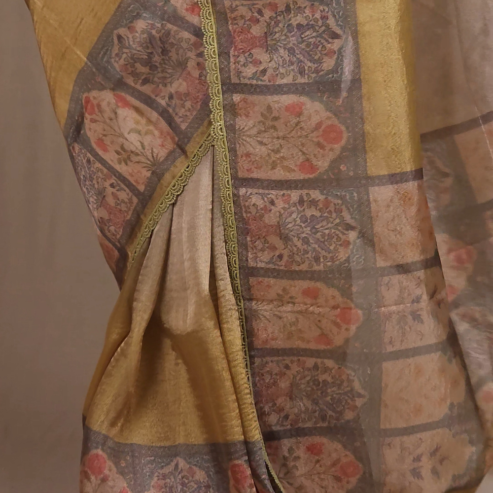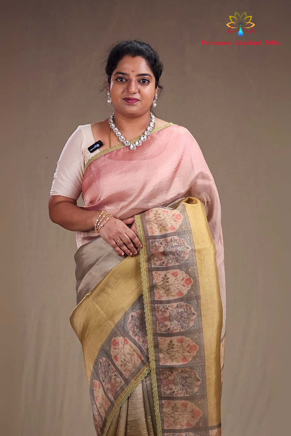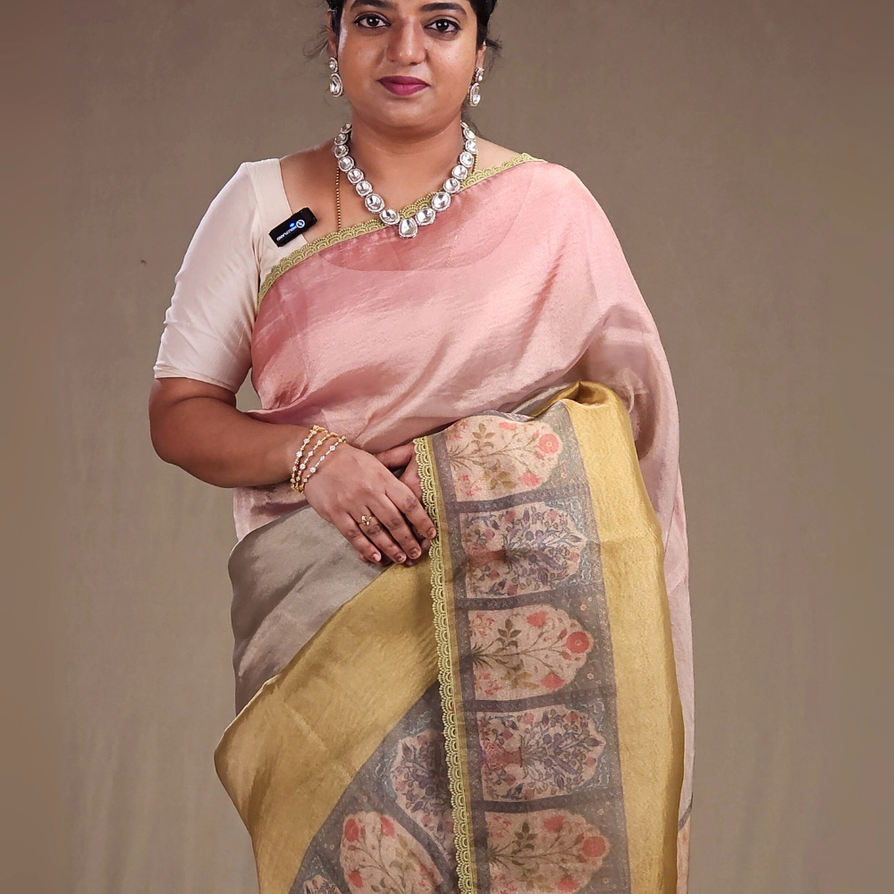 Multi colour Crush Tissue Saree with unique Digital print borders ,dainty lace detailing Rich pallu and Digital pint Blouse.....