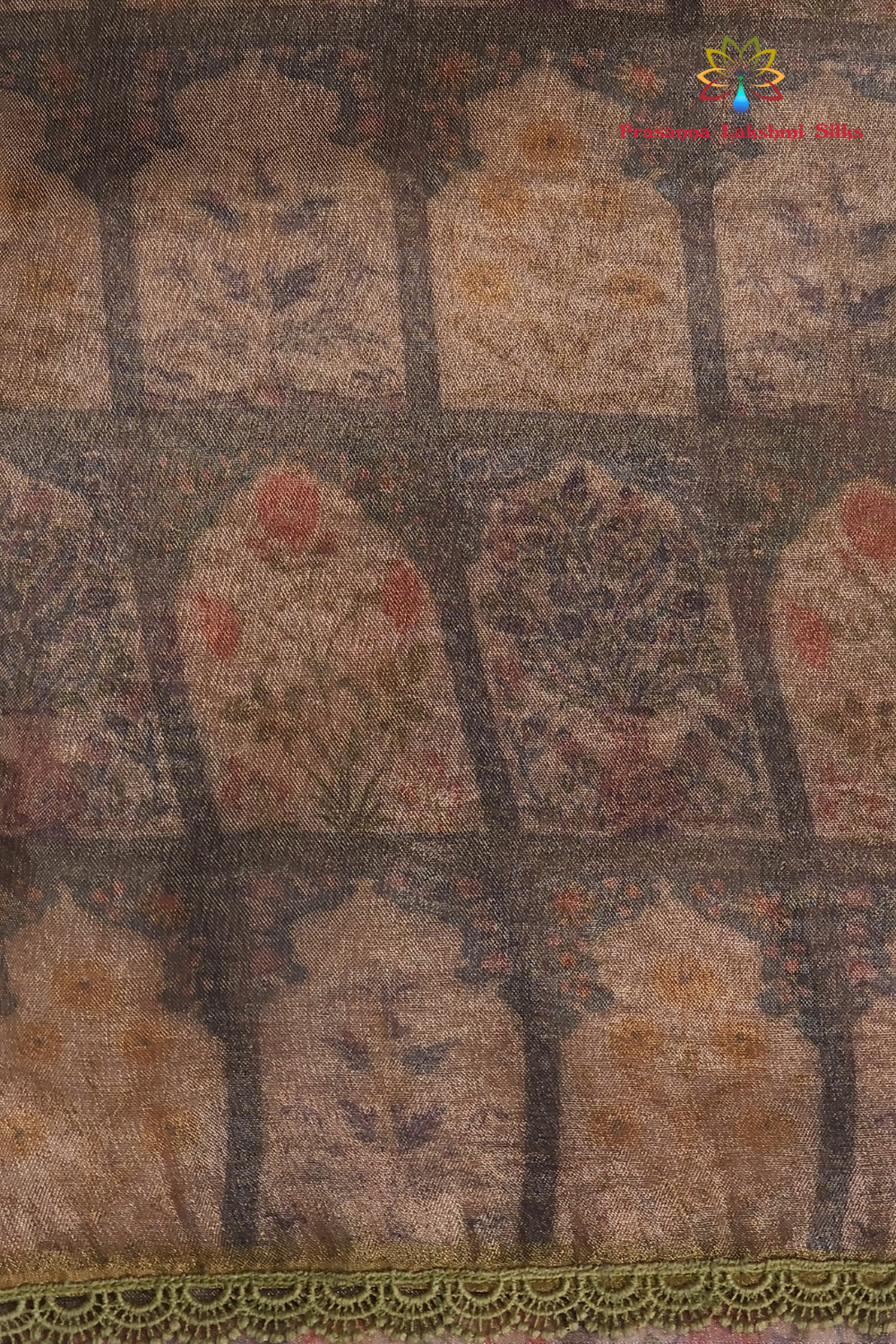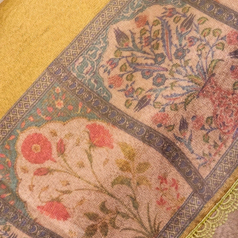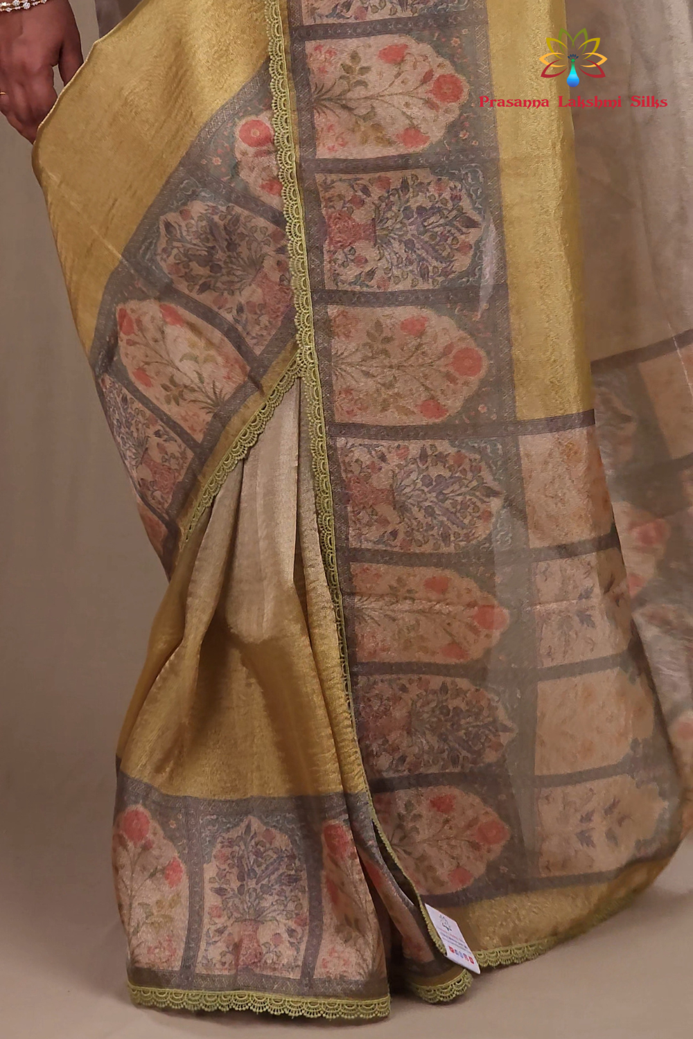 Multi colour Crush Tissue Saree with unique Digital print borders ,dainty lace detailing Rich pallu and Digital pint Blouse.....