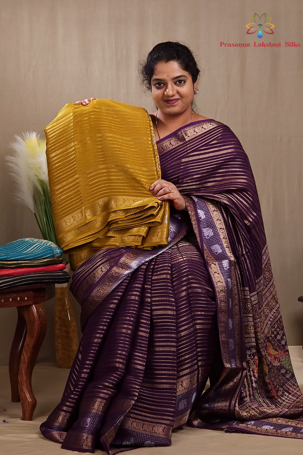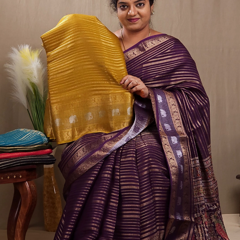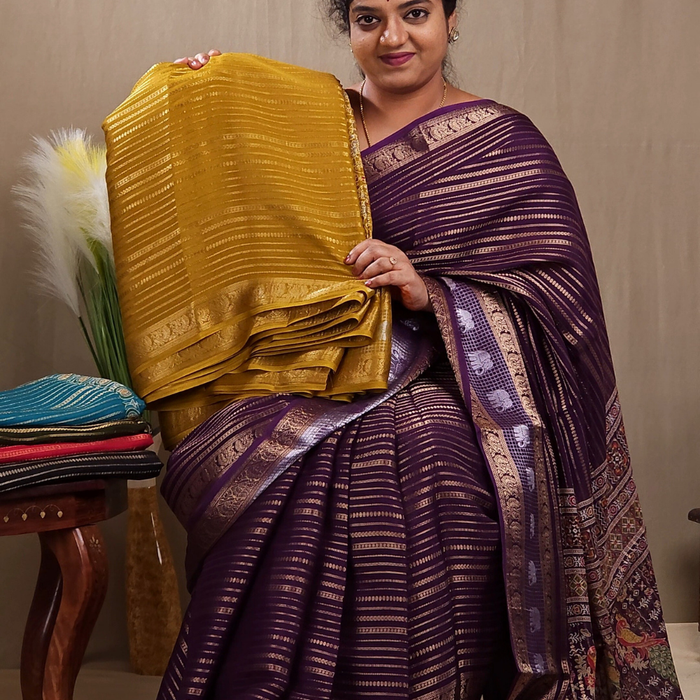 Expereience the grandeur of Georgette sarees allover zariwoven horizontal stripes with uniquely designed peacock gap borders and silver zari-woven elephant motifs, and the pallu is enriched with elegant meenakari work with peacock designs.paired with floral blouse.....