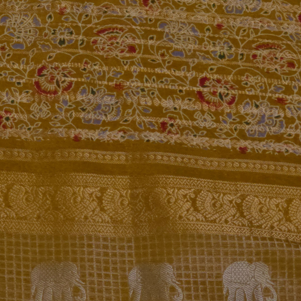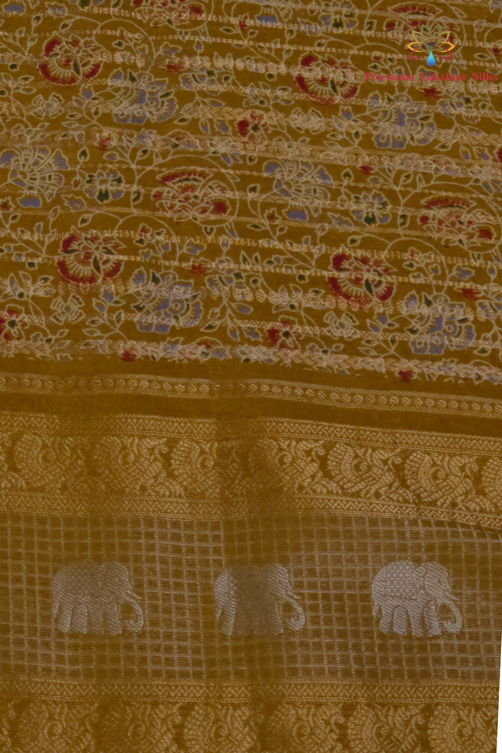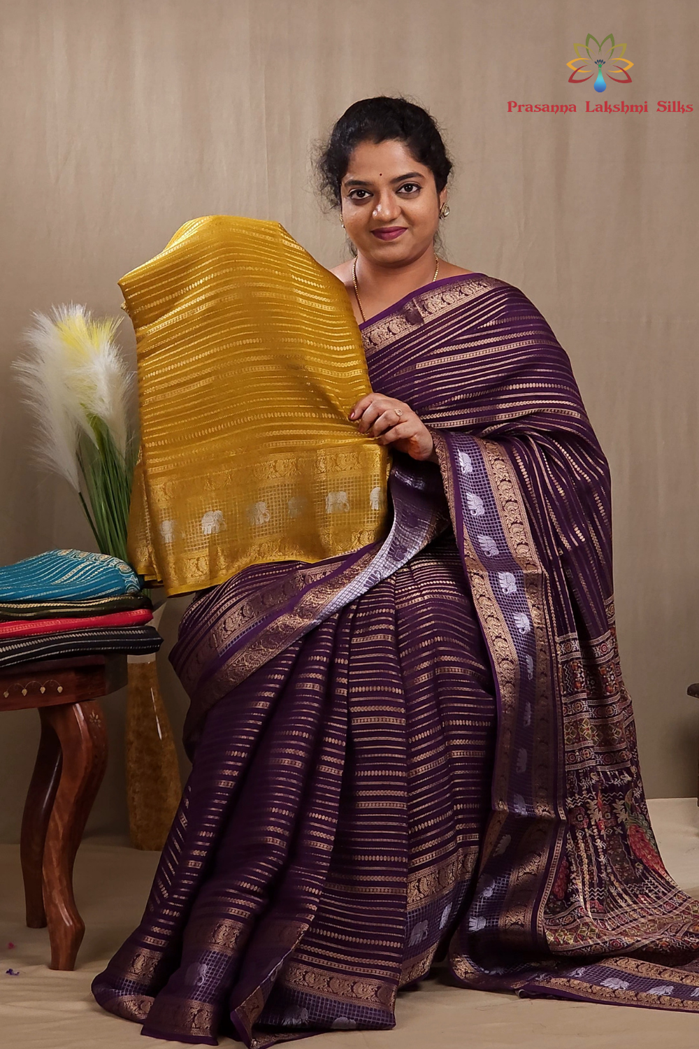 Expereience the grandeur of Georgette sarees allover zariwoven horizontal stripes with uniquely designed peacock gap borders and silver zari-woven elephant motifs, and the pallu is enriched with elegant meenakari work with peacock designs.paired with floral blouse.....