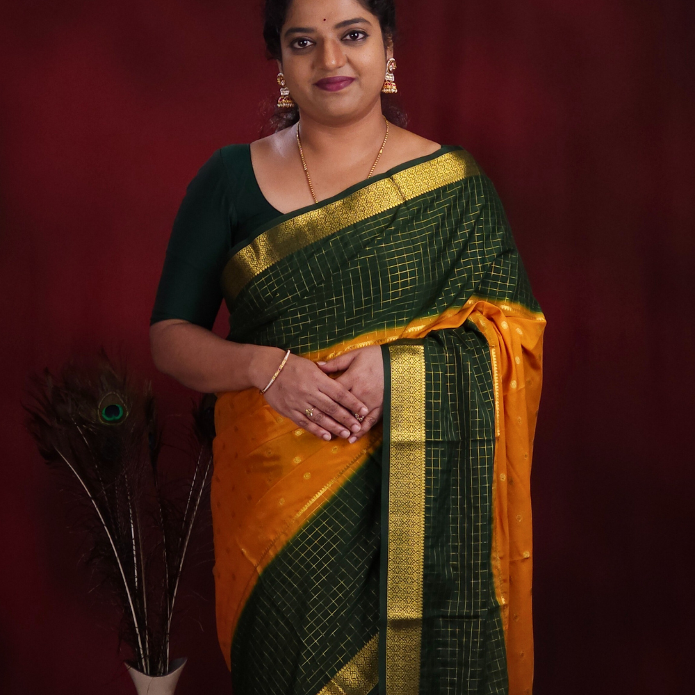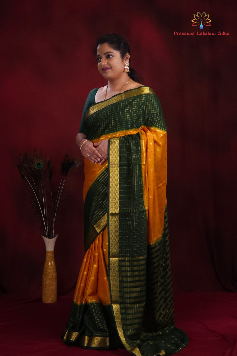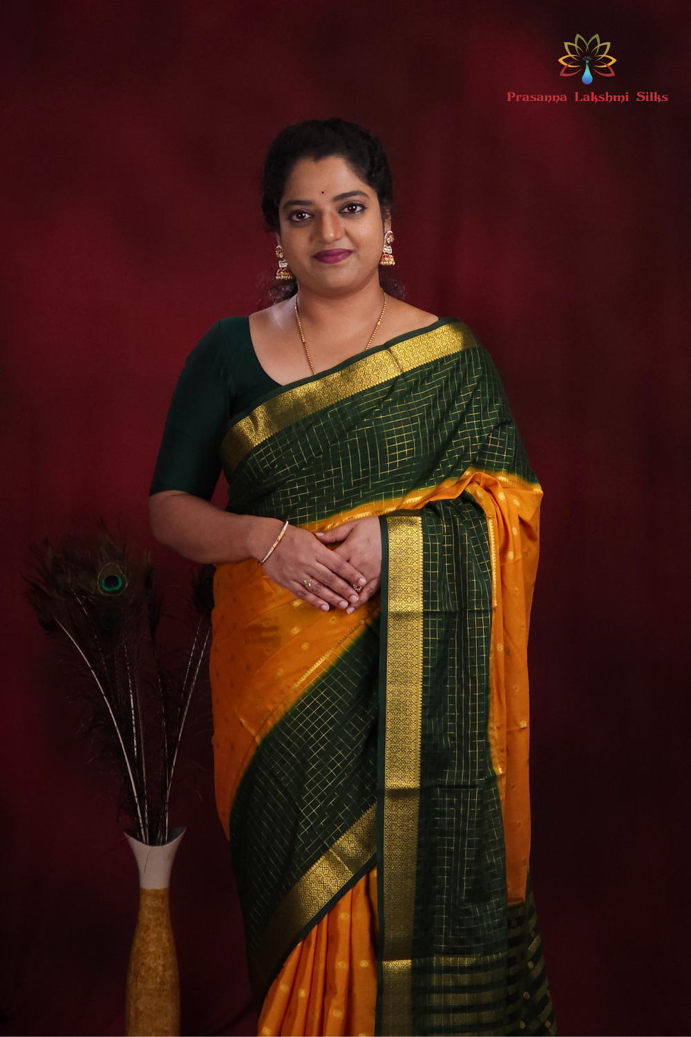 Experience the richness of Semi Mysore silk saree with zari woven motifs all over the saree, complemented by contrast checks borders, paired with contrast tissue stripe pallu and contrast blouse with zari woven motifs.....
