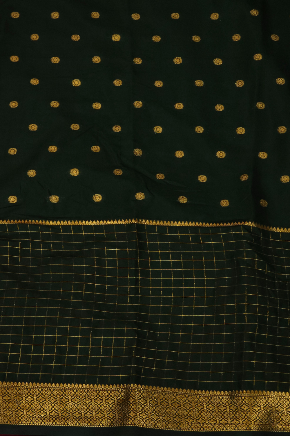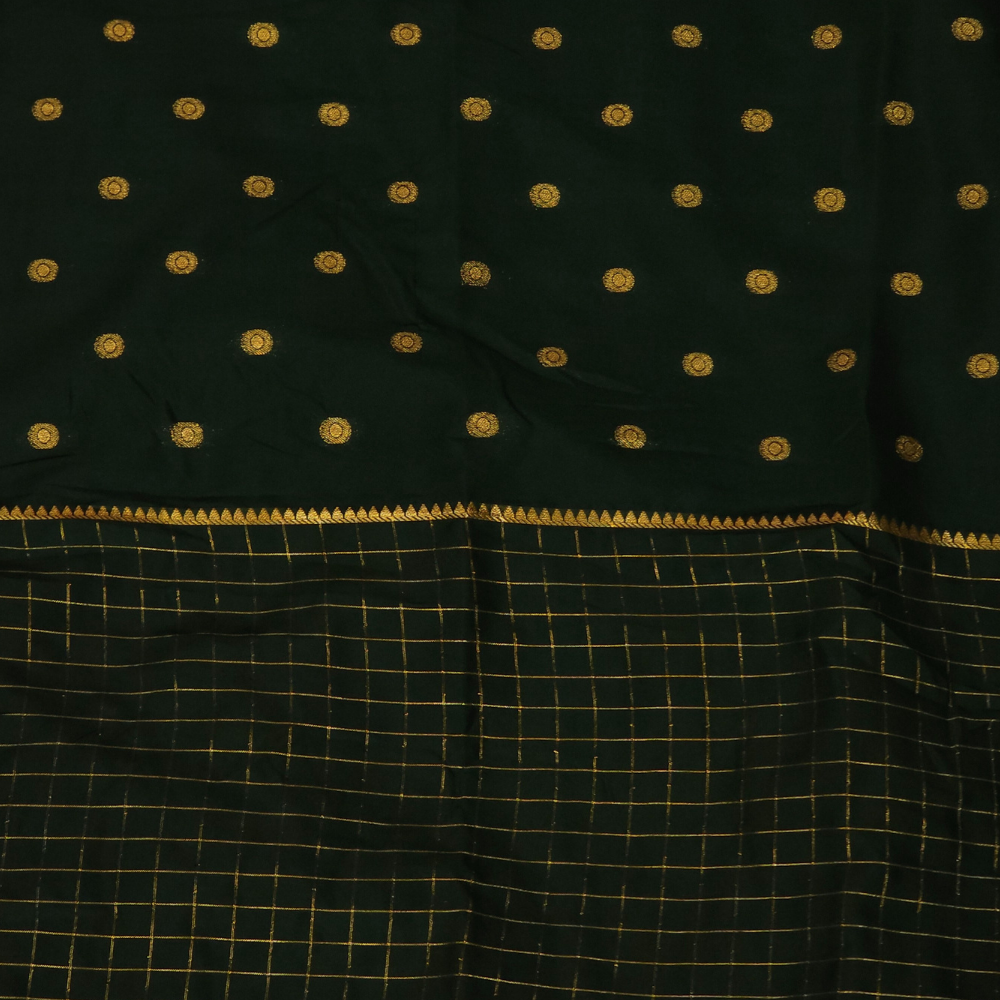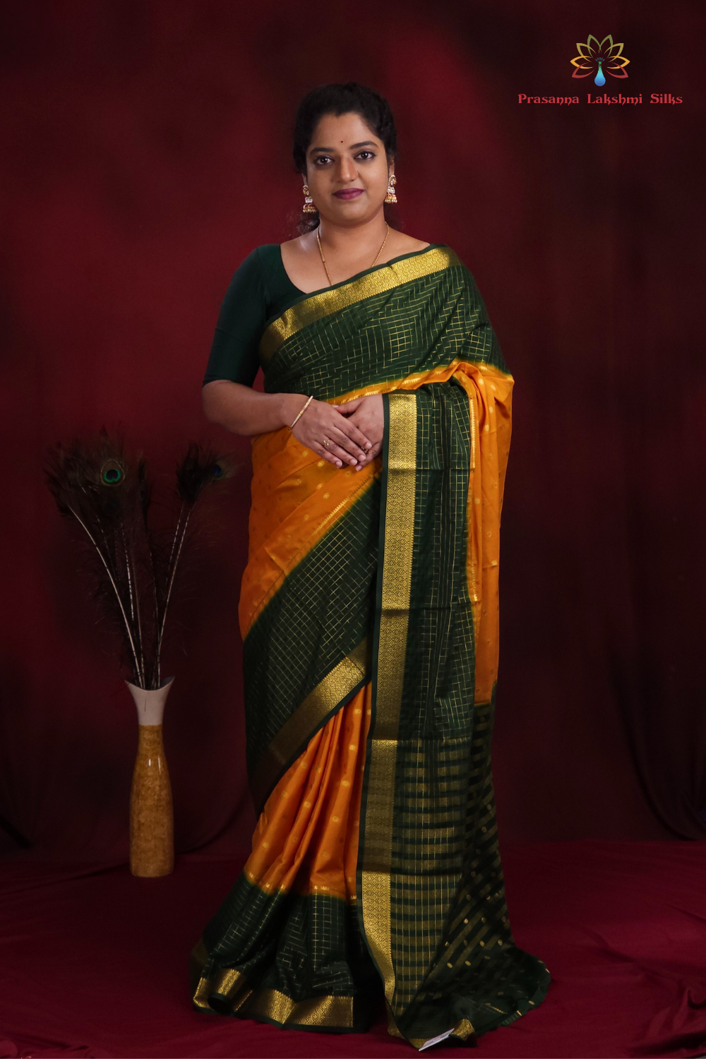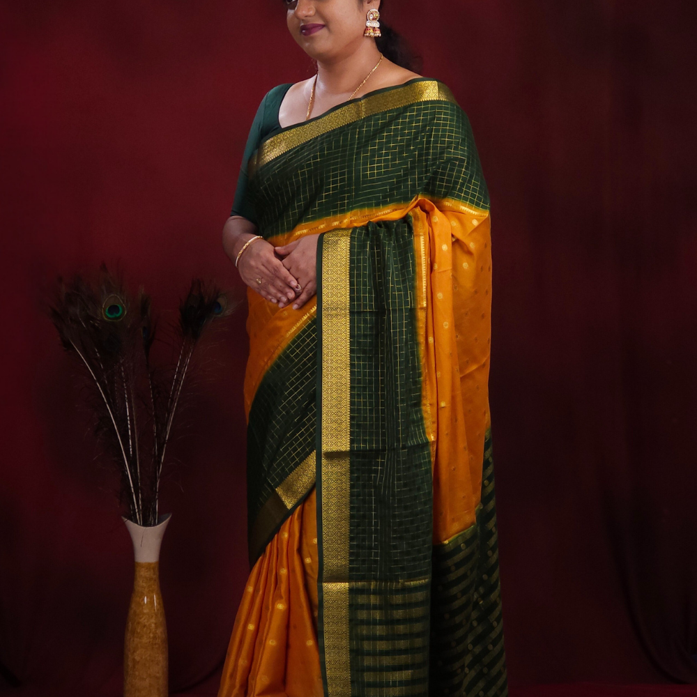 Experience the richness of Semi Mysore silk saree with zari woven motifs all over the saree, complemented by contrast checks borders, paired with contrast tissue stripe pallu and contrast blouse with zari woven motifs.....