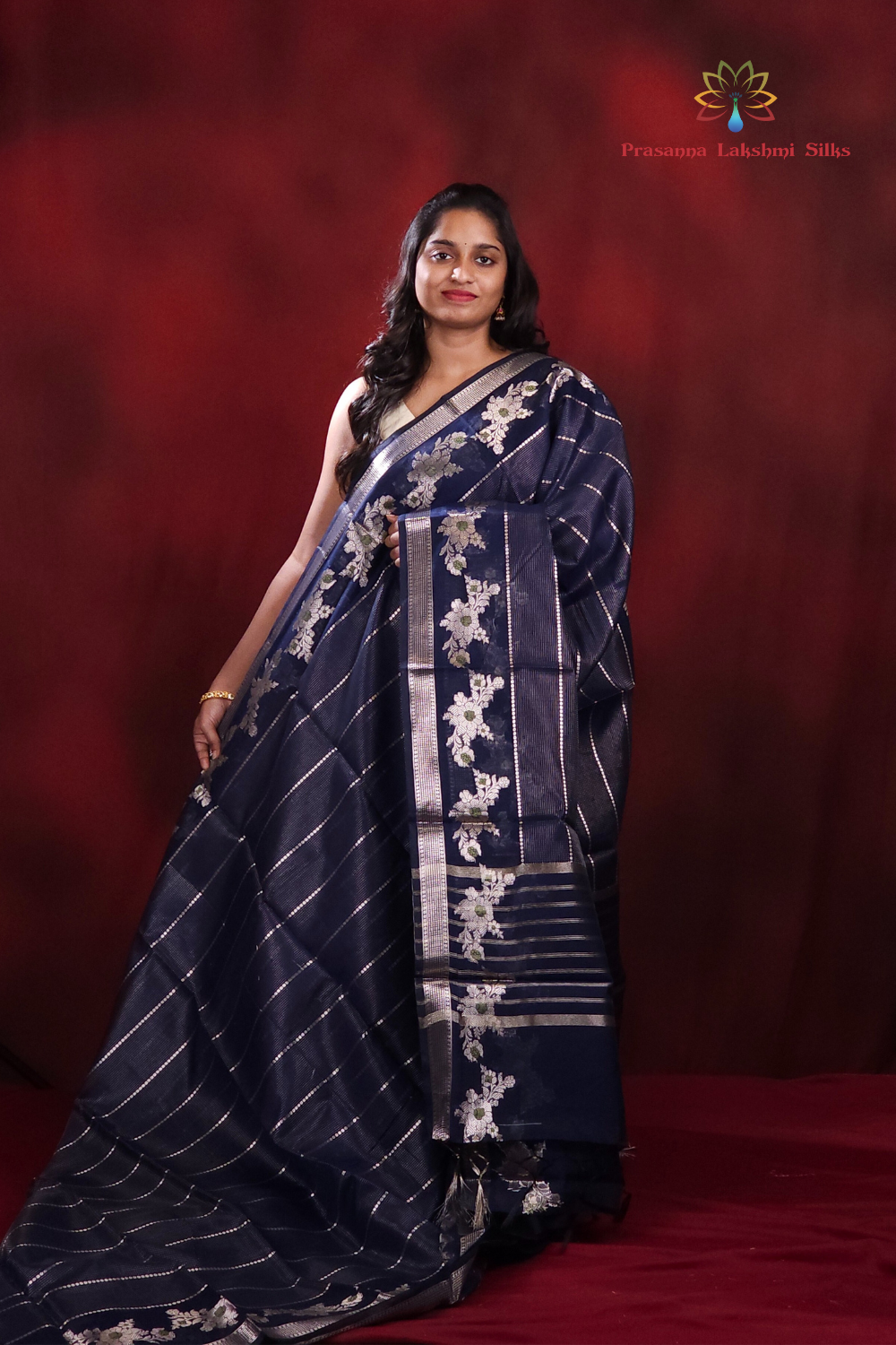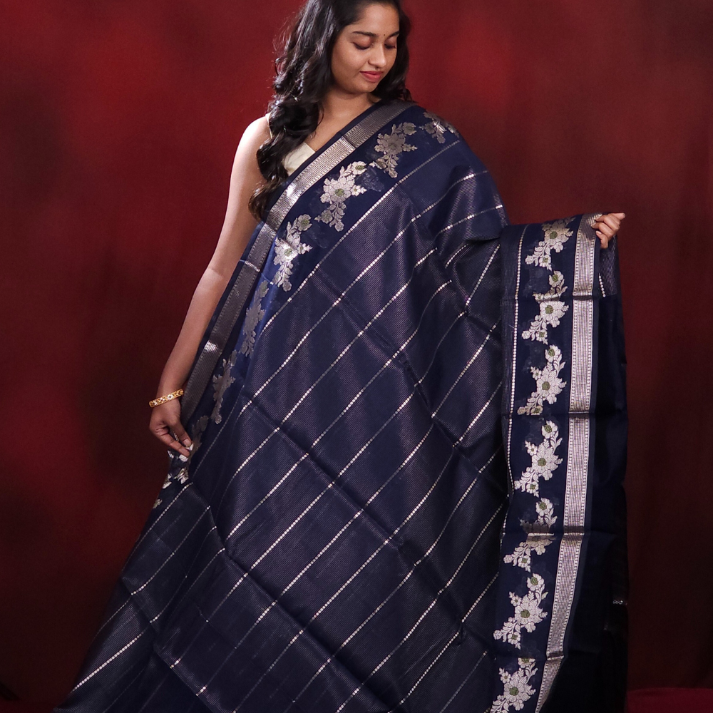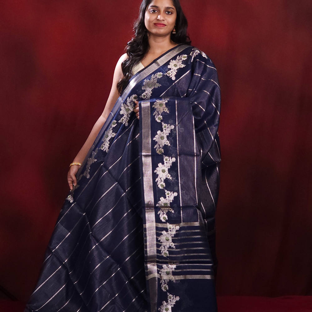 Beautiful Chanderi Saree, featuring allover horizontal zari stripes designed with a unique floral border detailing zari stripes pallu,and a running blouse