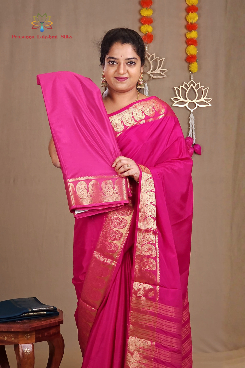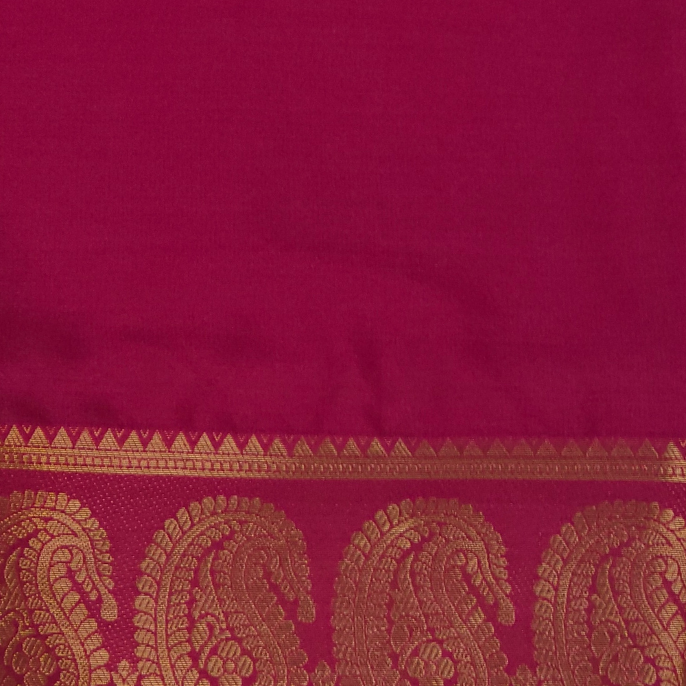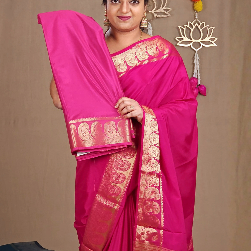Experience timeless elegance with our Semi mysore silk, beautifully crafted with zari woven mango borders. A rich brocade pallu adds to the grandeur paired with a running blouse....