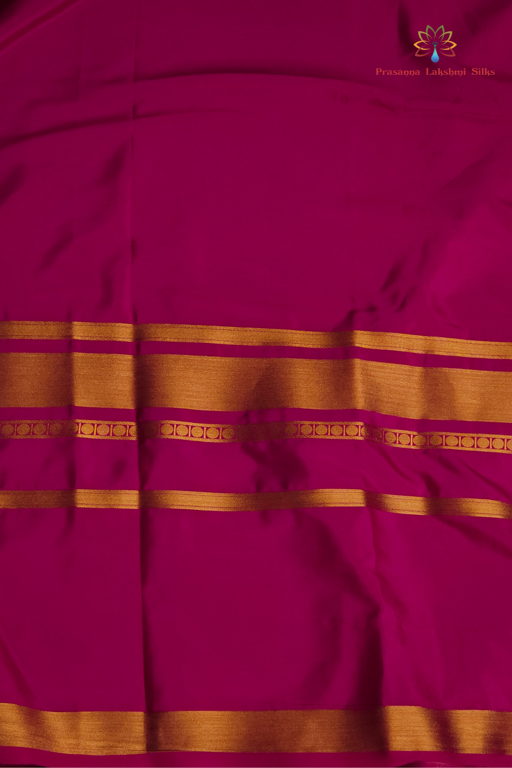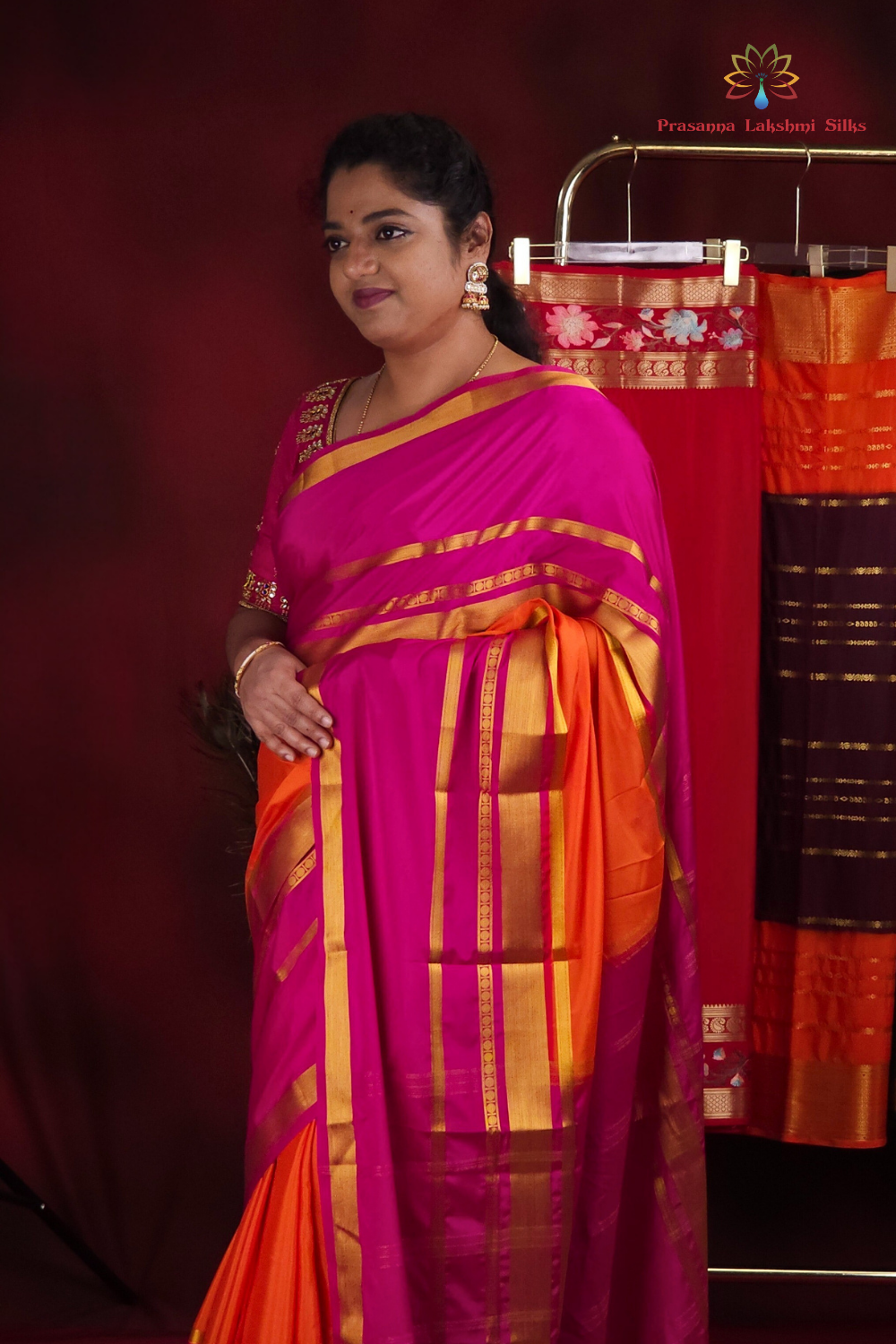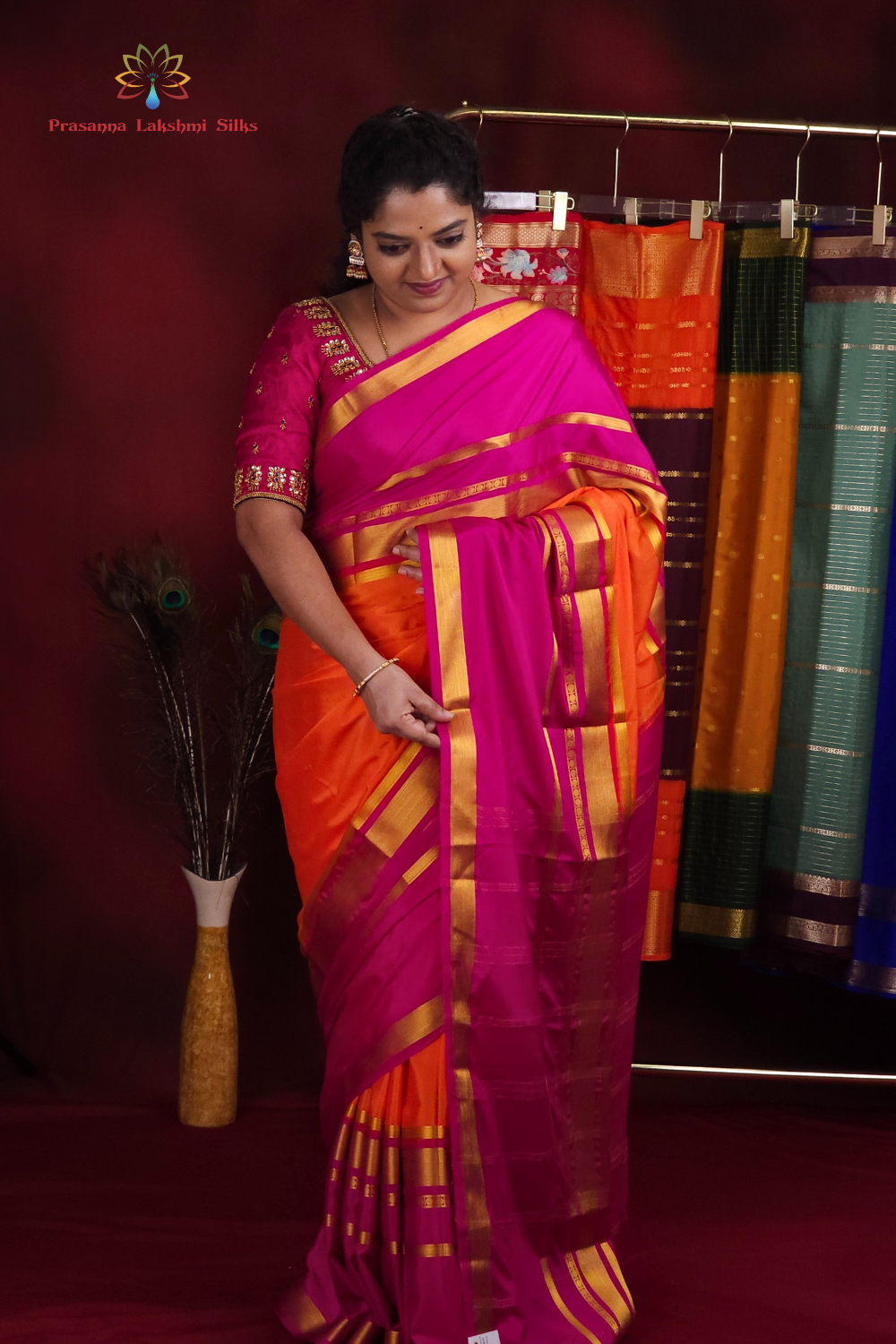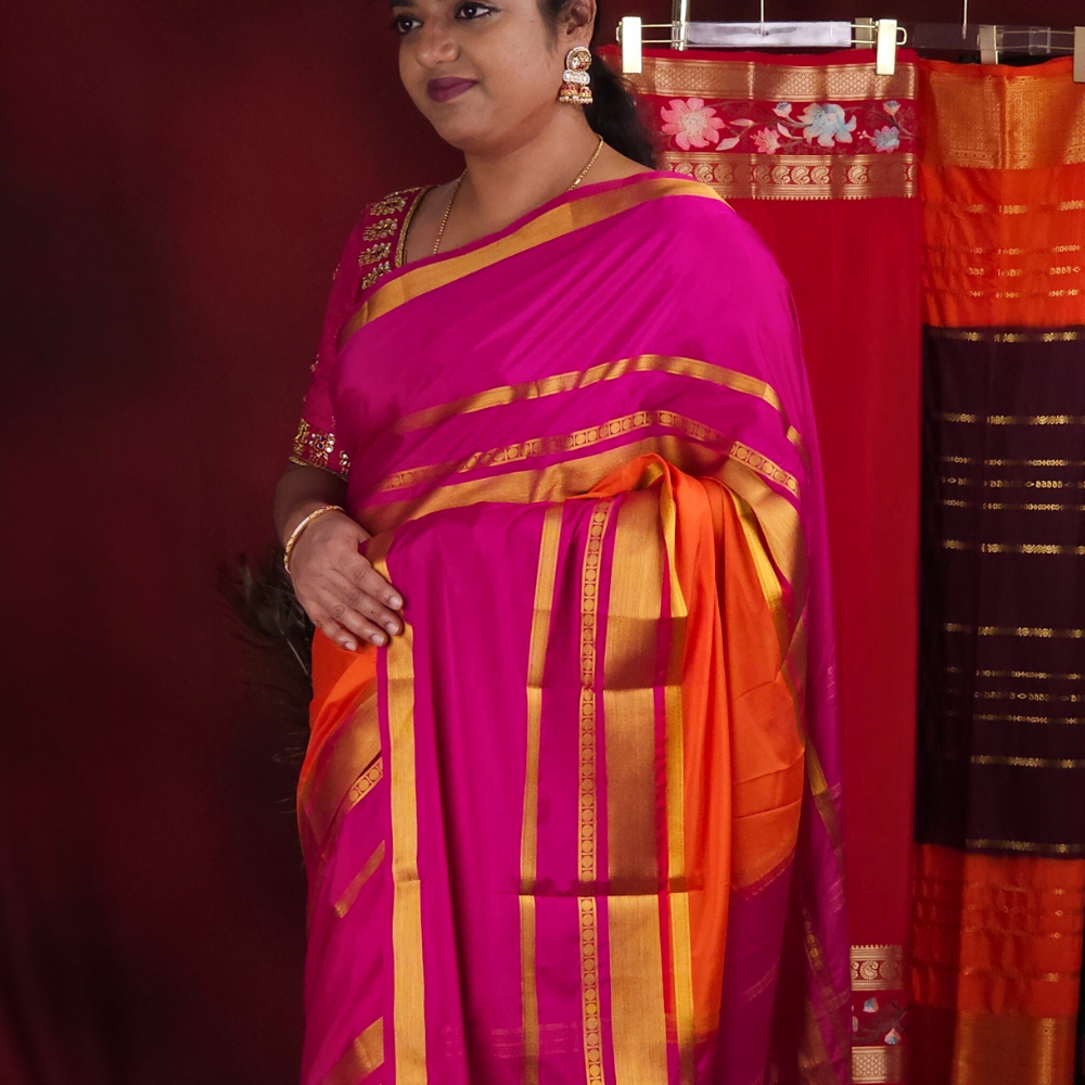 Elevate your style with this Semi Mysore silk saree with big zari woven gap borders in contrast colors.The zari stripe pallu gives it that festive richness, paired beautifully with a contrast blouse.....