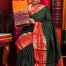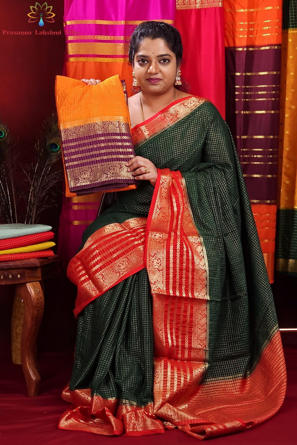 Beautiful Semi Mysore Silk Saree, featuring allover checks designed with a unique border detailing—lower side contrast lines border and a 1-inch contrast border on the upper side,The look is completed with a zari stripes pallu,and a contrast blouse