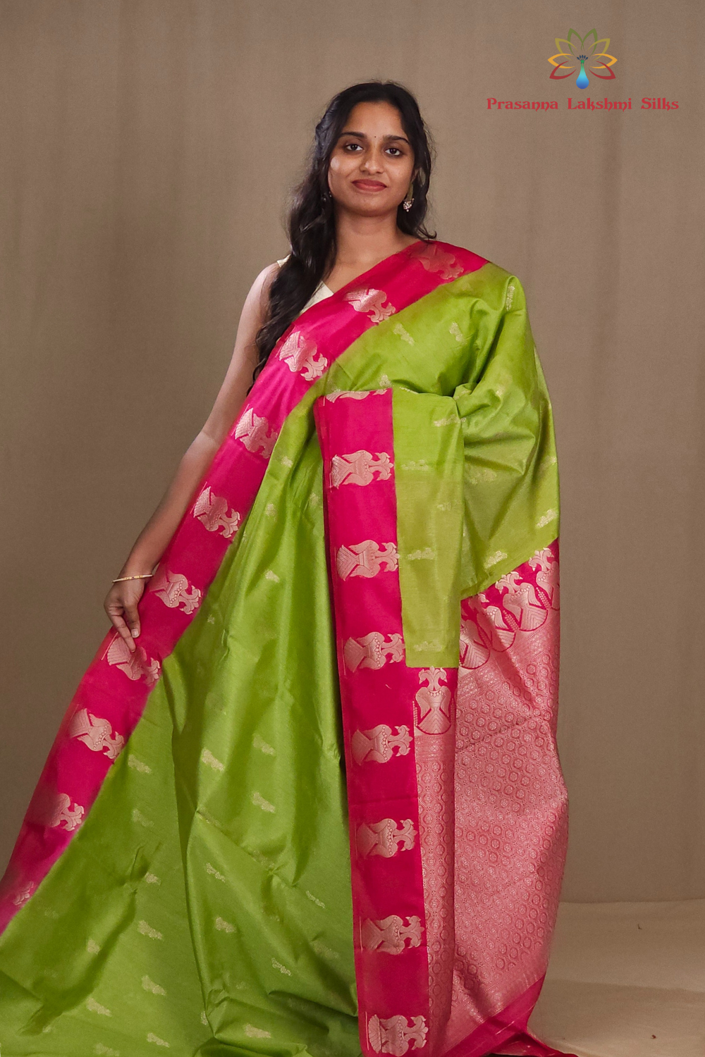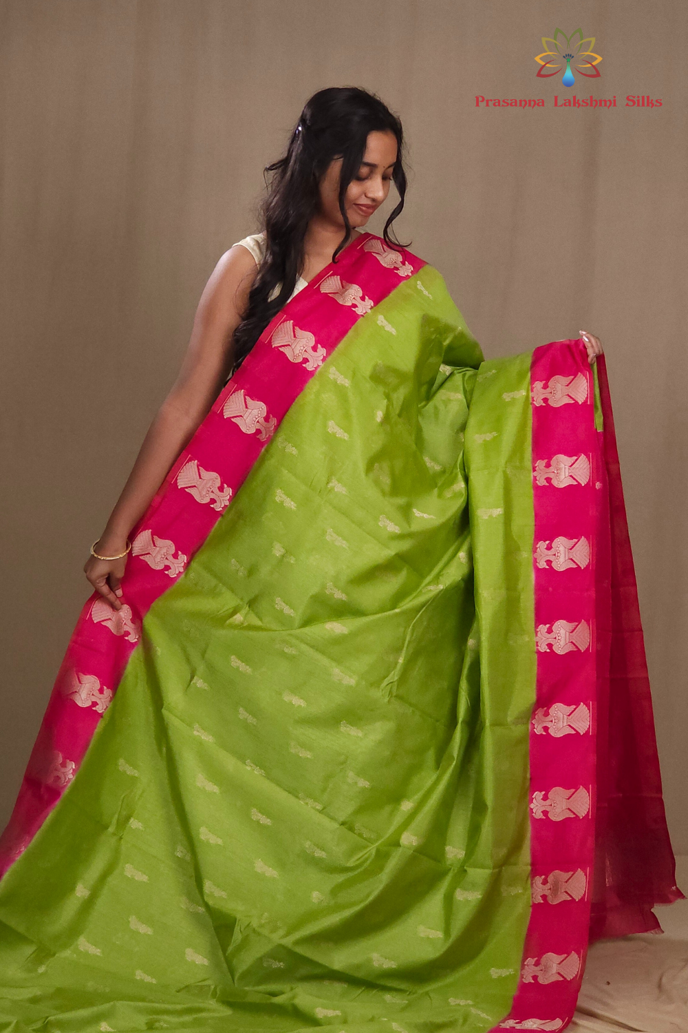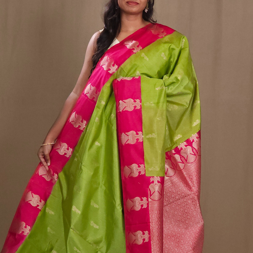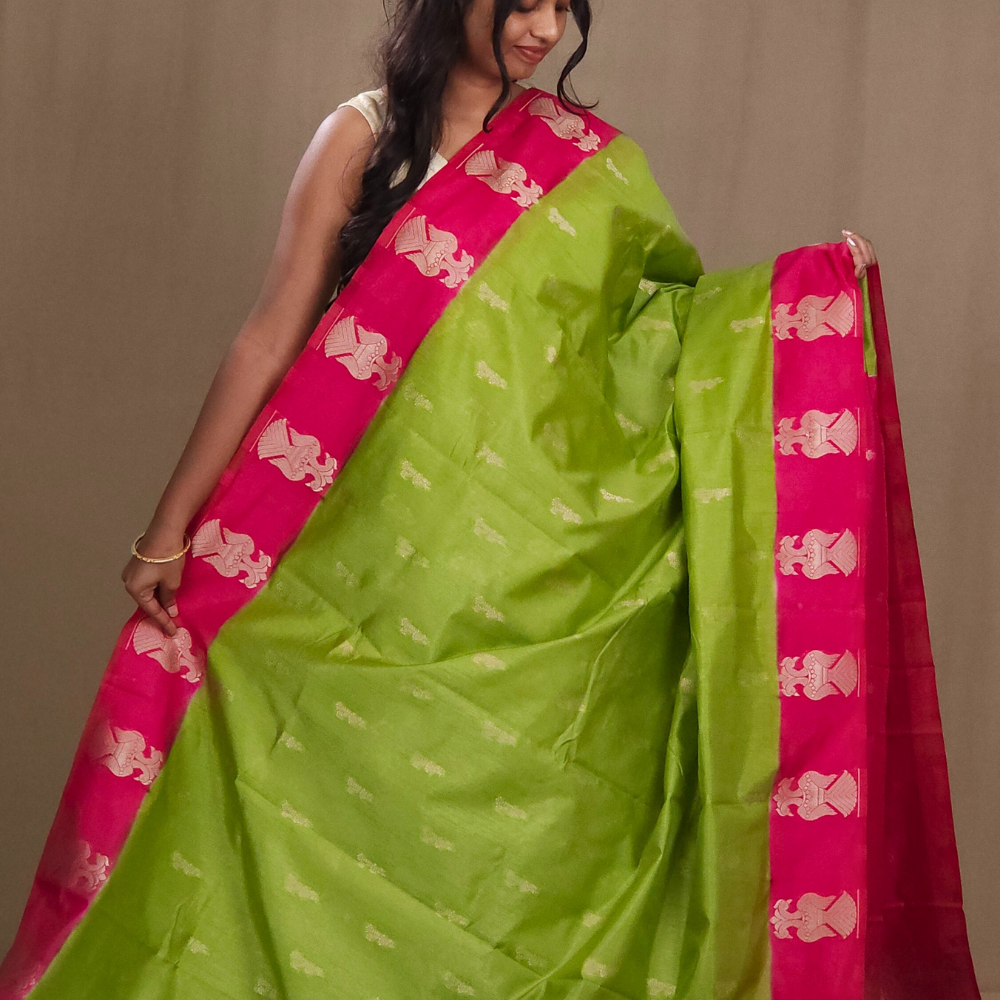 Experience the beauty of our Semi Dupion Saree, crafted with allover small zari woven motifs for a touch of elegance,unique zari-woven Peacock motifs border designs rich zari-woven pallu .Paired with contrast blouse....