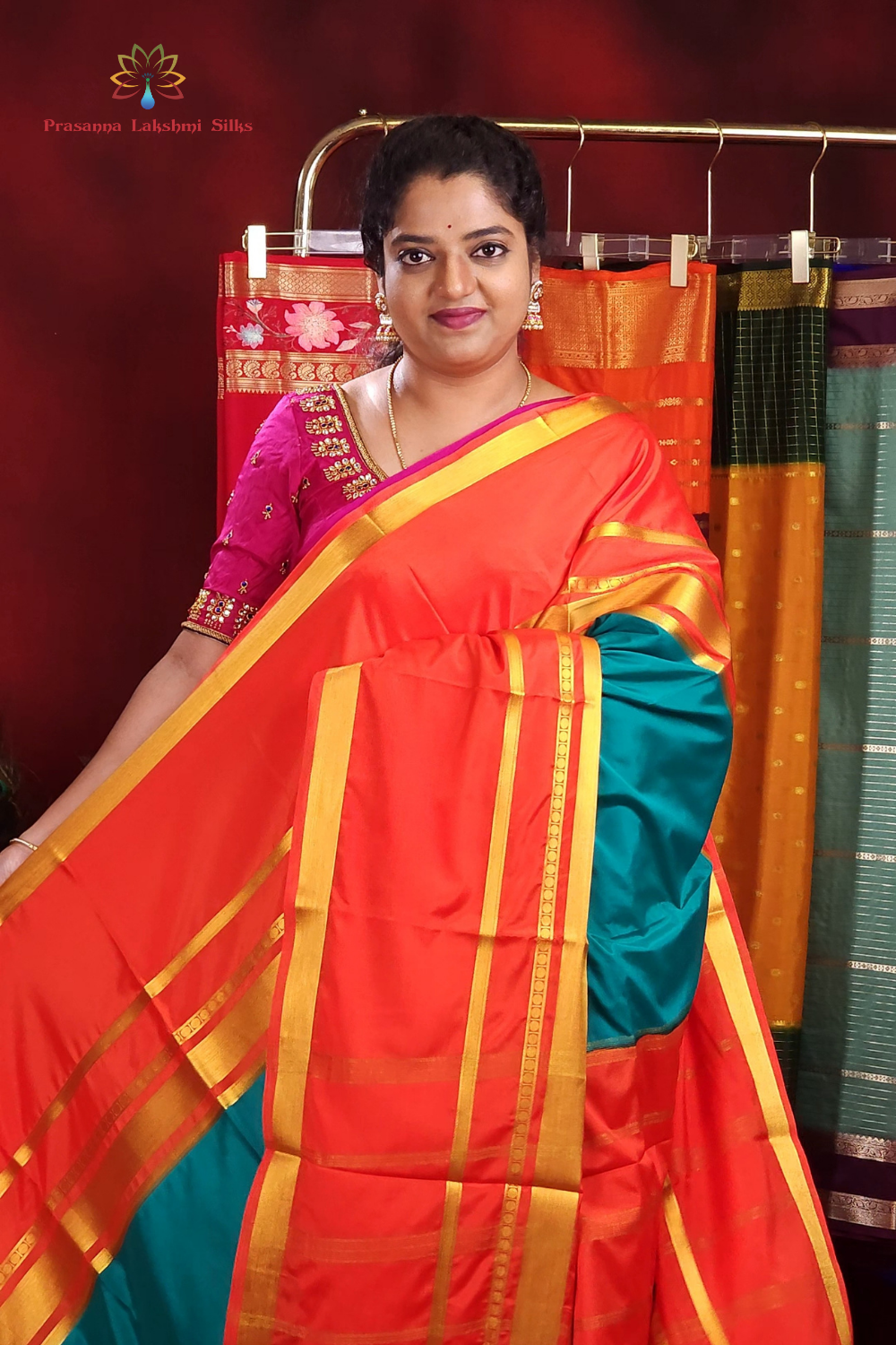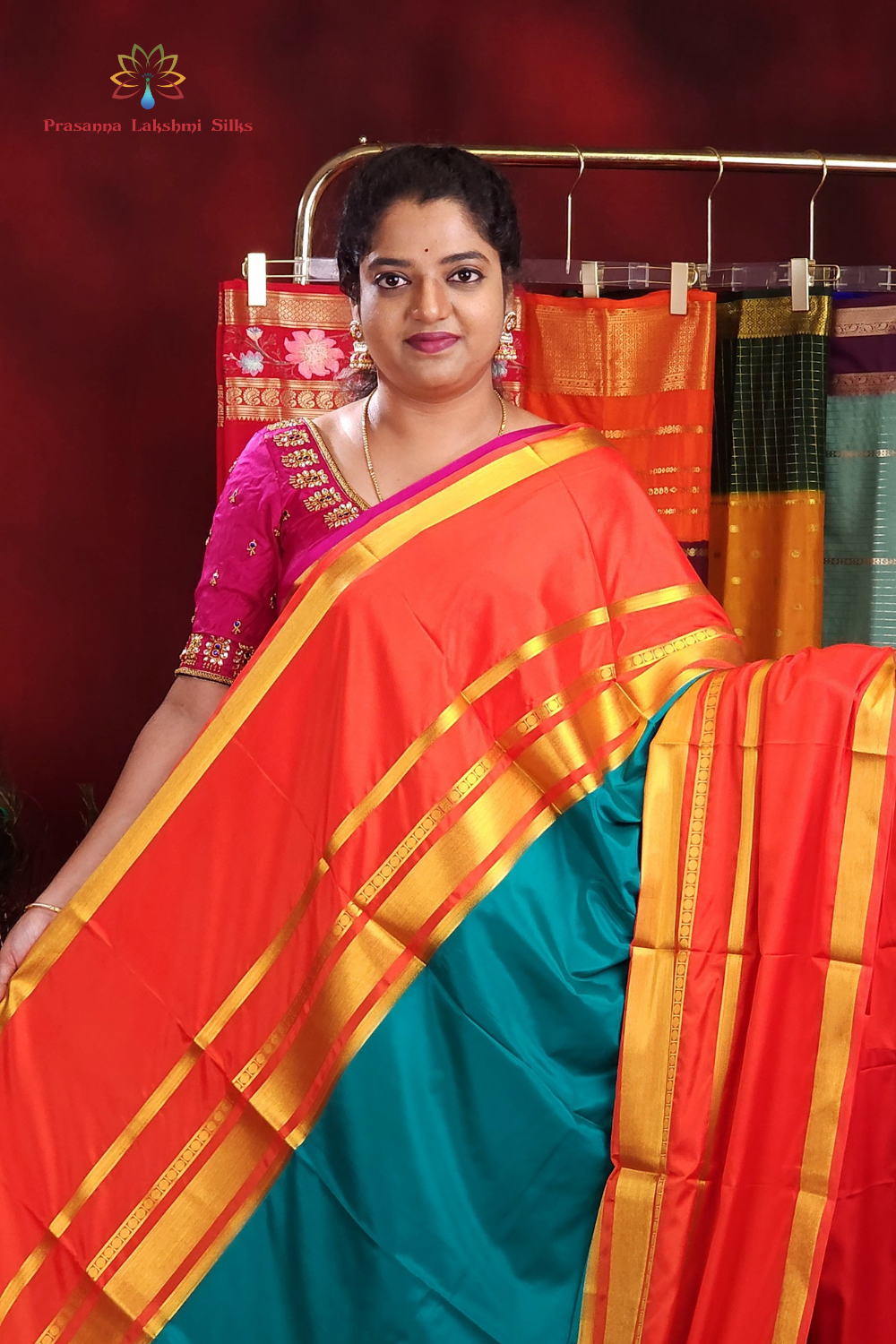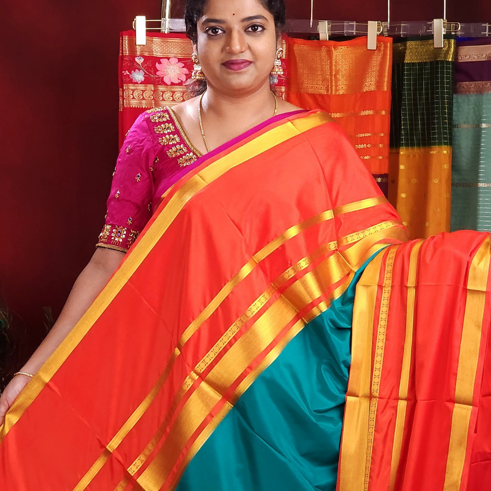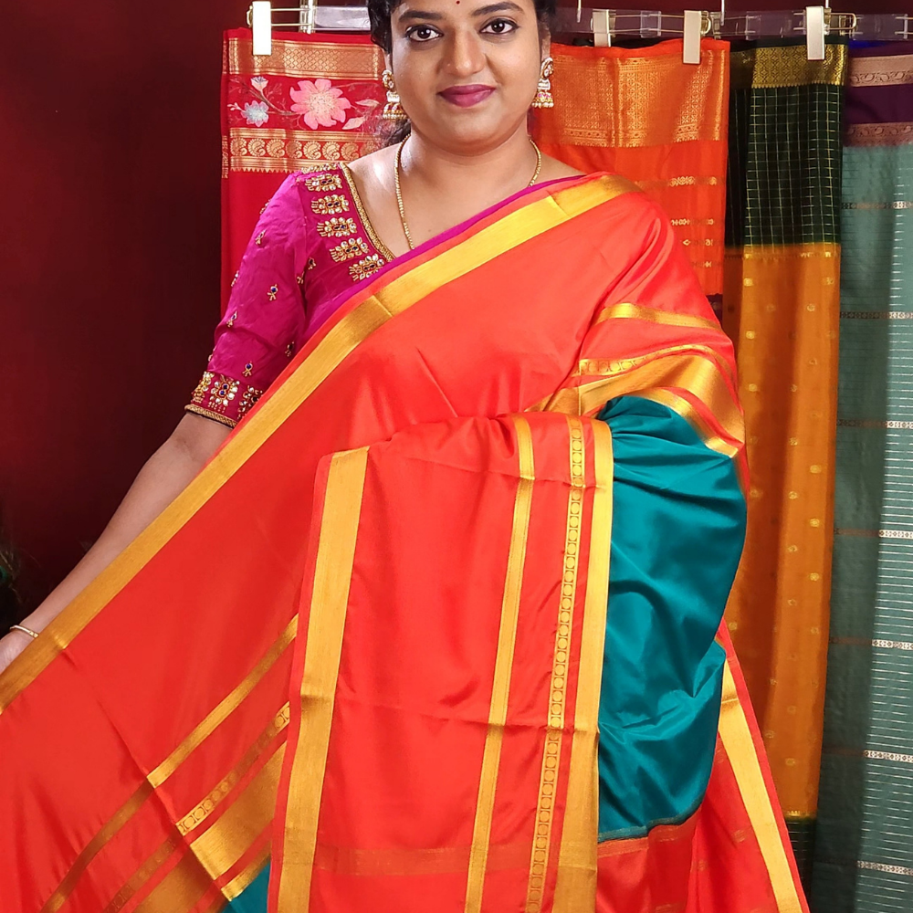 Peacock Blue and Orange Semi Mysore Silk Saree