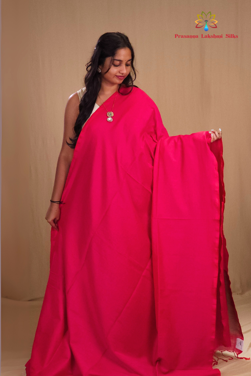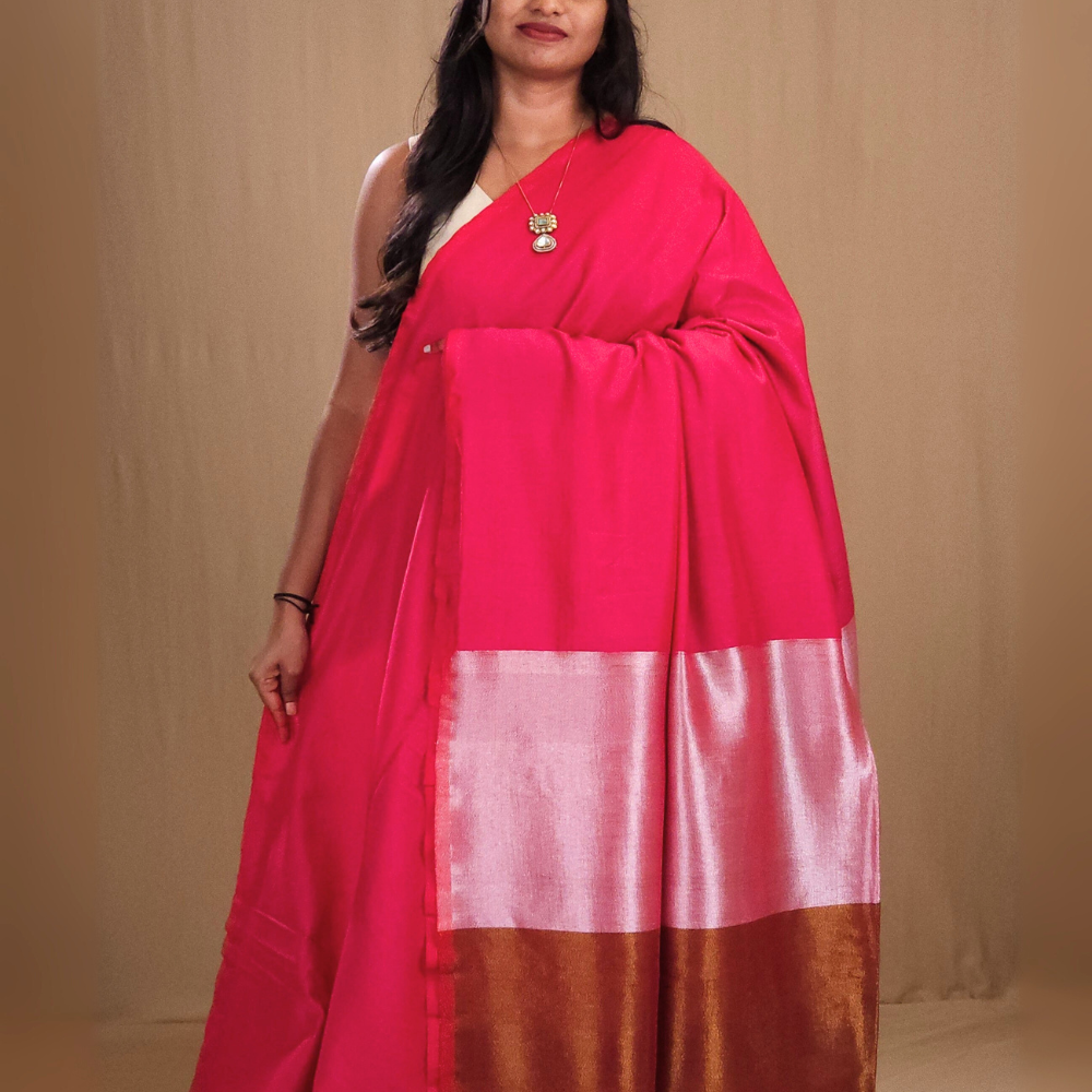 Discover the elegance of our Khadi Cotton Saree, featuring a plain body paired with contrast gold & silver pallu finished with tassels paired with a running blouse.....